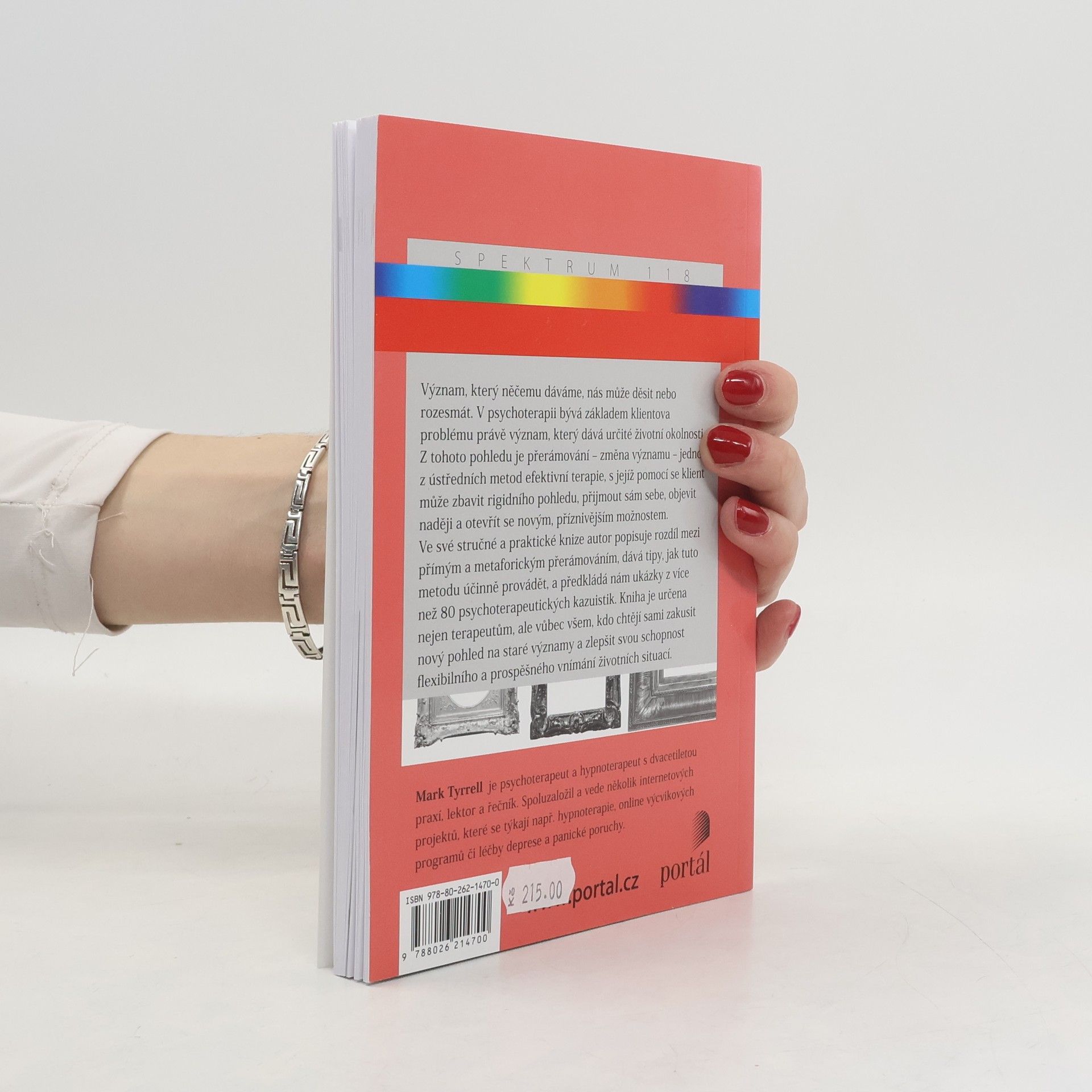 Význam, který něčemu dáváme, nás může děsit nebo rozesmávat. V psychoterapii bývá základem klientova problému právě význam, který klient dává určité životní okolnosti. Z tohoto pohledu je přerámování – změna významu – jednou z ústředních metod efektivní terapie, s jejíž pomocí se klient může zbavit rigidního pohledu, přijmout sám sebe, objevit naději a otevřít se novým, příznivějším možnostem. Ve své stručné a praktické knize autor popisuje rozdíl mezi přímým a metaforickým přerámováním, dává tipy, jak tuto metodu účinně provádět, a předkládá nám ukázky z více než 80 psychoterapeutických kazuistik. Kniha je určena nejen terapeutům, ale vůbec všem, kdo chtějí sami zakusit nový pohled na staré významy a zlepšit svou schopnost flexibilního a prospěšného vnímání životních situací. Mark Tyrrell je psychoterapeut a hypnoterapeut s dvacetiletou praxí, lektor a řečník. Spoluzaložil a vede několik internetových projektů, které se týkají např. hypnoterapie, online výcvikových programů či léčby deprese a panické poruchy.