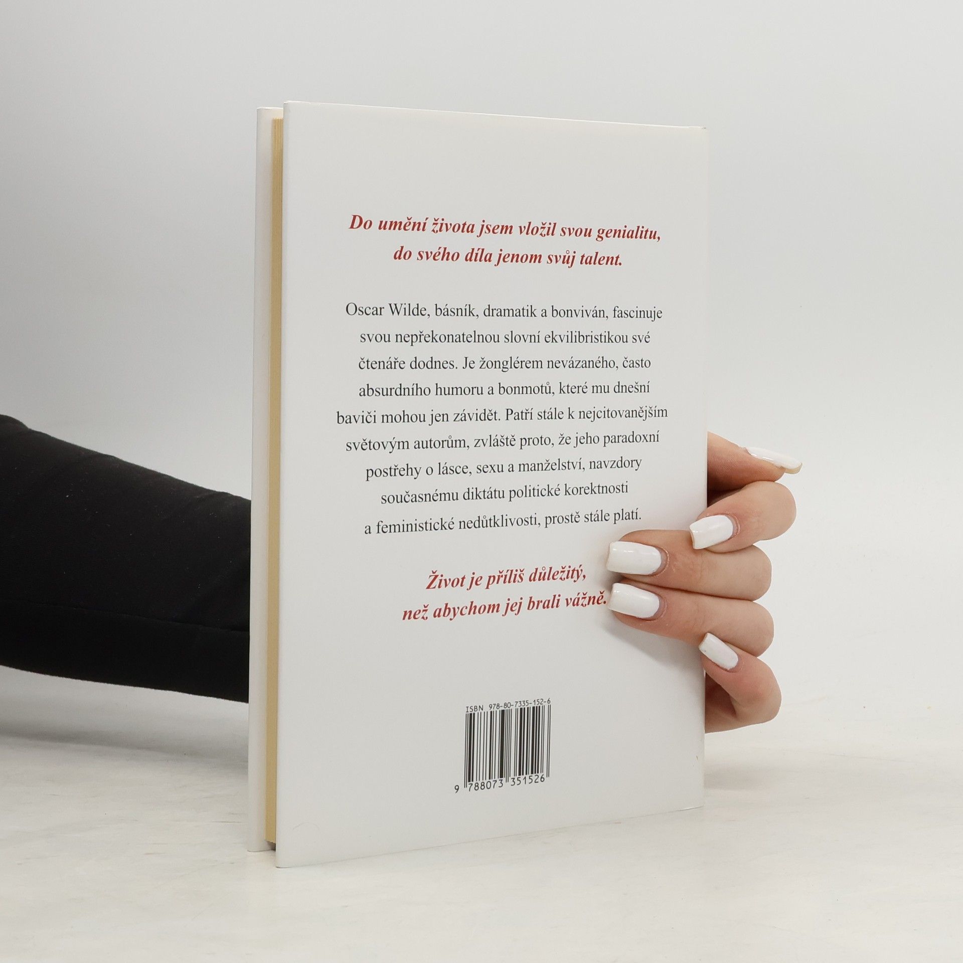 Oscar Wilde (1854 - 1900), básník, dramatik a bonviván, fascinuje svou nepřekonatelnou slovní ekvilibristikou své čtenáře dodnes. Je žonglérem nevázaného, často absurdního humoru a bonmotů, které mu dnešní baviči mohou jen závidět. Patří stále k nejcitovanějším světovým autorům, zvláště proto, že jeho paradoxní postřehy o lásce, sexu a manželství, navzdory současnému diktátu politické korektnosti a feministické nedůtklivosti, prostě stále platí. "Do umění života jsem vložil svou genialitu, do svého díla jenom svůj talent." "Život je příliš důležitý, než abychom jej brali vážně." Kromě bonmotů a průpovědí, jejichž výběr přináší tato kniha, patří k nejslavnějším ze spisovatelových děl jeho jediný román Obraz Doriana Graye, divadelní hry Salome, Ideální manžel a Jak je důležité míti Filipa a také pohádky (např. Šťastný princ a jiné pohádky).