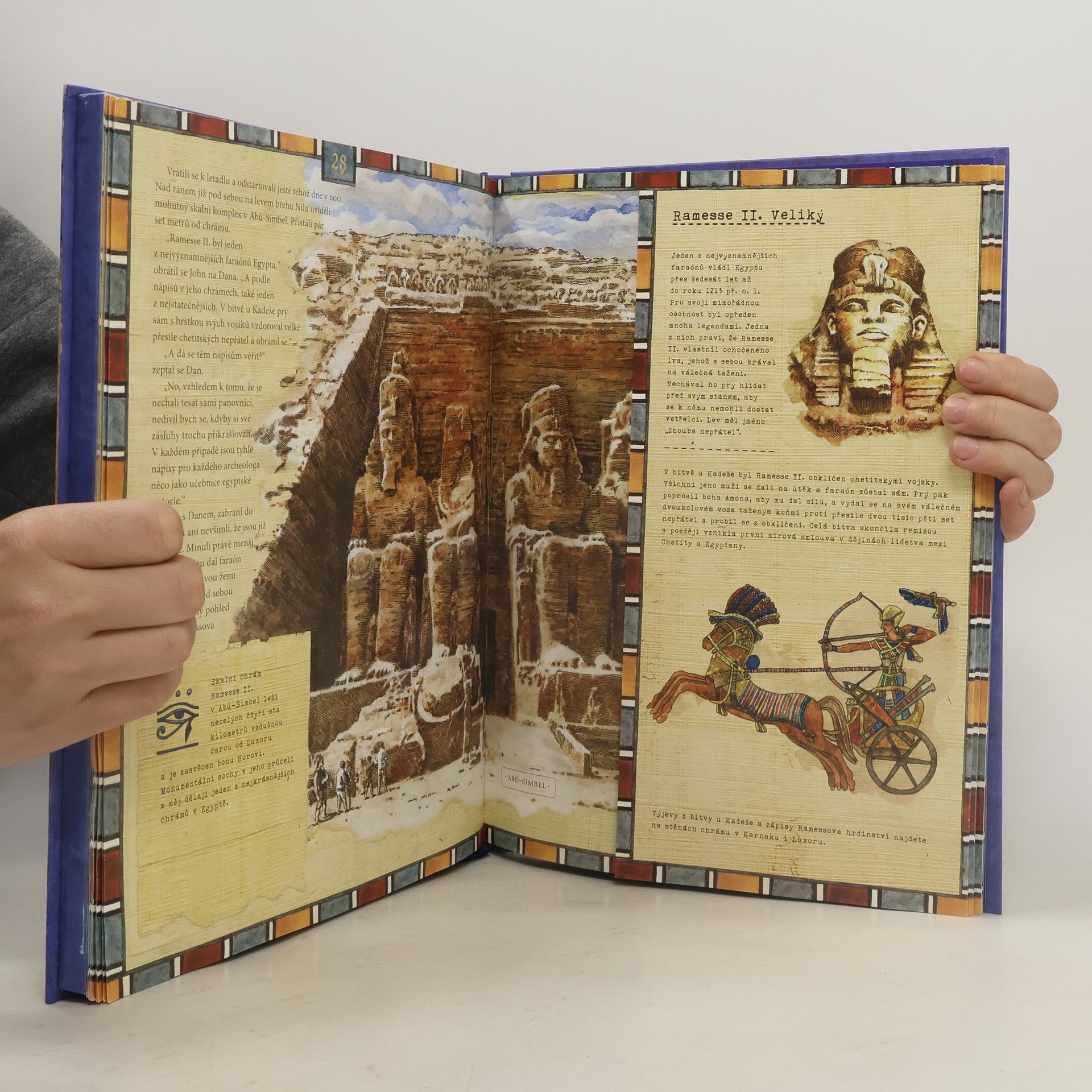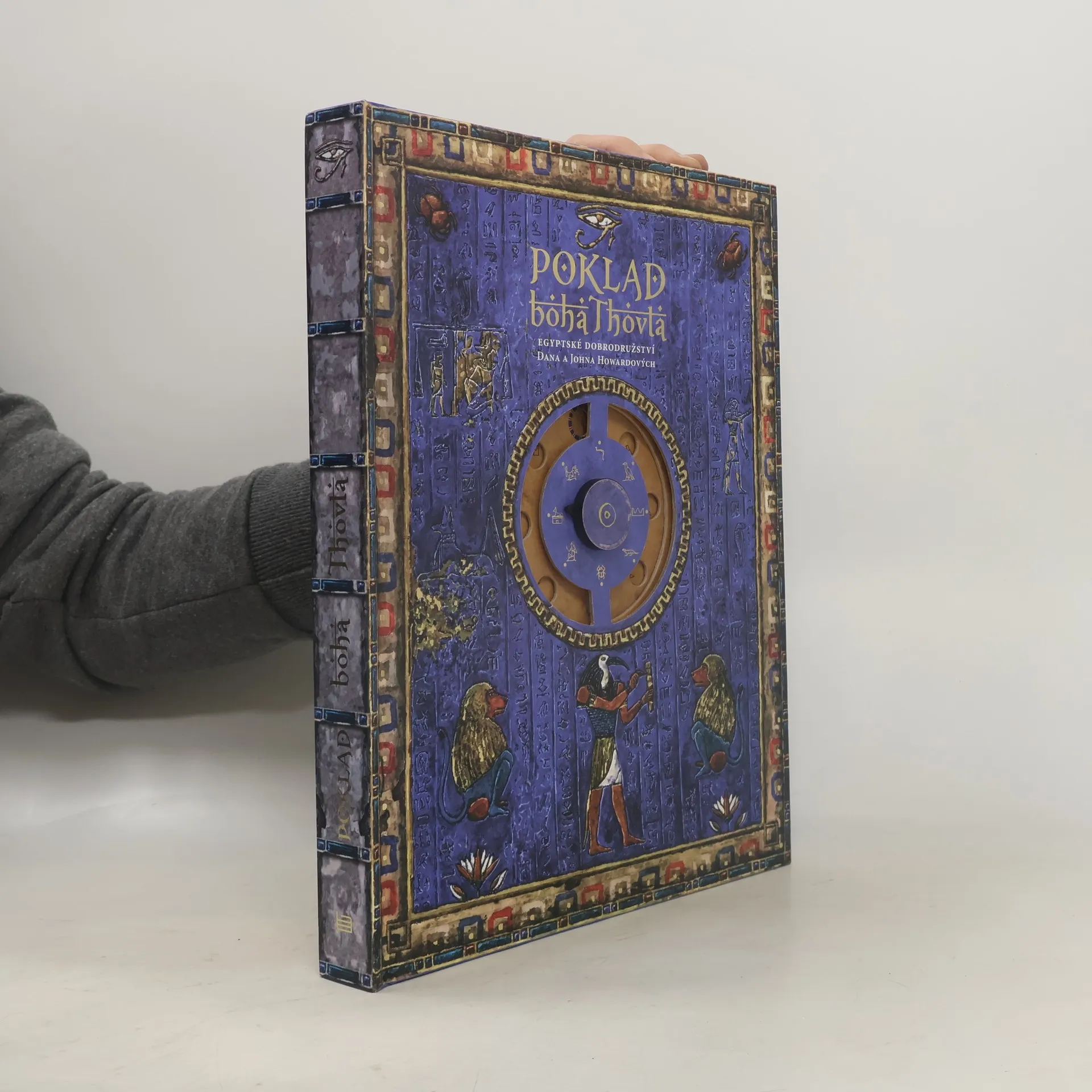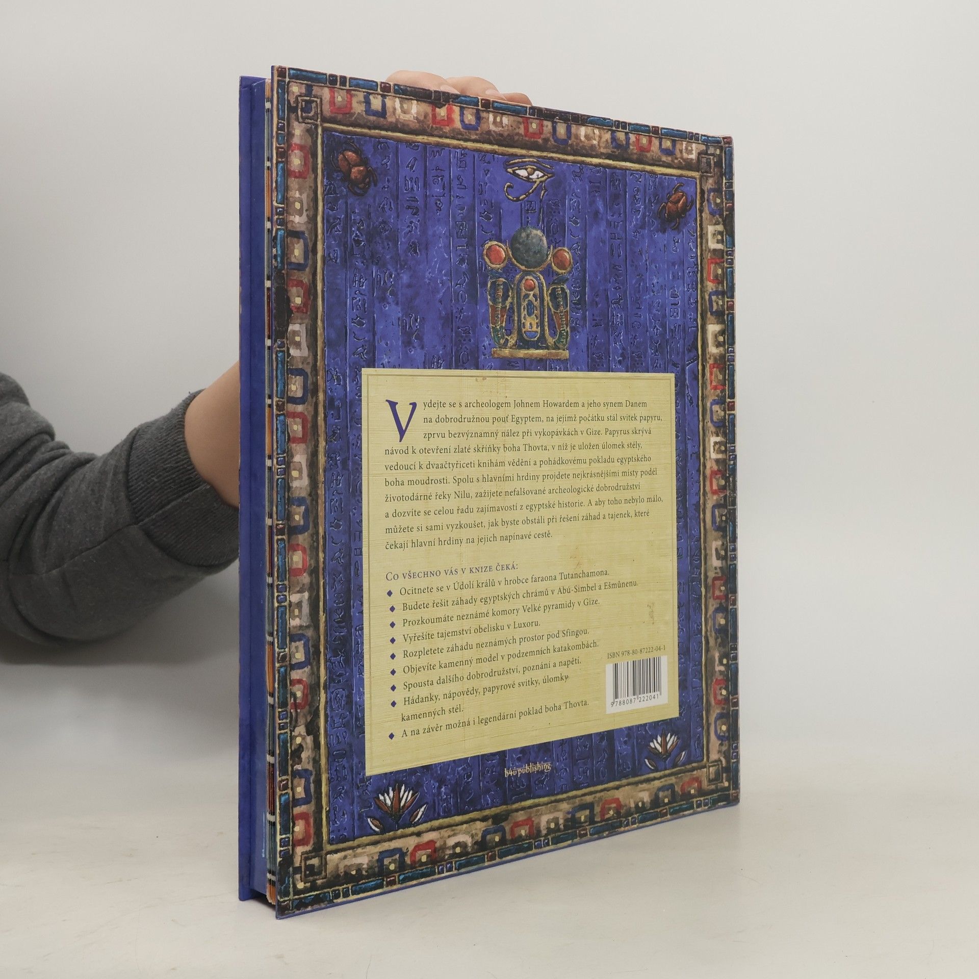 Výpravná dobrodružná kniha pro děti od deseti let. Vydejte se s archeologem Johnem Howardem a jeho synem Danem na dobrodružnou pouť Egyptem, na jejímž počátku stál svitek papyru, zprvu bezvýznamný nález při vykopávkách v Gize. Papyrus skrývá návod k otevření zlaté skříňky boha Thovta, v níž je uložen úlomek stély, vedoucí k dvaačtyřiceti knihám vědění a pohádkovému pokladu egyptského boha moudrosti. Spolu s hlavními hrdiny projdete nejkrásnějšími místy podél životodárné řeky Nilu, zažijete nefalšované archeologické dobrodružství a dozvíte se celou řadu zajímavostí z egyptské historie. A aby toho nebylo málo, můžete si sami vyzkoušet, jak byste obstáli při řešení záhad a tajenek, které čekají hlavní hrdiny na jejich napínavé cestě. Co všechno vás v knize čeká: o Ocitnete se v Údolí králů v hrobce faraona Tutanchamona o Budete řešit záhady egyptských chrámů v Abú-Simbel a Ešmůnenu. o Prozkoumáte neznámé komory Velké pyramidy v Gize. o Vyřešíte tajemství obelisku v Luxoru. o Rozpletete záhadu neznámých prostor pod Sfingou. o Objevíte kamenný model v podzemních katakombách. o Spousta dalšího dobrodružství, poznání a napětí. o Hádanky, nápovědy, papyrové svitky, úlomky kamenných stél. o A na závěr možná i legendární poklad boha Thovta.