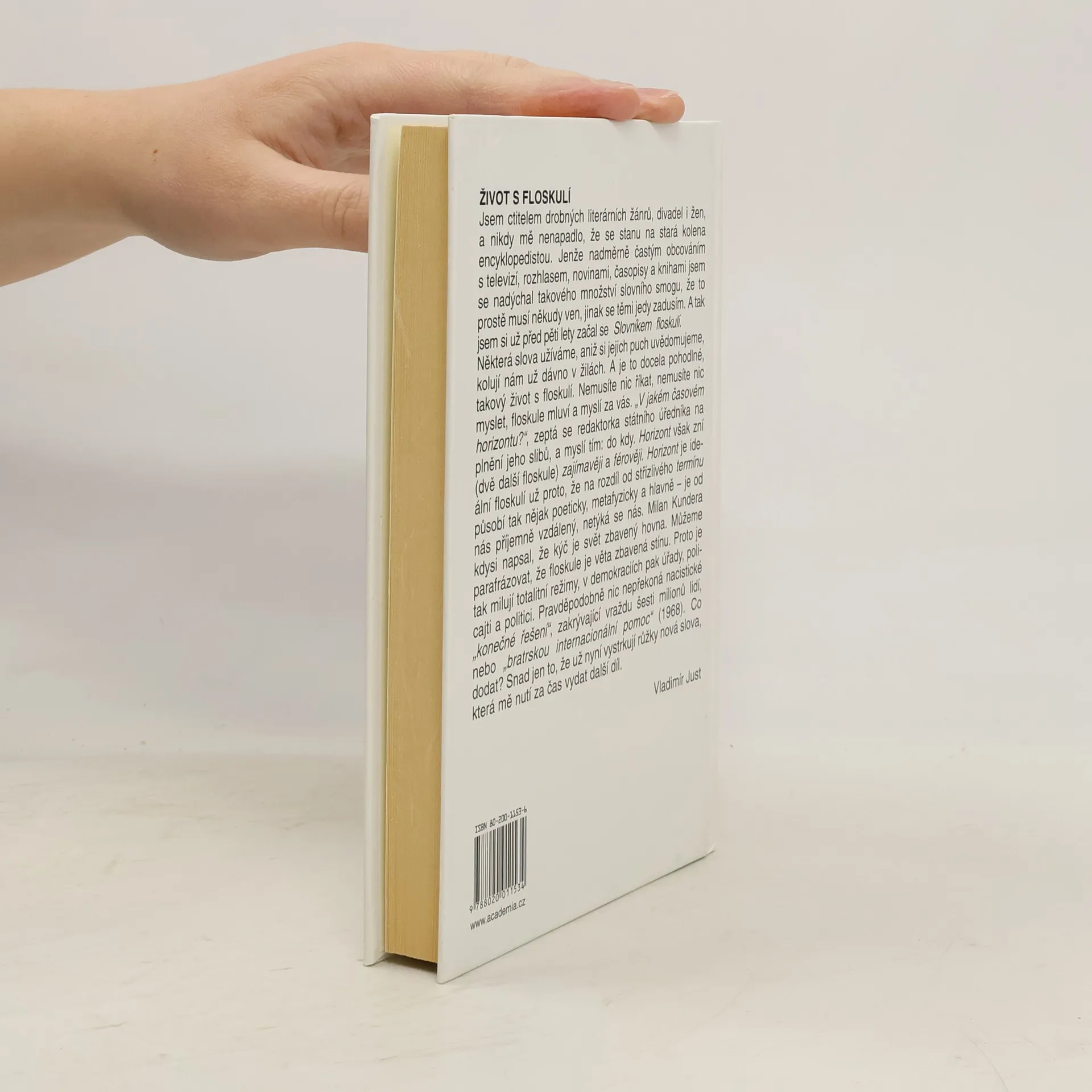 Malá encyklopedie polistopadového newspeaku: klišé, slogany, hantýrky, tiky, partiové metafory, slovní smogy. Vladimír Just se častým obcováním s televizí, rozhlasem, novinami a časopisy nadýchal takového množství slovního smogu, že před pěti lety začal psát Slovník floskulí. „V jakém časovém horizontu?“, zeptá se redaktorka úředníka a myslí tím: dokdy. Nemusíte nic říkat, nemusíte si nic myslet – floskule mluví a myslí za vás. Proto je tak milují totalitní režimy, v demokraciích pak úřady, policajti a politici.