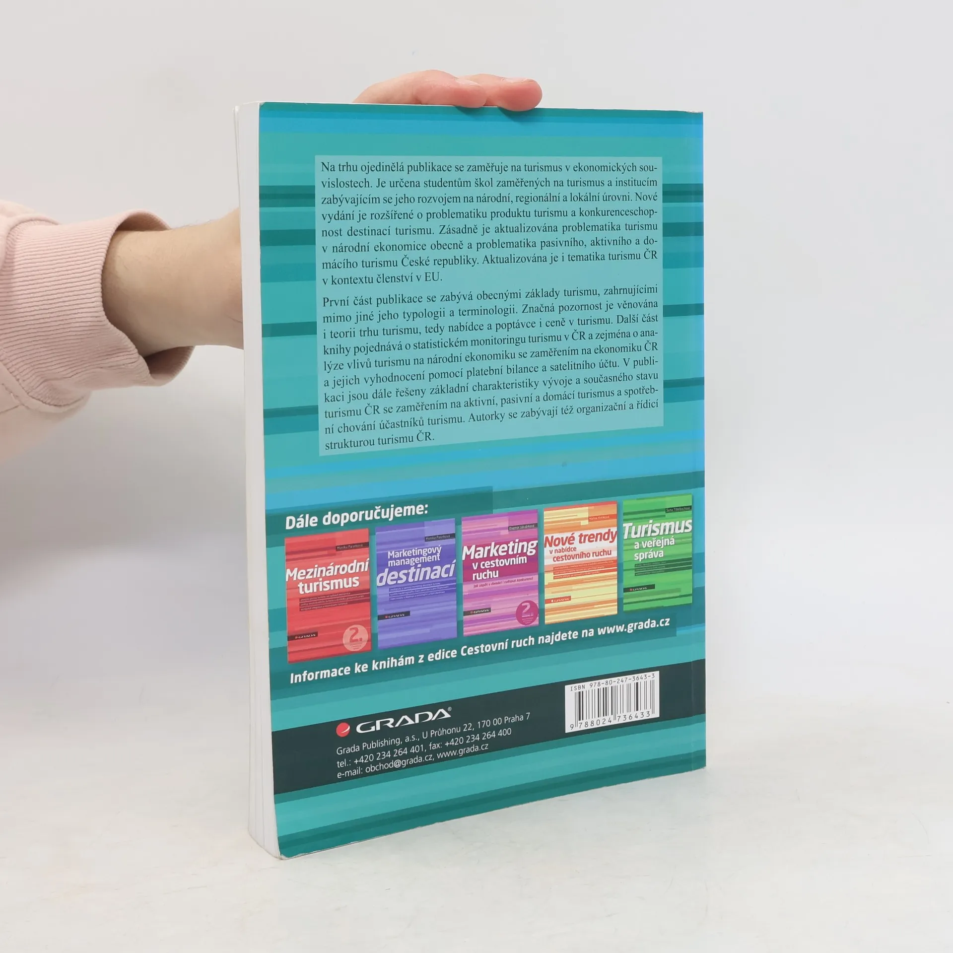 Na trhu ojedinělá publikace se zaměřuje na turismus v ekonomických souvislostech. Je určena studentům škol zaměřených na turismus a institucím zabývajícím se jeho rozvojem na národní, regionální a lokální úrovni. Nové vydání je rozšířené o problematiku produktu turismu a konkurenceschopnost destinací turismu. Zásadně je aktualizována problematika turismu v národní ekonomice obecně a problematika pasivního, aktivního a domácího turismu České republiky. Aktualizována je i tematika turismu ČR v kontextu členství v EU. První část publikace se zabývá obecnými základy turismu, zahrnujícími mimo jiné jeho typologii a terminologii. Značná pozornost je věnována i teorii trhu turismu, tedy nabídce a poptávce i ceně v turismu. Další část knihy pojednává o statistickém monitoringu turismu v ČR a zejména o analýze vlivů turismu na národní ekonomiku se zaměřením na ekonomiku ČR a jejich vyhodnocení pomocí platební bilance a satelitního účtu. V publikaci jsou dále řešeny základní charakteristiky vývoje a současného stavu turismu ČR se zaměřením na aktivní, pasivní a domácí turismus a spotřební chování účastníků turismu. Autorky se zabývají též organizační a řídicí strukturou turismu ČR. 2., aktualizované a rozšířené vydání.