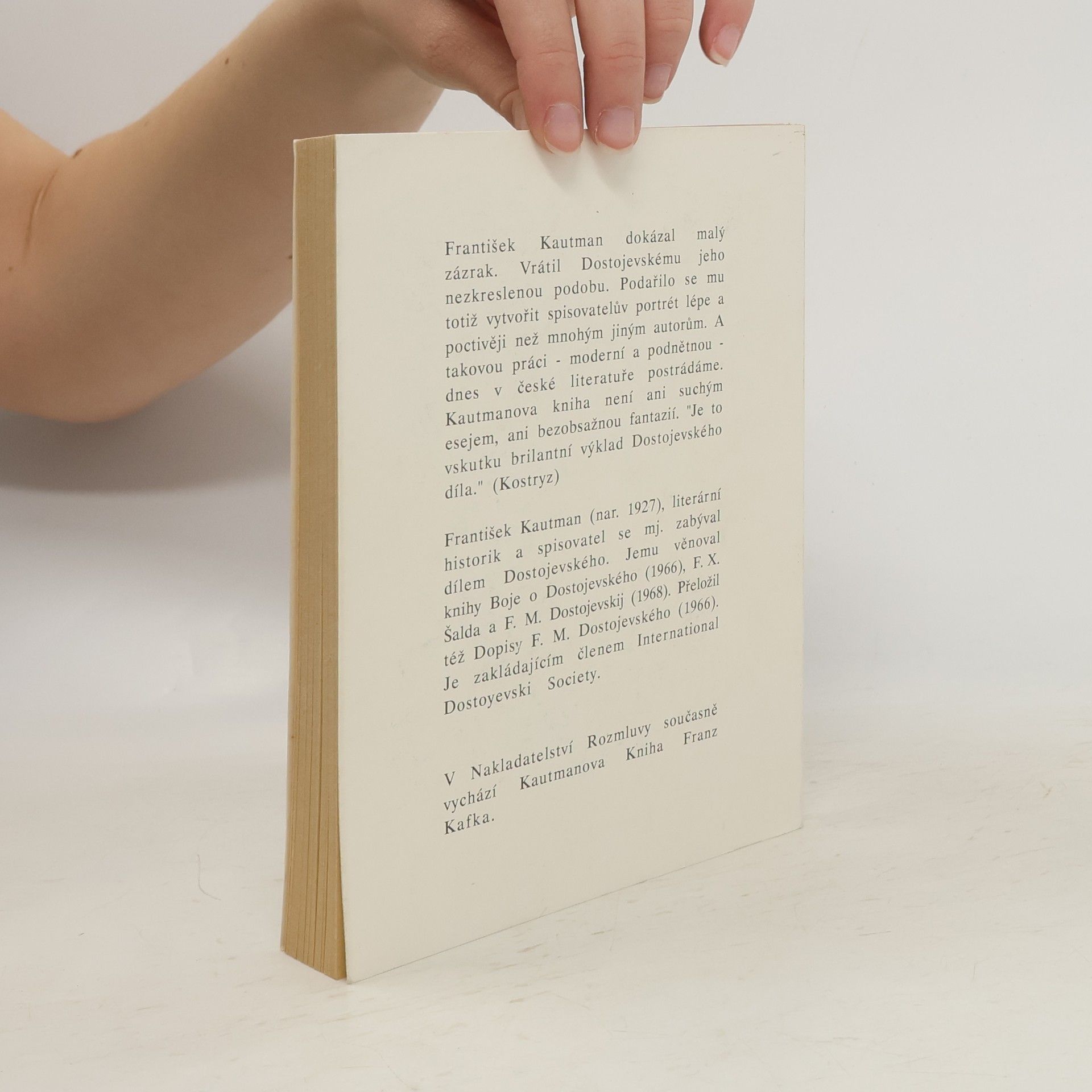 Osoba a dílo F. M. Dostojevského vzbuzuje stále mnoho otázek a nejasností. František Kautman dokázal vrátit Dostojevskému jeho nezkreslenou podobu. Podařilo se mu totiž vytvořit spisovatelův portrét lépe a poctivěji než jiným autorům. Kautmanova kniha není jen suchým esejem ani bezobsažnou fantazií. Je to vskutku brilantní výklad Dostojevského díla, jak se o rukopisu knihy vyjádřil Josef Kostohryz.... celý text