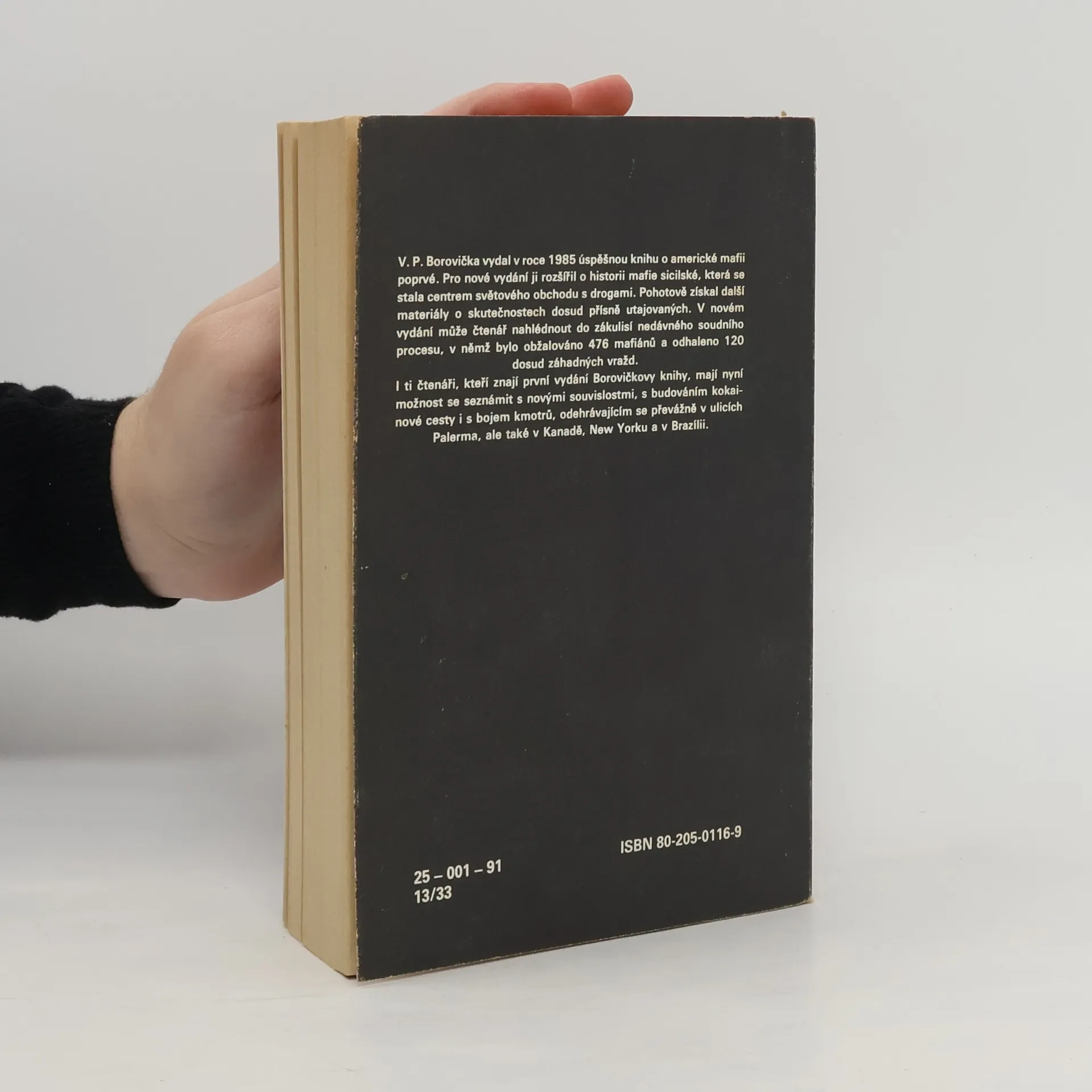 V. P. Borovička vydal v roce 1985 úspěšnou knihu o americké mafii poprvé. Pro nové vydání ji rozšířil o historii mafie sicilské, která se stala centrem světového obchodu s drogami. Pohotově získal další materiály o skutečnostech dosud přísně utajovaných. V novém vydání může čtenář nahlédnout do zákulisí nedávného soudního procesu, v němž bylo obžalováno 476 mafiánů a odhaleno 120 dosud záhadných vražd. I ti čtenáři, kteří znají první vydání Borovičkovy knihy, mají nyní možnost se seznámit s novými souvislostmi, s budováním kokainové cesty i s bojem kmotrů, odehrávajícím se převážně v ulicích Palerma, ale také v Kanadě, New Yorku a v Brazílii.... celý text