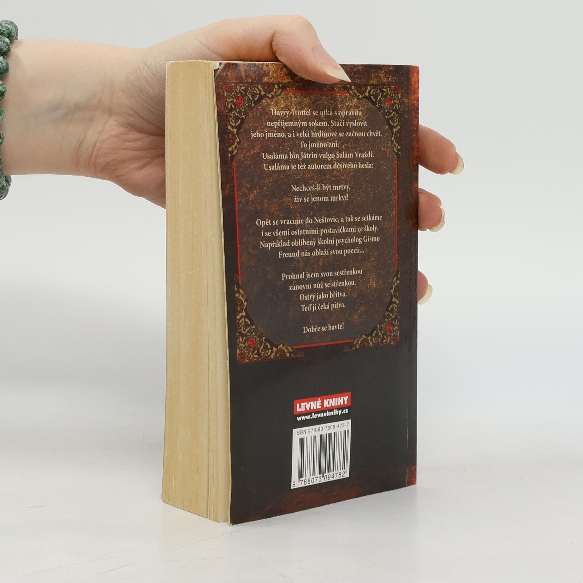 Harry Trottel se utká s opravdu nepříjemným sokem. Stačí vyslovit jeho jméno, aby se i velcí hrdinové začali chvět. To jméno zní: Usaláma bin Játrin vulgo Salám Vraždí. Usaláma je též autorem děsivého hesla: Nechceš-li být mrtvý, živ se jenom mrkví! Opět se vracíme do Neštovic, a tak se setkáme i se všemi ostatními postavičkami ze školy. Například oblíbený školní psycholog Gismo Freund nás oblaží svojí poezií... Prohnal jsem svou sestřenkou zánovní nůž se střenkou. Ostrý jako břitva. Teď ji čeká pitva.