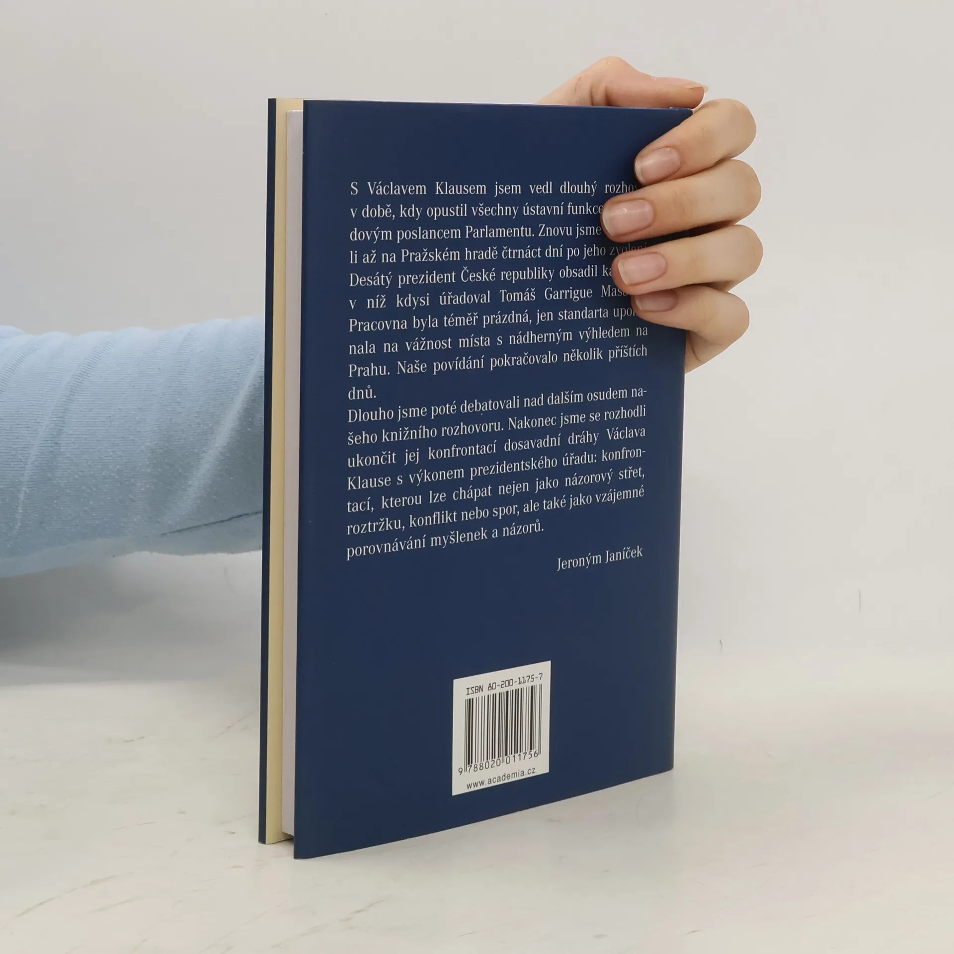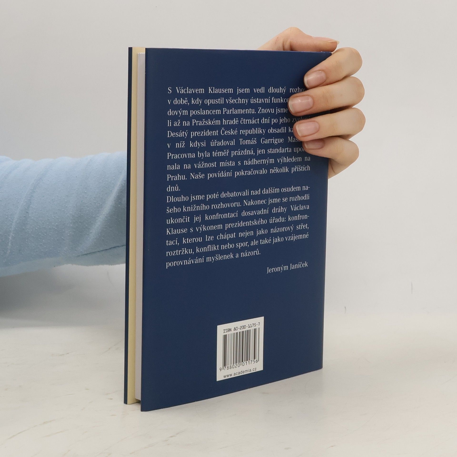 /Prezident Václav Klaus v diskusi s Jeronýmem Janíčkem/ Novinář Jeroným Janíček vedl dlouhý rozhovor s Václavem Klausem v době, kdy opustil všechny ústavní funkce a byl řadovým poslancem Parlamentu. Znovu se pak setkali na Pražském hradě po čtrnácti dnech od zvolení Klause prezidentem České republiky. Rozhovor se tak stal konfrontací dosavadní dráhy Václava Klause s výkonem prezidentského úřadu: konfrontací, kterou lze chápat nejen jako názorový střet, roztržku, konflikt nebo spor, ale také jako vzájemné porovnávání myšlenek a názorů.... celý text