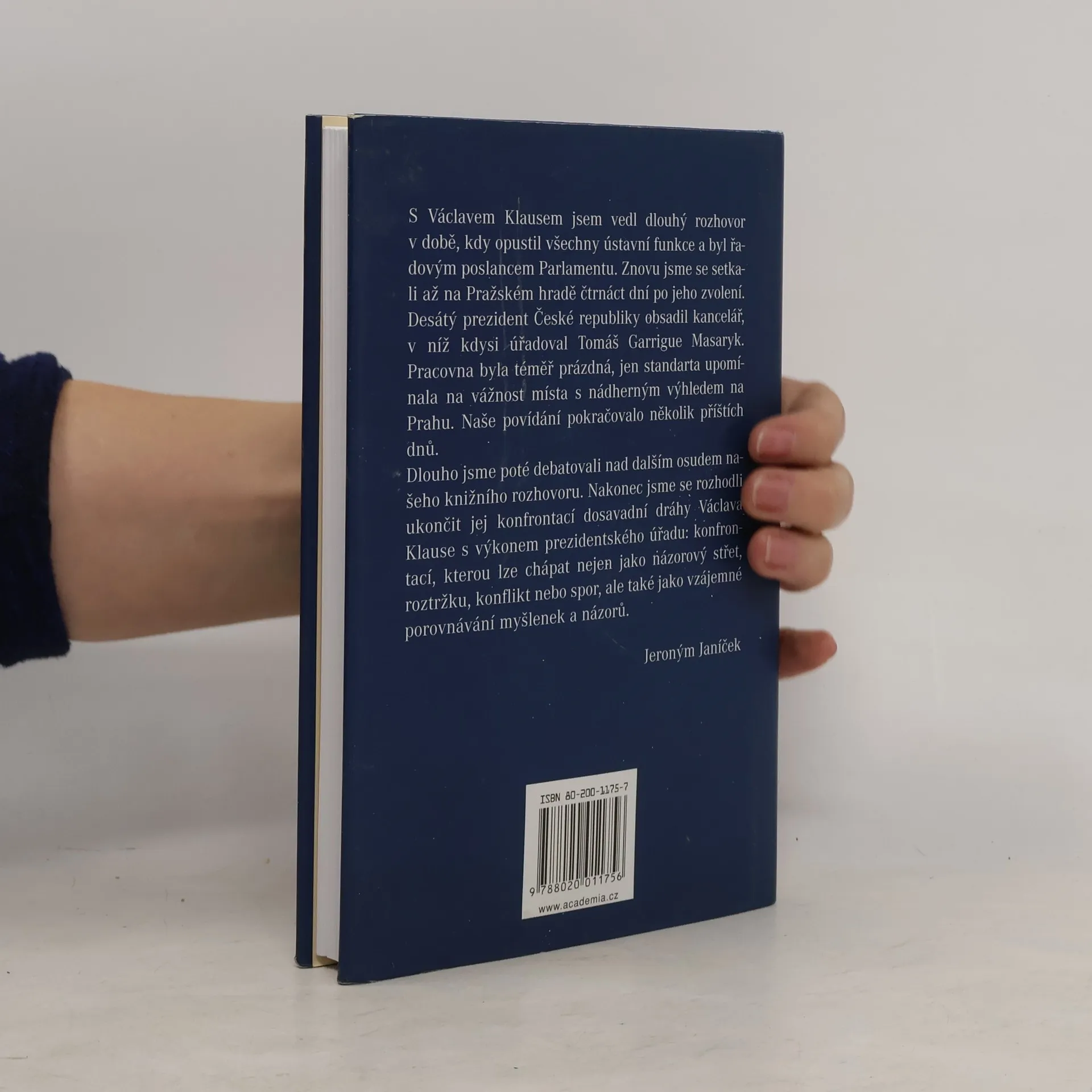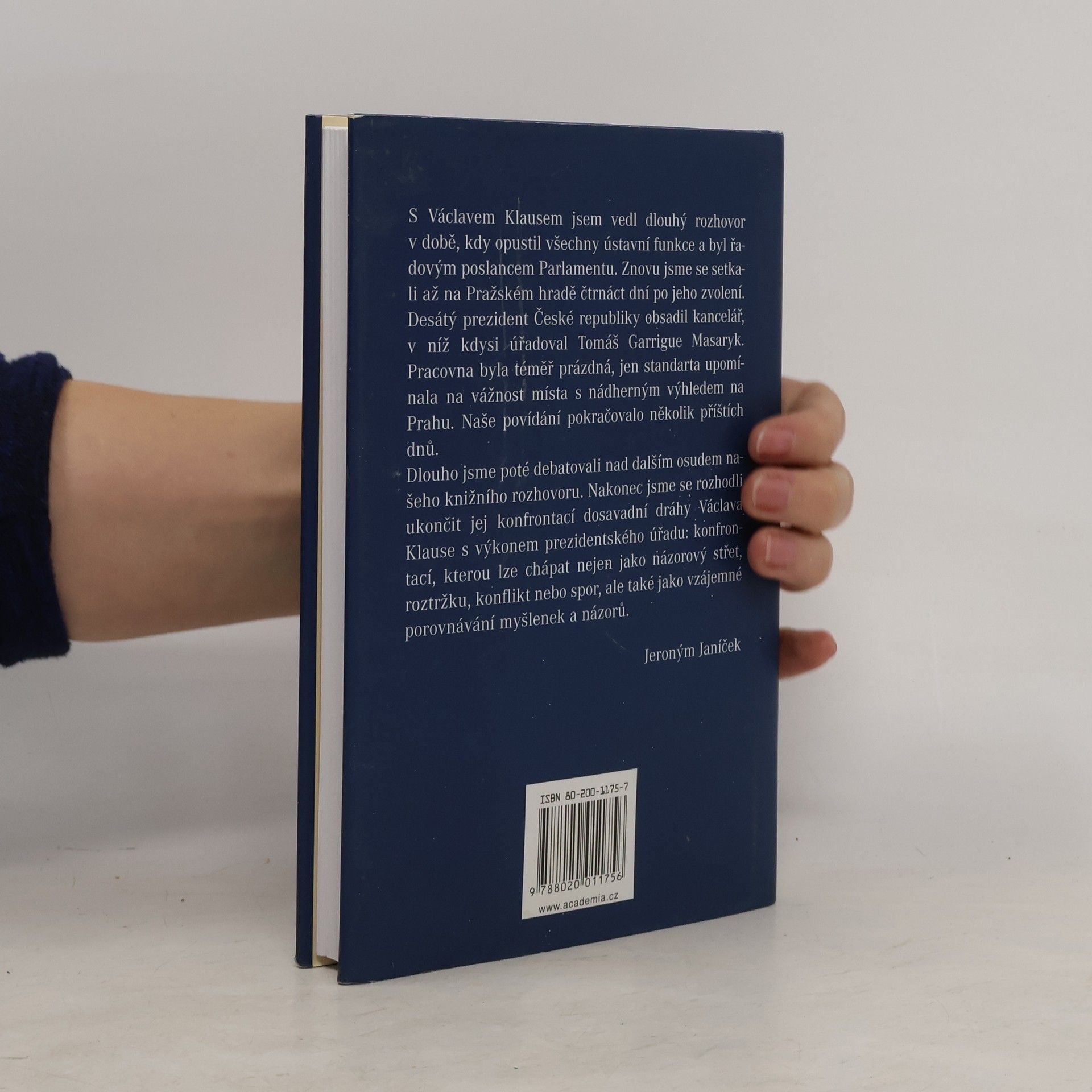 /Prezident Václav Klaus v diskusi s Jeronýmem Janíčkem/ Novinář Jeroným Janíček vedl dlouhý rozhovor s Václavem Klausem v době, kdy opustil všechny ústavní funkce a byl řadovým poslancem Parlamentu. Znovu se pak setkali na Pražském hradě po čtrnácti dnech od zvolení Klause prezidentem České republiky. Rozhovor se tak stal konfrontací dosavadní dráhy Václava Klause s výkonem prezidentského úřadu: konfrontací, kterou lze chápat nejen jako názorový střet, roztržku, konflikt nebo spor, ale také jako vzájemné porovnávání myšlenek a názorů.... celý text