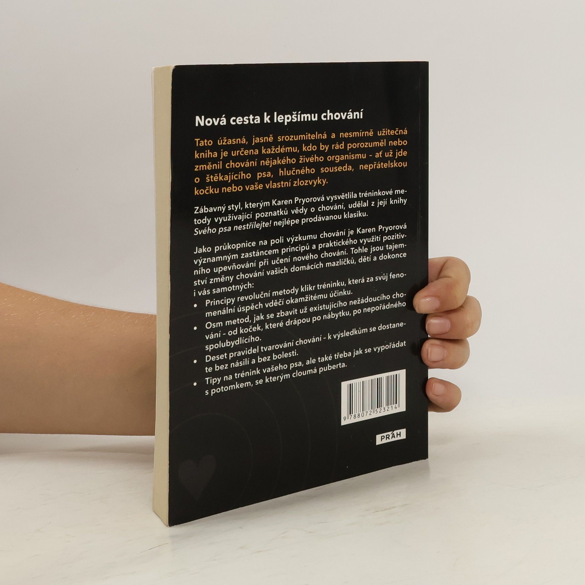 Zakladatelka klikr tréninku Karen Pryorová napsala knihu Svého psa nestřílejte!, která přináší zcela nový přístup k učení a trénování psa, ale nejen jeho. Tato úžasná, jasně srozumitelná a nesmírně užitečná kniha je určena každému, kdo by rád porozuměl nebo změnil chování nějakého živého organismu - ať už jde o štěkajícího psa, hlučného souseda, nepřátelskou kočku nebo vaše vlastní zlozvyky. Světově uznávaná klasika Jako průkopnice na poli výzkumu chování je Karen Pryorová významným zastáncem principů a praktického využití pozitivního upevňování při učení nového chování. Tohle jsou tajemství změny chování vašich domácích mazlíčků, dětí a dokonce i vás samotných: Principy revoluční metody klikr tréninku, která za svůj fenomenální úspěch vděčí okamžitému účinku. Osm metod, jak se zbavit už existujícího nežádoucího chování - od koček, které drápou po nábytku, po nepořádného spolubydlícího. Deset pravidel tvarování chování - k výsledkům se dostanete bez násilí a bez bolesti. Tipy na trénink vašeho psa, ale také třeba jak se vypořádat s potomkem, se kterým cloumá puberta.