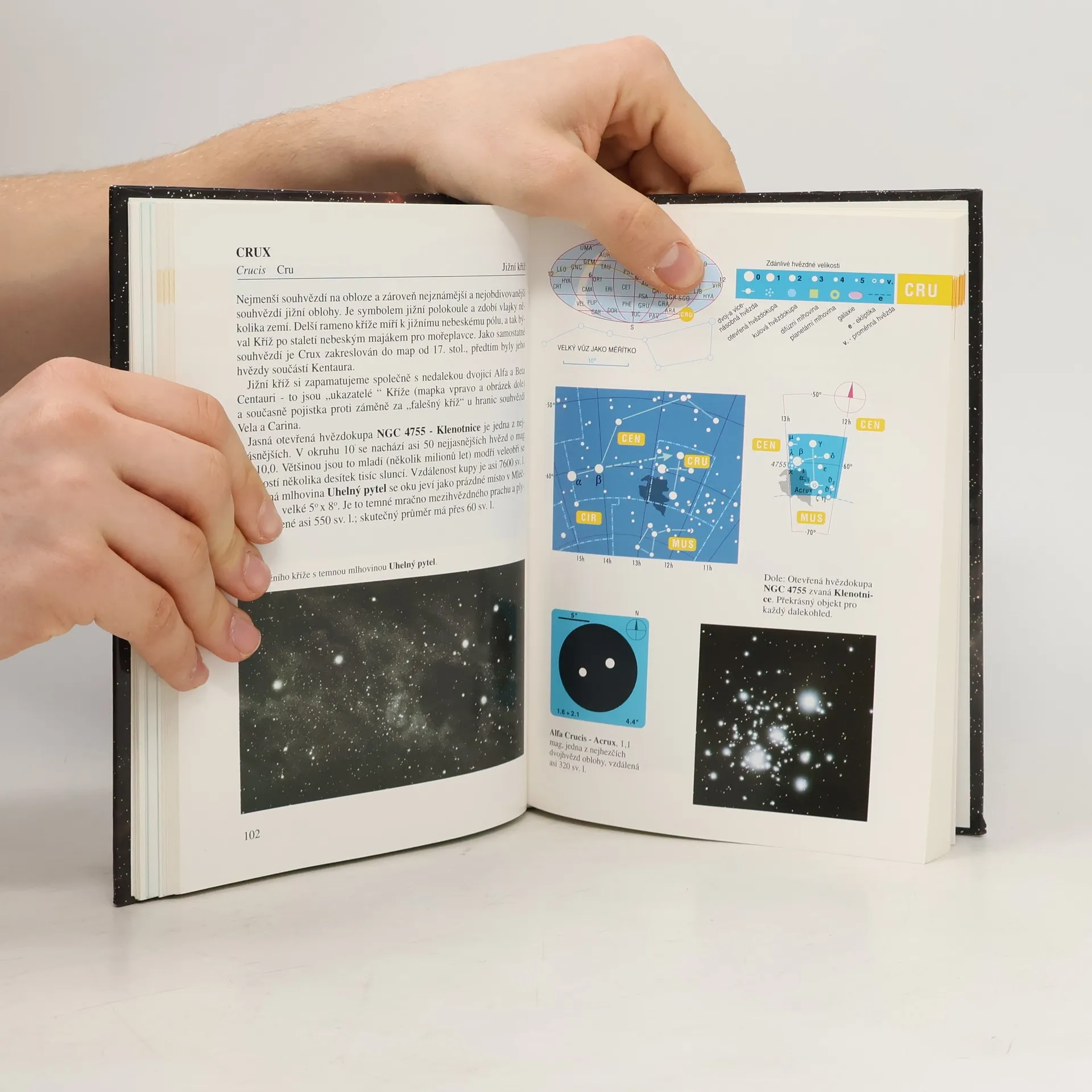Kde, kdy a jak nalézt souhvězdí, zvířetník a planety, přehled kosmických objektů, hvězdné mapy a mapy 88 souhvězdí s popisem. Přehled kosmických objektů (hvězdy, obři a trpaslíci, dvojhvězdy a proměnlivé hvězdy, mléčná dráha, hvězdokupy a mlhoviny, galaxie). Hvězdné mapy souhvězdí v okolí severního světového pólu, podzimní, zimní, jarní a letní souhvězdí a souhvězdí v okolí jižního světového pólu. U map souhvězdí je popis, zajímavosti z historie a dokumentární fotografie. V celé knize jsou označeny odstavce pro začínající pozorovatele hvězdné oblohy. Připojen slovníček odborných výrazů.