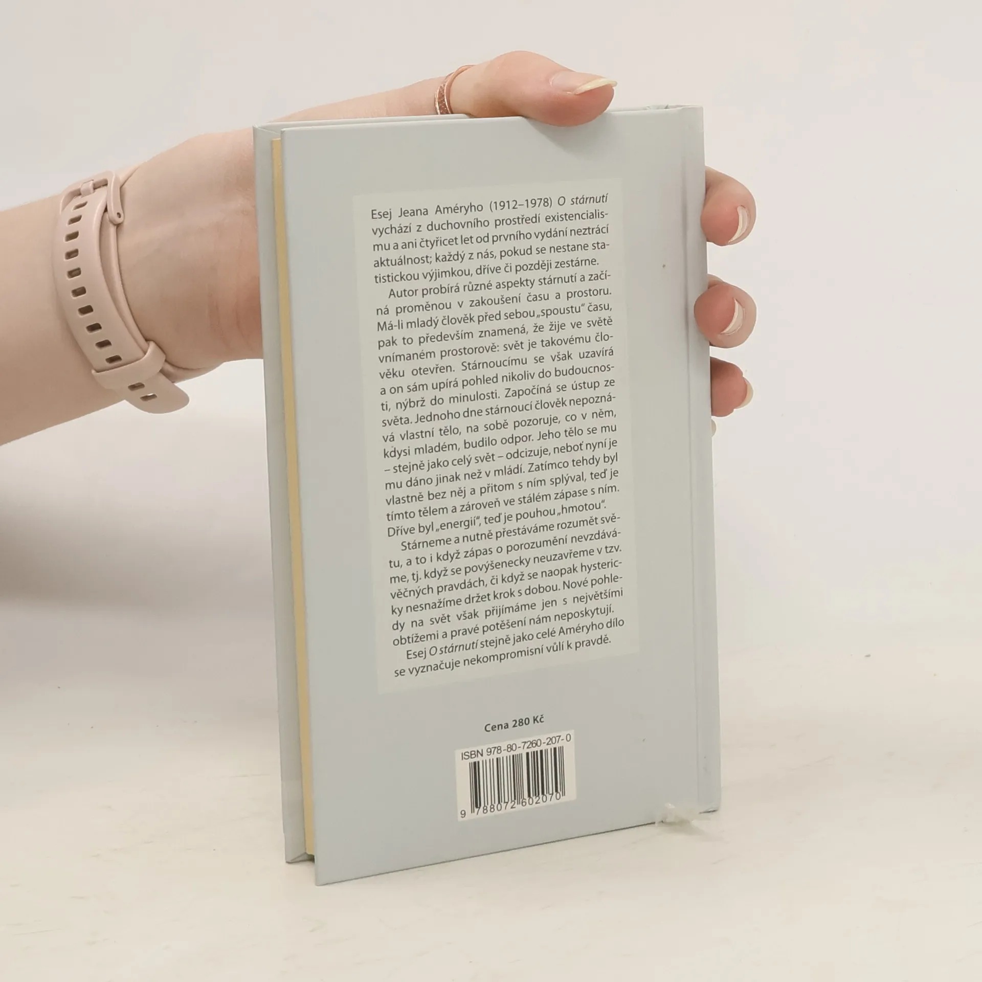 Esej Jeana Améryho (1912–1978) O stárnutí vychází z duchovního prostředí existencialismu a ani čtyřicet let od prvního vydání neztrácí aktuálnost; každý z nás, pokud se nestane statistickou výjimkou, dříve či později zestárne. Autor probírá různé aspekty stárnutí a začíná proměnou v zakoušení času a prostoru. Má-li mladý člověk před sebou „spoustu“ času, pak to především znamená, že žije ve světě vnímaném prostorově: svět je takovému člověku otevřen. Stárnoucímu se však uzavírá a on sám upírá pohled nikoliv do budoucnosti, nýbrž do minulosti. Započíná se ústup ze světa. Jednoho dne stárnoucí člověk nepoznává vlastní tělo, na sobě pozoruje, co v něm, kdysi mladém, budilo odpor. Jeho tělo se mu – stejně jako celý svět – odcizuje, neboť nyní je mu dáno jinak než v mládí. Zatímco tehdy byl vlastně bez něj a přitom s ním splýval, teď je tímto tělem a zároveň ve stálém zápase s ním. Dříve byl „energií“, teď je pouhou „hmotou“. Stárneme a nutně přestáváme rozumět světu, a to i když zápas o porozumění nevzdáváme, tj. když se povýšenecky neuzavřeme v tzv. věčných pravdách, či když se naopak hystericky nesnažíme držet krok s dobou. Nové pohledy na svět však přijímáme jen s největšími obtížemi a pravé potěšení nám neposkytují. Esej O stárnutí stejně jako celé Améryho dílo se vyznačuje nekompromisní vůlí k pravdě.