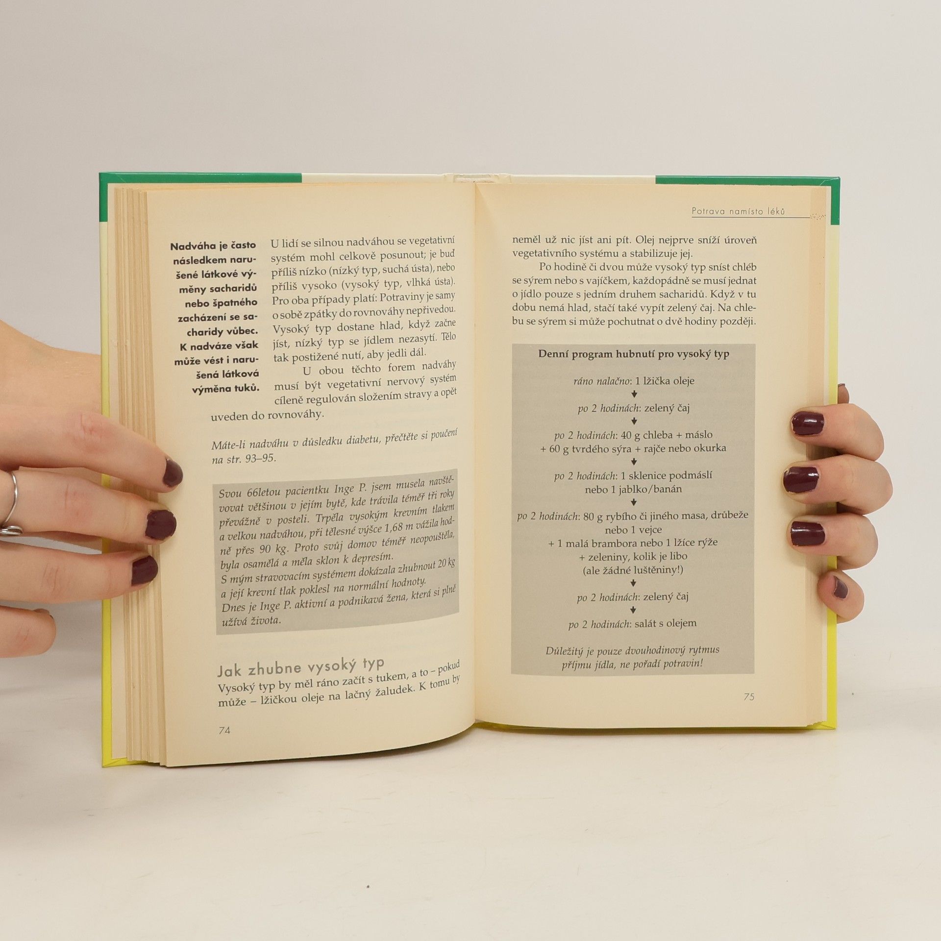 Strava místo léků. Jak zdravě zhubnout..Mozek ukládá do paměti účinky potravy, které lze změřit ve formě impulzních křivek. Tímto způsobem zjistíme zpětnou reakci organismu a rozpoznáme poruchy vegetativního nervového systému. Díky cílenému stravování dosáhnete vnitřní harmonie a zamezíte onemocněním..Speciální jídelní rytmus pomáhá lidem, kteří trpí alergiemi, migrénou, nadváhou či stresem.... celý text