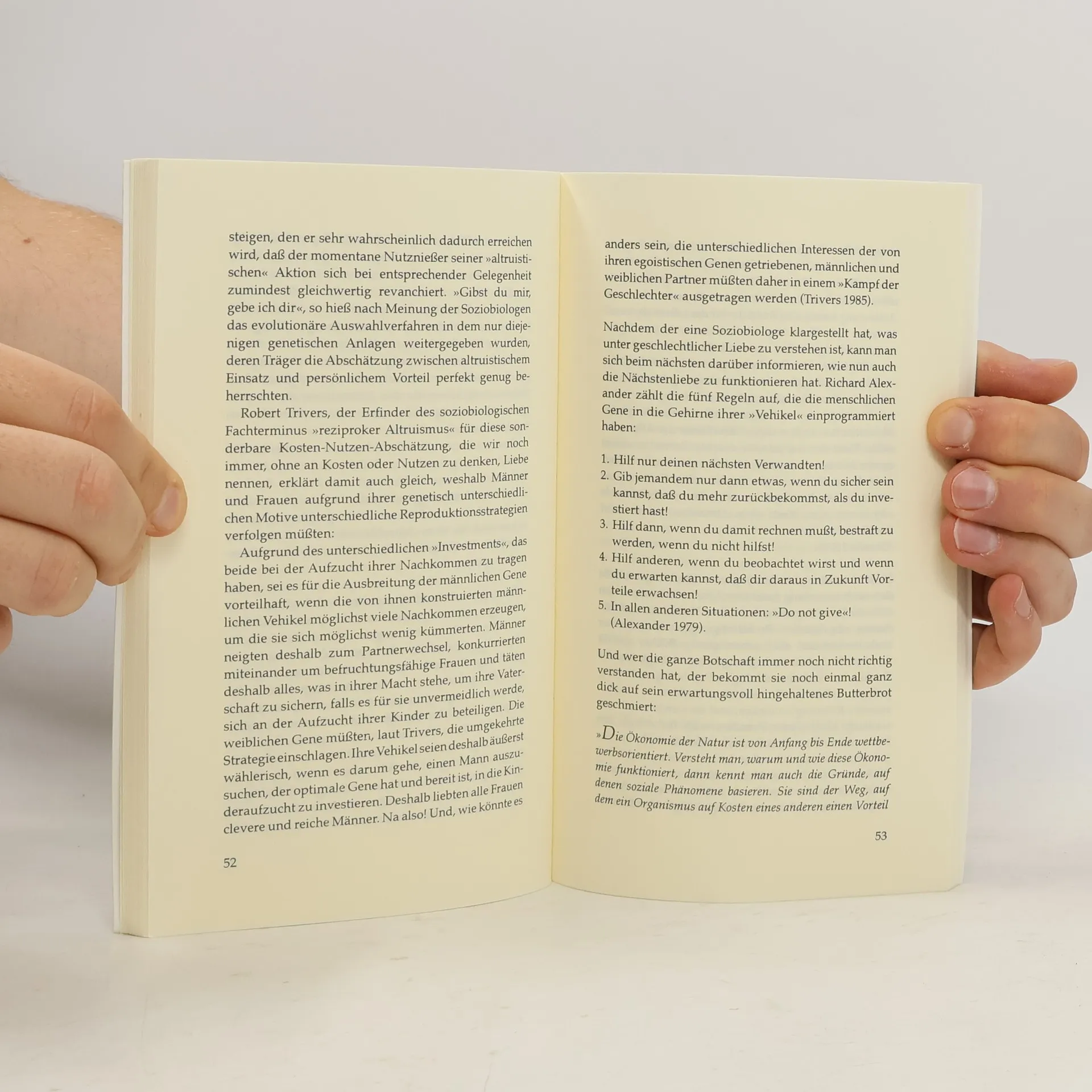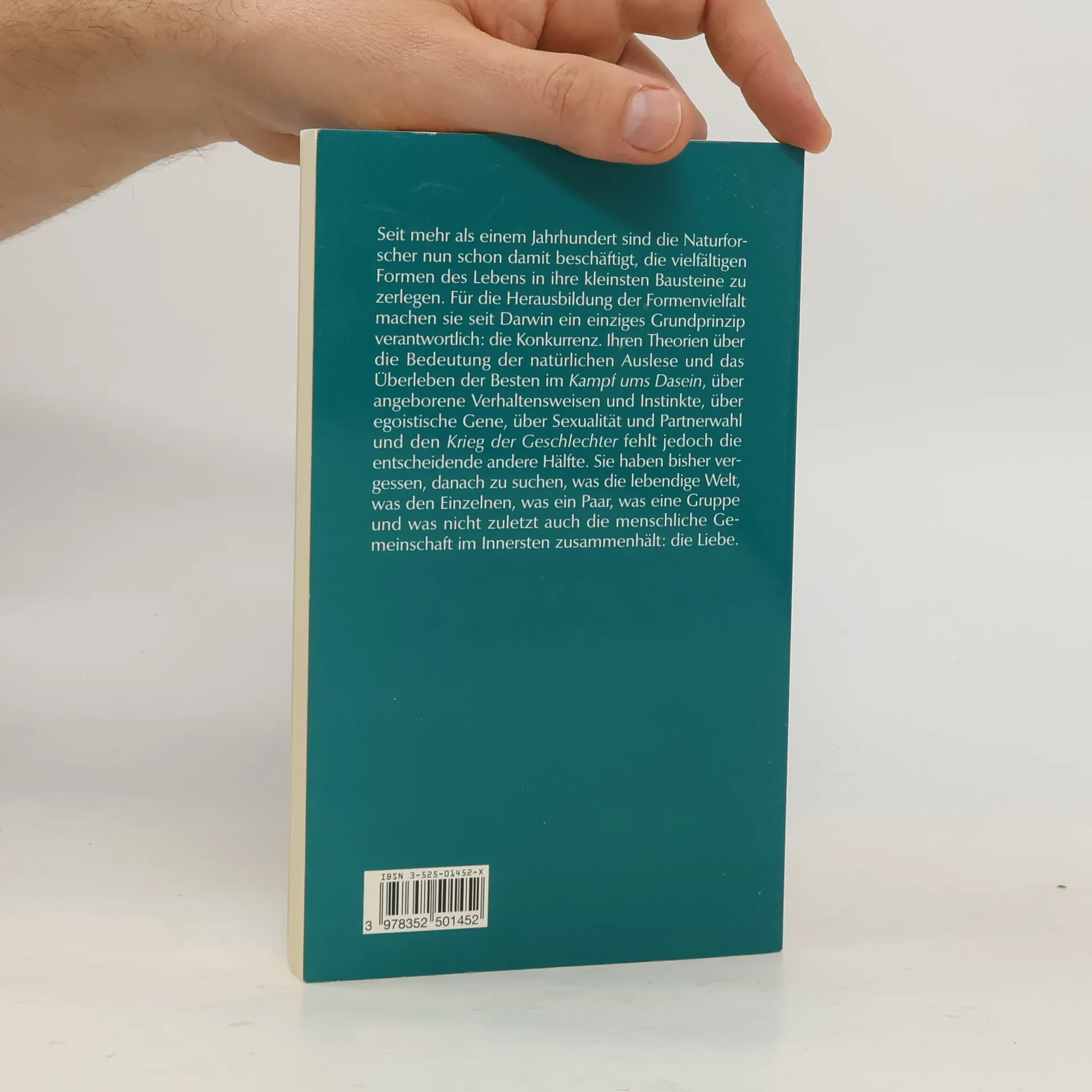 Seit mehr als einem Jahrhundert sind die Naturforscher nun schon damit beschäftigt, die vielfältigen Formen des Lebens in ihre kleinsten Bausteine zu zerlegen. Für die Herausbildung der Formenvielfalt machen sie seit Darwin ein einziges Grundprinzip verantwortlich: die Konkurrenz.Ihren Theorien über die Bedeutung der natürlichen Auslese und das Überleben der Besten im Kampf ums Dasein, über angeborene Verhaltensweisen und Instinkte, über egoistische Gene, über Sexualität und Partnerwahl und den Krieg der Geschlechter fehlt jedoch die entscheidende andere Hälfte. Sie haben bisher vergessen, danach zu suchen, was die lebendige Welt, was den Einzelnen, was ein Paar, was eine Gruppe und was nicht zuletzt auch die menschliche Gemeinschaft im Innersten zusammenhält: die Liebe.