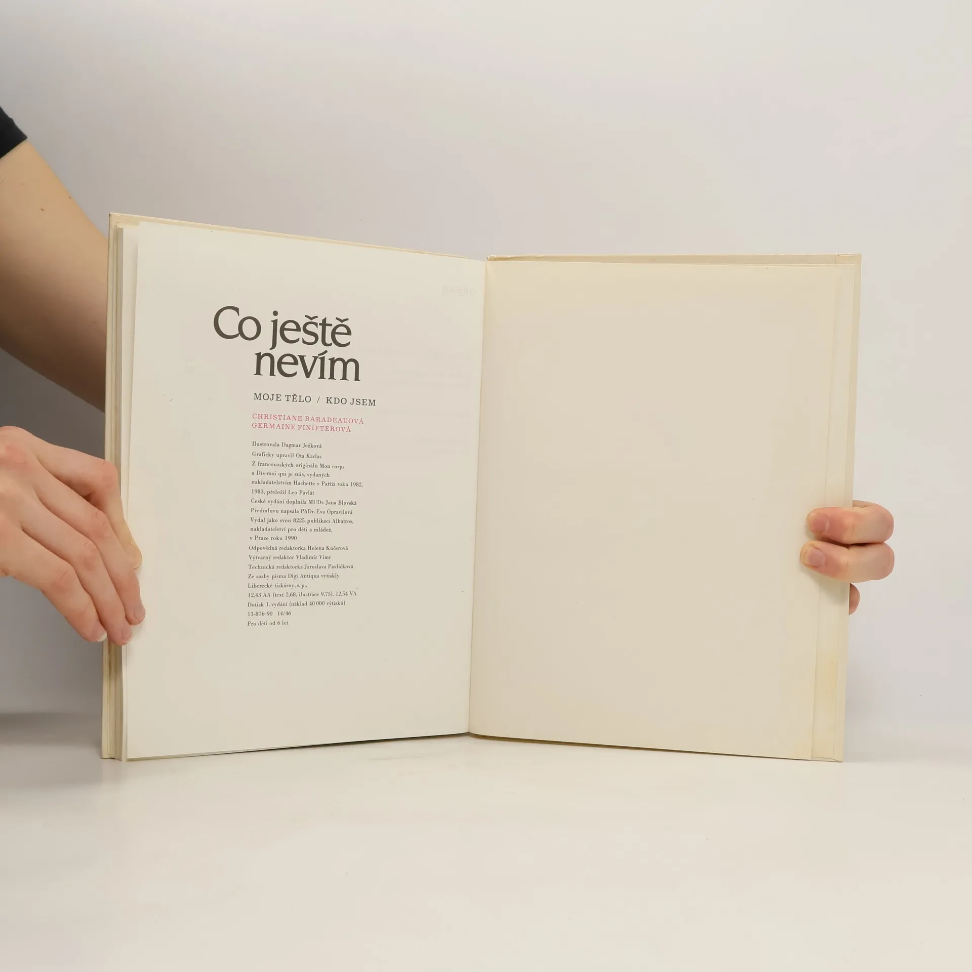 Moje tělo / Germaine Finifter Kdo jsem / Christiane Baradeau Knížka, určená dětem od 6 do 8 let, je pozoruhodná, objevná a neobyčejně užitečná. Vznikla tak, že pedagogové a psychologové ve Francii sledovali a po určitou dobu zapisovali dětské otázky k nejrůznějším tématům a pak z nich vybírali ty, které se objevovaly nejčastěji. Ale i přes to, že to nebyly naše děti, můžeme předpokládat, že vztahy mezi lidmi, tajemství kolem narození i smrti člověka, pocity i znalost vlastního těla a jeho funkce jsou i pro ně stejně důležité a zajímavé. Netradiční obsah vyžaduje zvýšenou pozornost těch, kteří s knížkou budou pracovat. Je náročná, a proto vyžaduje citlivý odhad situace a individuální zřetel v posouvání zájmu i možností chápání dítěte. Není a nemůže být určena k souvislému předčítání, jednotlivé odpovědi by měly sloužit spíše jako úvodní motivace a inspirace k rozhovorům na dané otázky, k úvahám a přemýšlení o vlastních zkušenostech a pocitech i jejich porovnávání s prožitky druhých. Předmluva: Eva Opravilová