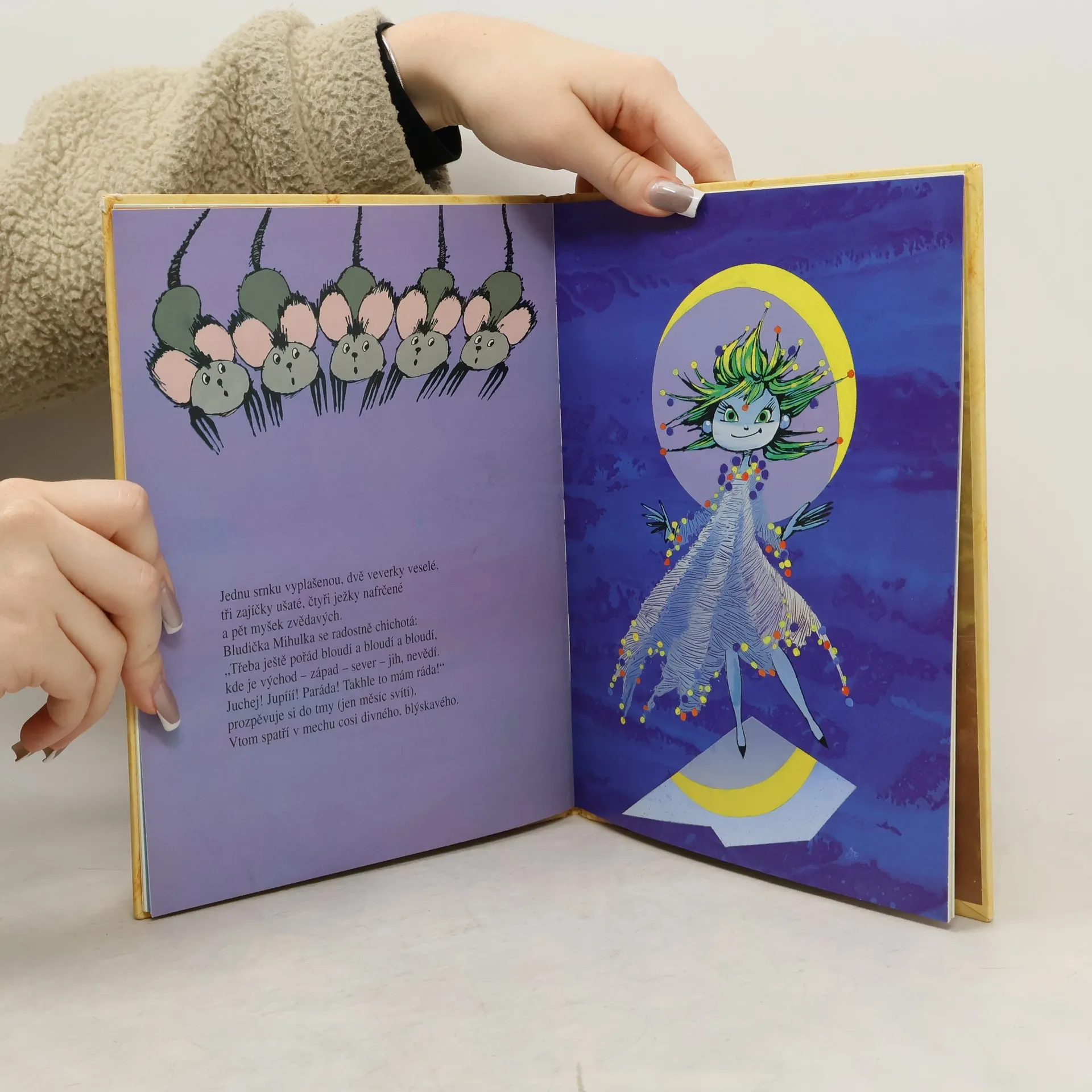Duhově se třpytí na obálce knihy – i vy se v něm můžete vidět! Kromě toho se dozvíte, co se stane, když sedm trpaslíčků sní jednu obrovskou čokoládu. A co se stane, když ježibabka Čambucha své zrcadélko darované z lásky praští o kámen (jen proto, že v něm nevidí krasavici). V čarodějnickém světě rozbít zrcadlo znamená sedm roků neštěstí. Zato lesním tvorečkům přinášely blýskavé střípky jenom štěstí. Pro jednoho byl střípek stříbrnou klouzačkou, pro druhého měsíčním okem, pro dalšího denní hvězdou… A co Čambucha? Po sedmi letech se šťastně vdála a narodilo se jí ježibejbátko.