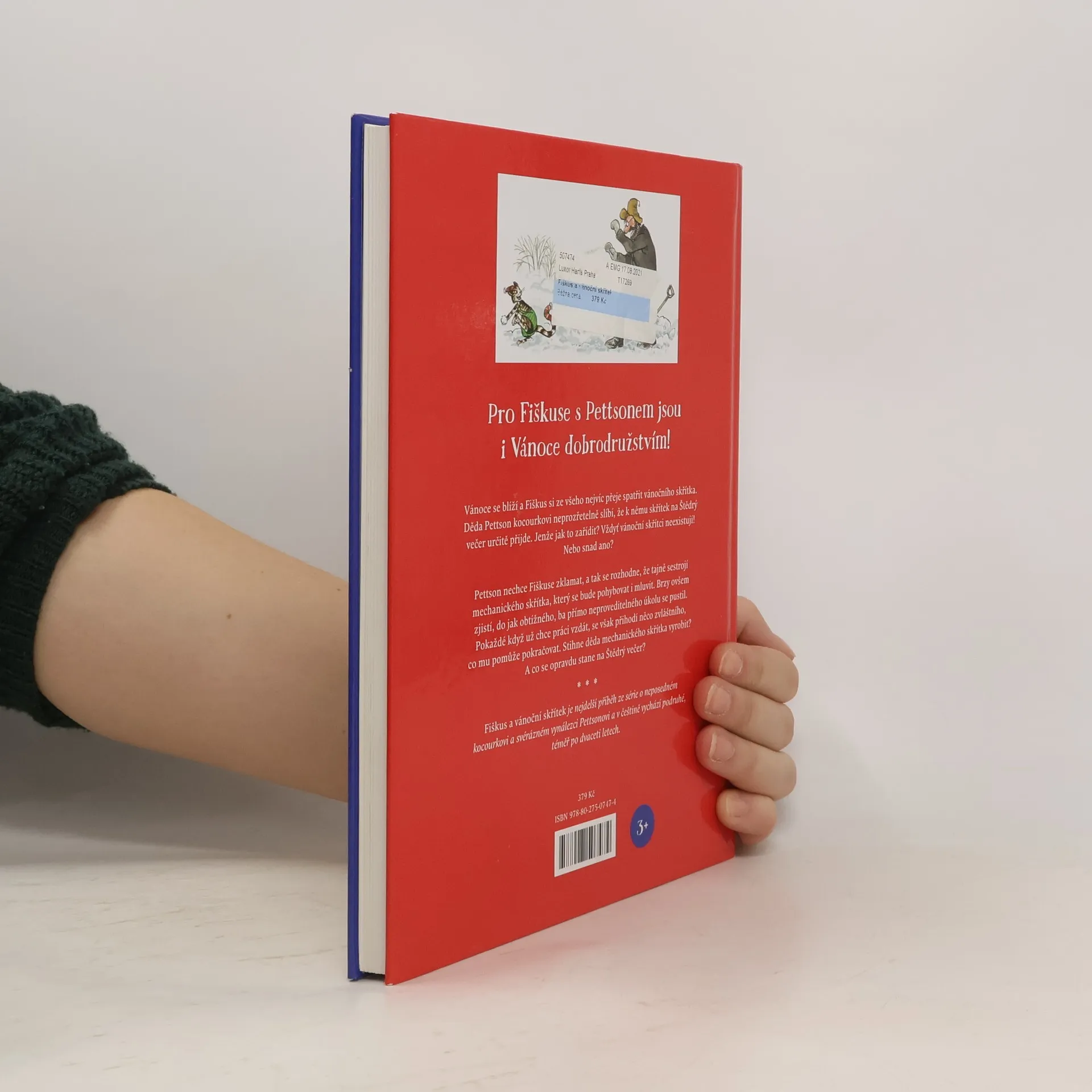Pro Fiškuse s Pettsonem jsou i Vánoce dobrodružstvím! Vánoce se blíží a Fiškus si ze všeho nejvíc přeje spatřit vánočního skřítka. Děda Pettson kocourkovi neprozřetelně slíbí, že k němu skřítek na Štědrý večer určitě přijde. Jenže jak to zařídit? Vždyť vánoční skřítci neexistují! Nebo snad ano? Pettson nechce Fiškuse zklamat, a tak se rozhodne, že tajně sestrojí mechanického skřítka, který se bude pohybovat i mluvit. Brzy ovšem zjistí, do jak obtížného, ba přímo neproveditelného úkolu se pustil. Pokaždé když už chce své úsilí vzdát, se však přihodí něco zvláštního, co mu pomůže pokračovat. Stihne děda mechanického skřítka vyrobit? A co se opravdu stane na Štědrý večer? Fiškus a vánoční skřítek je nejdelší příběh ze série o neposedném kocourkovi a svérázném vynálezci Pettsonovi a v češtině vychází podruhé, téměř po dvaceti letech.
