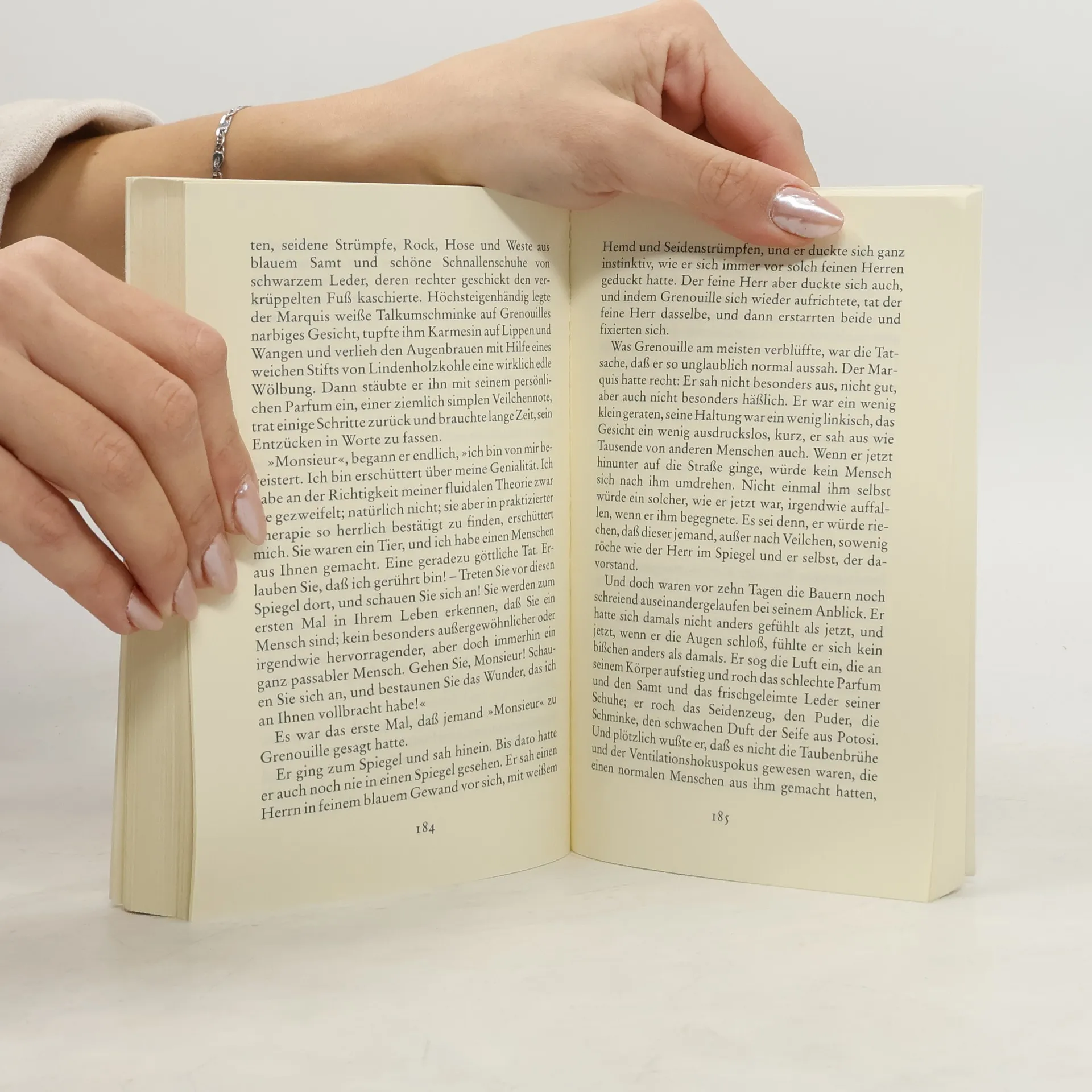 Von Jean-Baptiste Grenouille, dem finsteren Helden, sei nur verraten, daß er 1738 in Paris, in einer stinkigen Fischbude, geboren wird. Die Ammen, denen das Kerlchen an die Brust gelegt wird, halten es nur ein paar Tage mit ihm aus: Er sei zu gierig, außerdem vom Teufel besessen, wofür es untrügliche Indizien gebe: den fehlenden Duft, den unverwechselbaren Geruch, den Säuglinge auszuströmen pflegen.