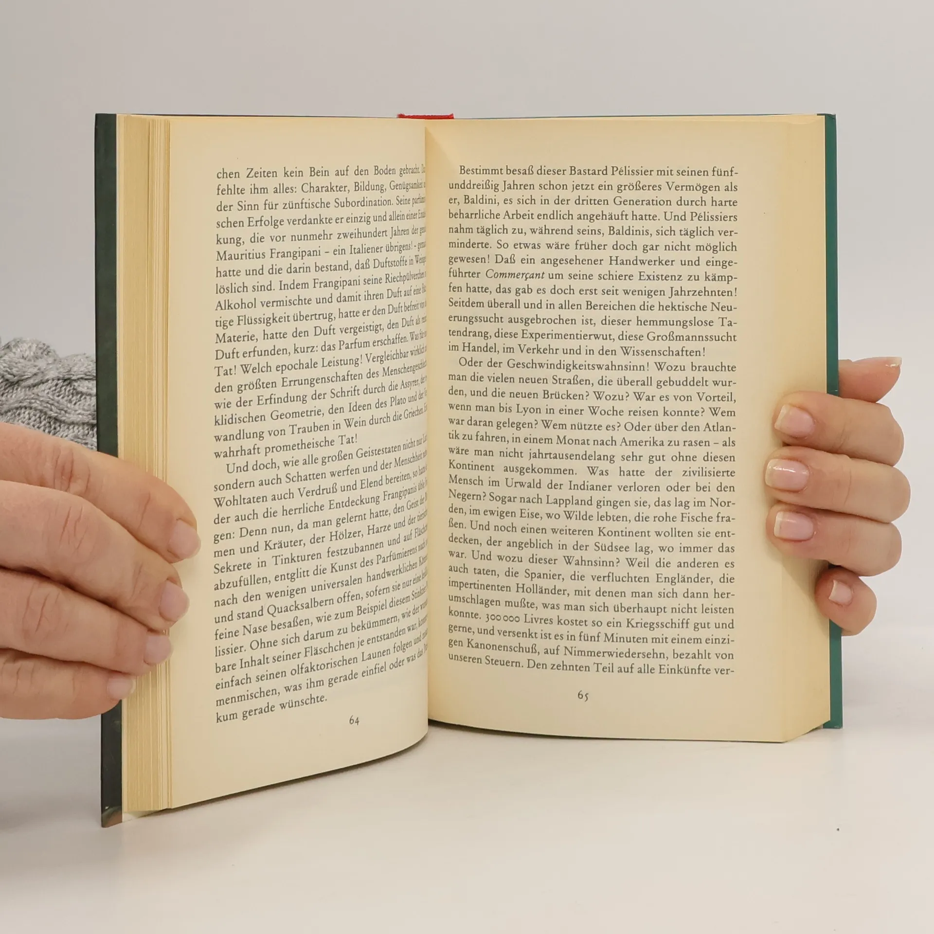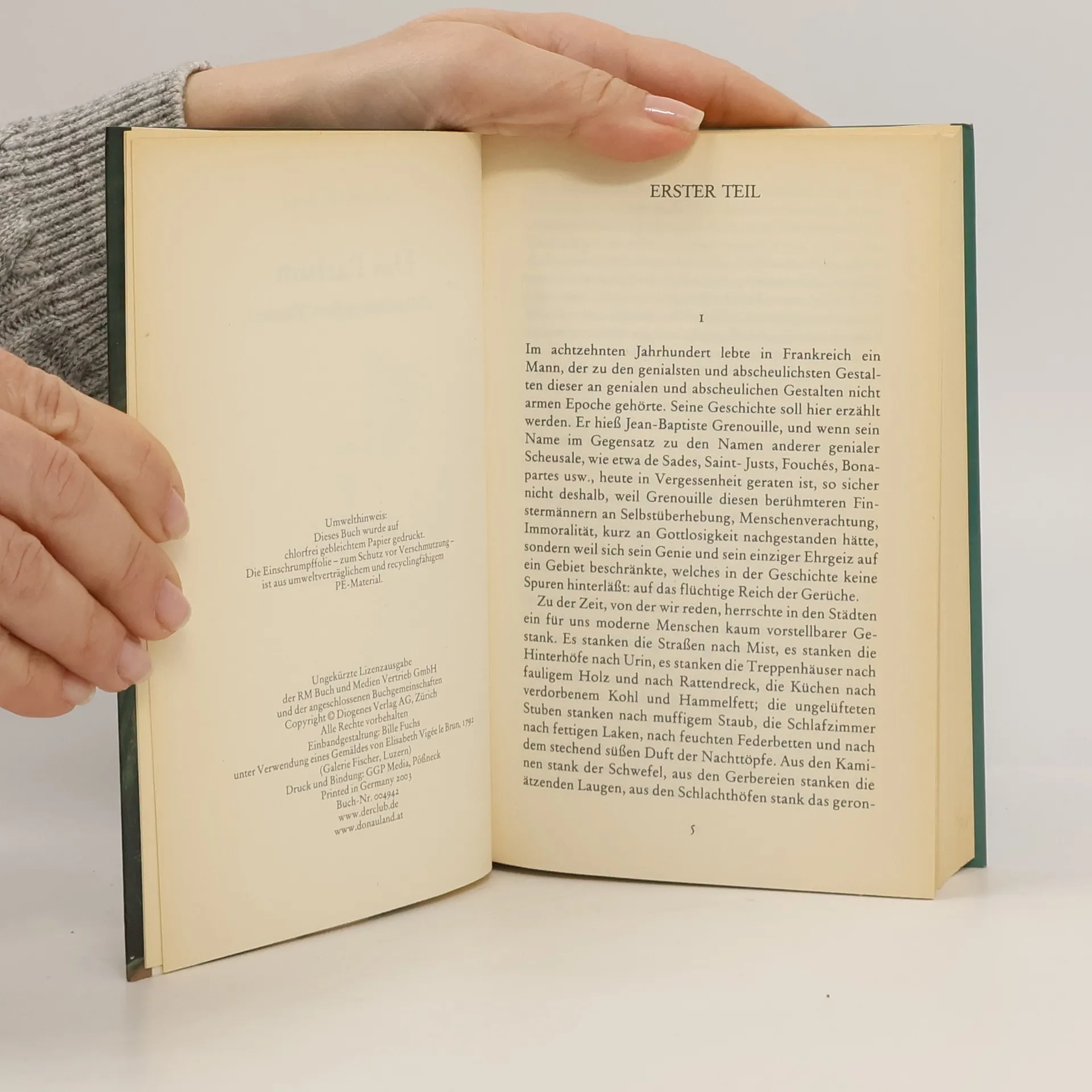 Von Jean-Baptiste Grenouille, dem finsteren Helden, sei nur verraten, daß er 1738 in Paris, in einer stinkigen Fischbude, geboren wird. Die Ammen, denen das Kerlchen an die Brust gelegt wird, halten es nur ein paar Tage mit ihm aus: Er sei zu gierig, außerdem vom Teufel besessen, wofür es untrügliche Indizien gebe: den fehlenden Duft, den unverwechselbaren Geruch, den Säuglinge auszuströmen pflegen.