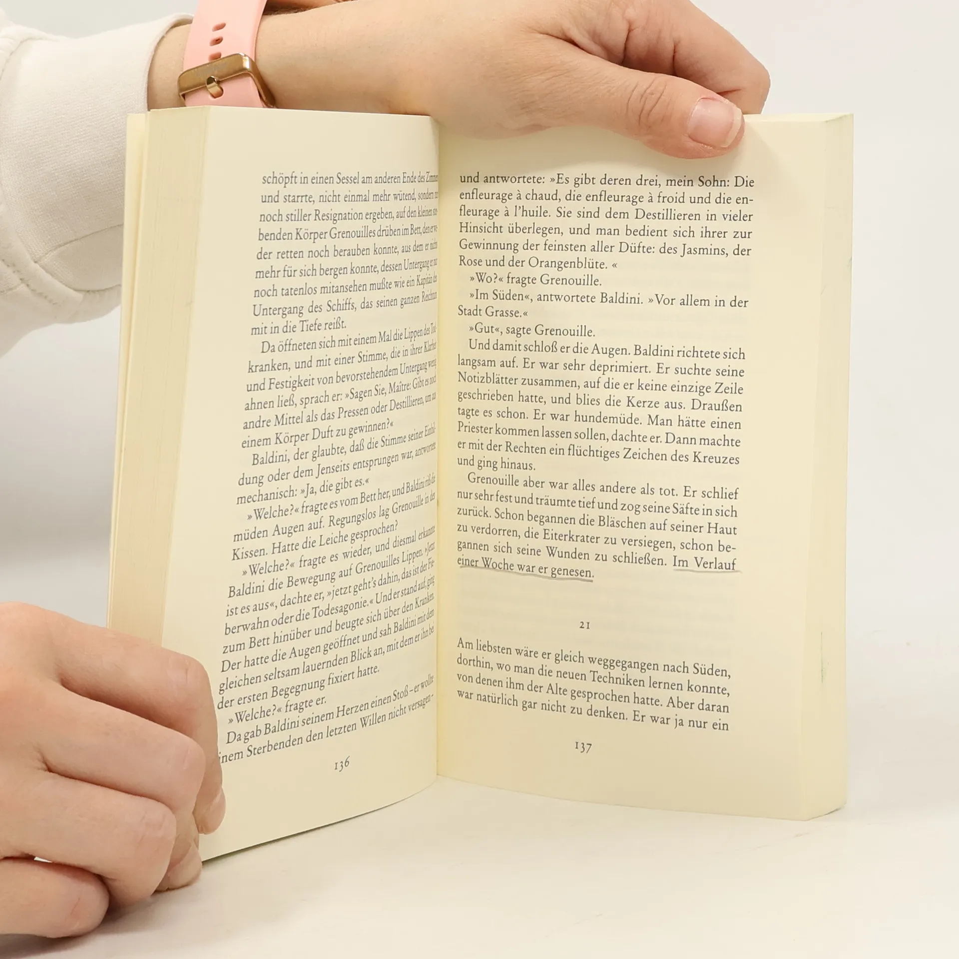Von Jean-Baptiste Grenouille, dem finsteren Helden, sei nur verraten, daß er 1738 in Paris, in einer stinkigen Fischbude, geboren wird. Die Ammen, denen das Kerlchen an die Brust gelegt wird, halten es nur ein paar Tage mit ihm aus: Er sei zu gierig, außerdem vom Teufel besessen, wofür es untrügliche Indizien gebe: den fehlenden Duft, den unverwechselbaren Geruch, den Säuglinge auszuströmen pflegen.