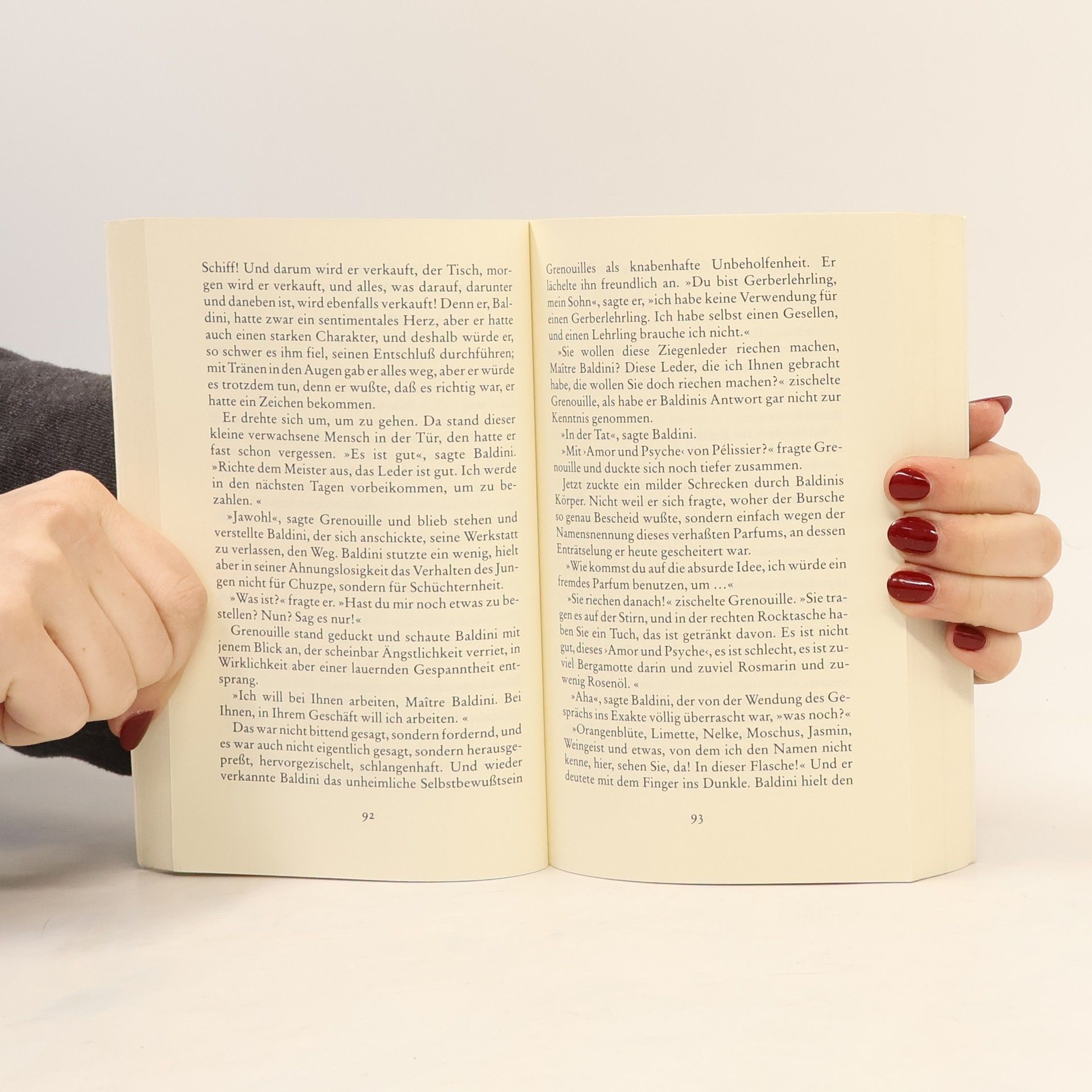 Von Jean-Baptiste Grenouille, dem finsteren Helden, sei nur verraten, daß er 1738 in Paris, in einer stinkigen Fischbude, geboren wird. Die Ammen, denen das Kerlchen an die Brust gelegt wird, halten es nur ein paar Tage mit ihm aus: Er sei zu gierig, außerdem vom Teufel besessen, wofür es untrügliche Indizien gebe: den fehlenden Duft, den unverwechselbaren Geruch, den Säuglinge auszuströmen pflegen.