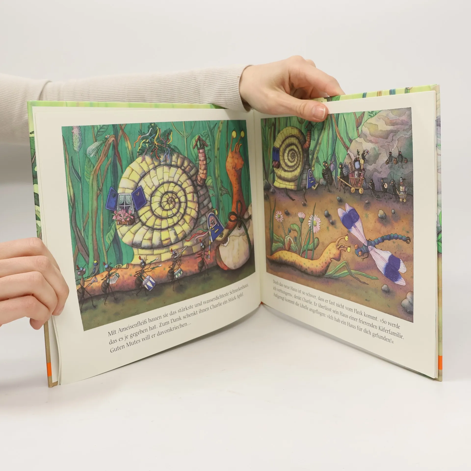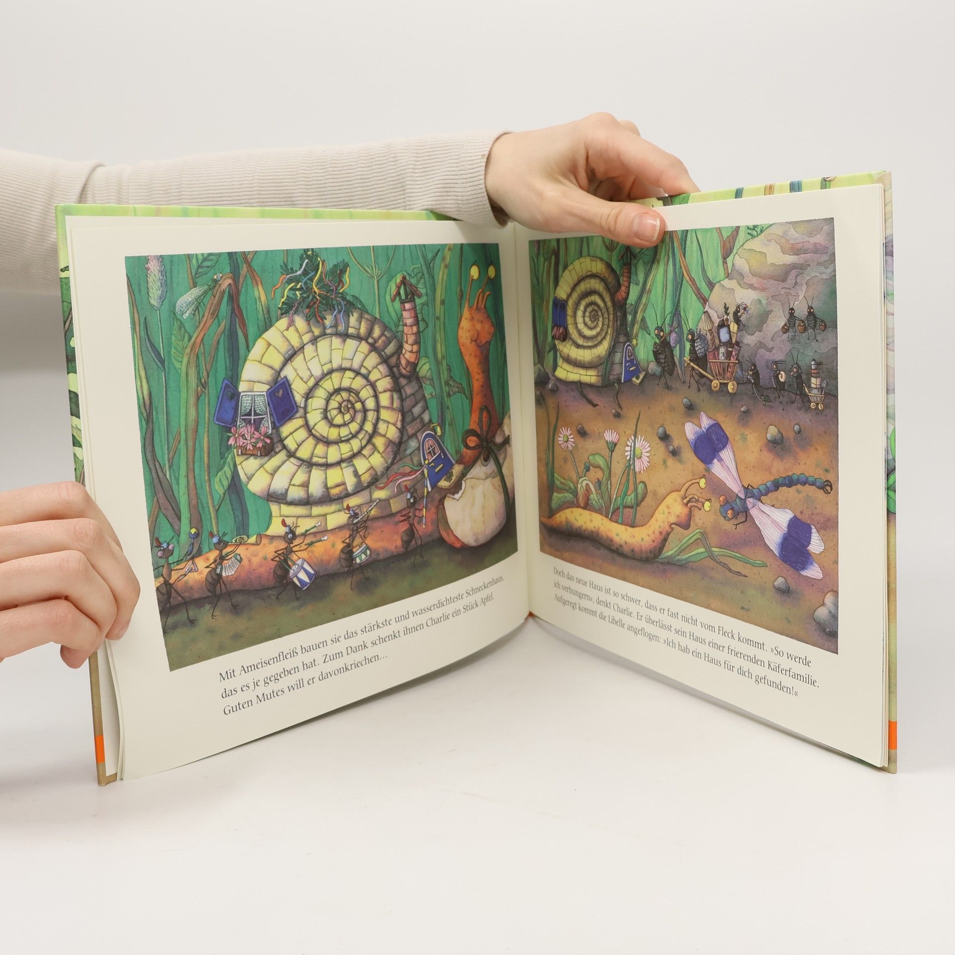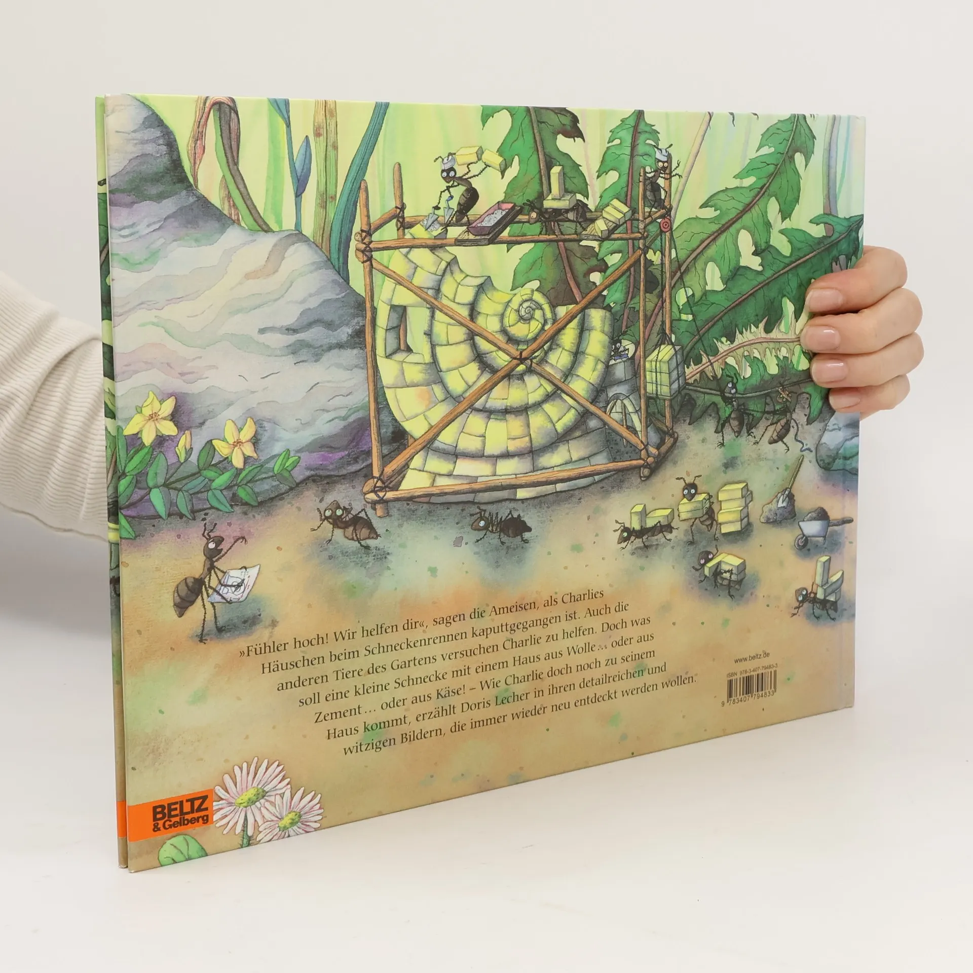 »Fühler hoch! Wir helfen dir«, sagen die Ameisen, als Charlies Häuschen beim Schneckenrennen kaputt gegangen ist. Auch die anderen Tiere im Garten versuchen Charlie zu helfen. Doch was soll eine kleine Schnecke mit einem Haus aus Wolle... oder aus Zement... oder gar aus Käse! – Wie Charlie doch noch zu seinem Haus kommt, erzählt Doris Lecher in ihren detailreichen und witzigen Bildern, die immer wieder neu entdeckt werden wollen.