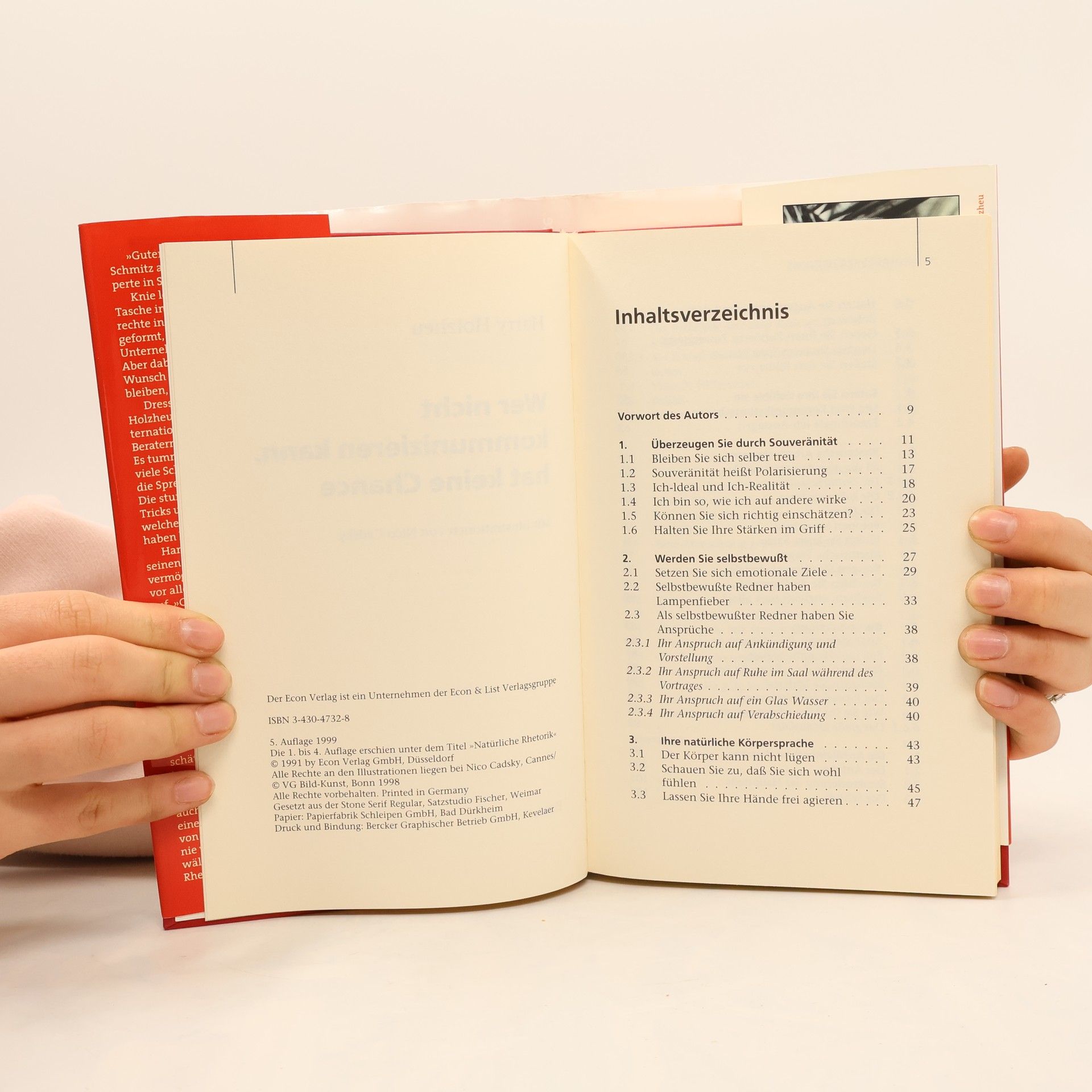 Inhaltsübersicht: Vorwort des Autors, 1. Überzeugen Sie durch Souveränität, 2. Werden Sie selbstbewusst, 3. Ihre natürliche Körpersprache, 4. Setzten Sie Ihre Gefühle ein, 5. Rhetorische Arbeitselemente, 6. Die Vorbereitung, 7. Die Architektur Ihrer Vorträge, 8. Übungen, 9. Natürliche Rhetorik in Ihrer Umwelt, Literaturhinweise.