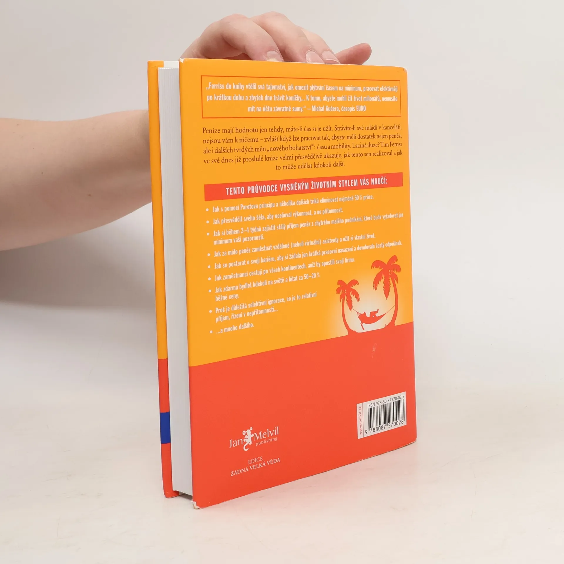 Peníze mají hodnotu jen tehdy, máte-li čas si je užít. Strávíte-li své mládí v kanceláři, nejsou vám k ničemu zvlášť když lze pracovat tak, abyste měli dostatek nejen peněz, ale i dalších tvrdých měn nového bohatství: času a mobility. Laciná iluze? Tim Ferriss ve své dnes již proslulé knize velmi přesvědčivě ukazuje, jak tento sen realizoval a jak to může udělat kdokoli další. Kniha je světovým bestsellerem a vyšla v 35 zemích.