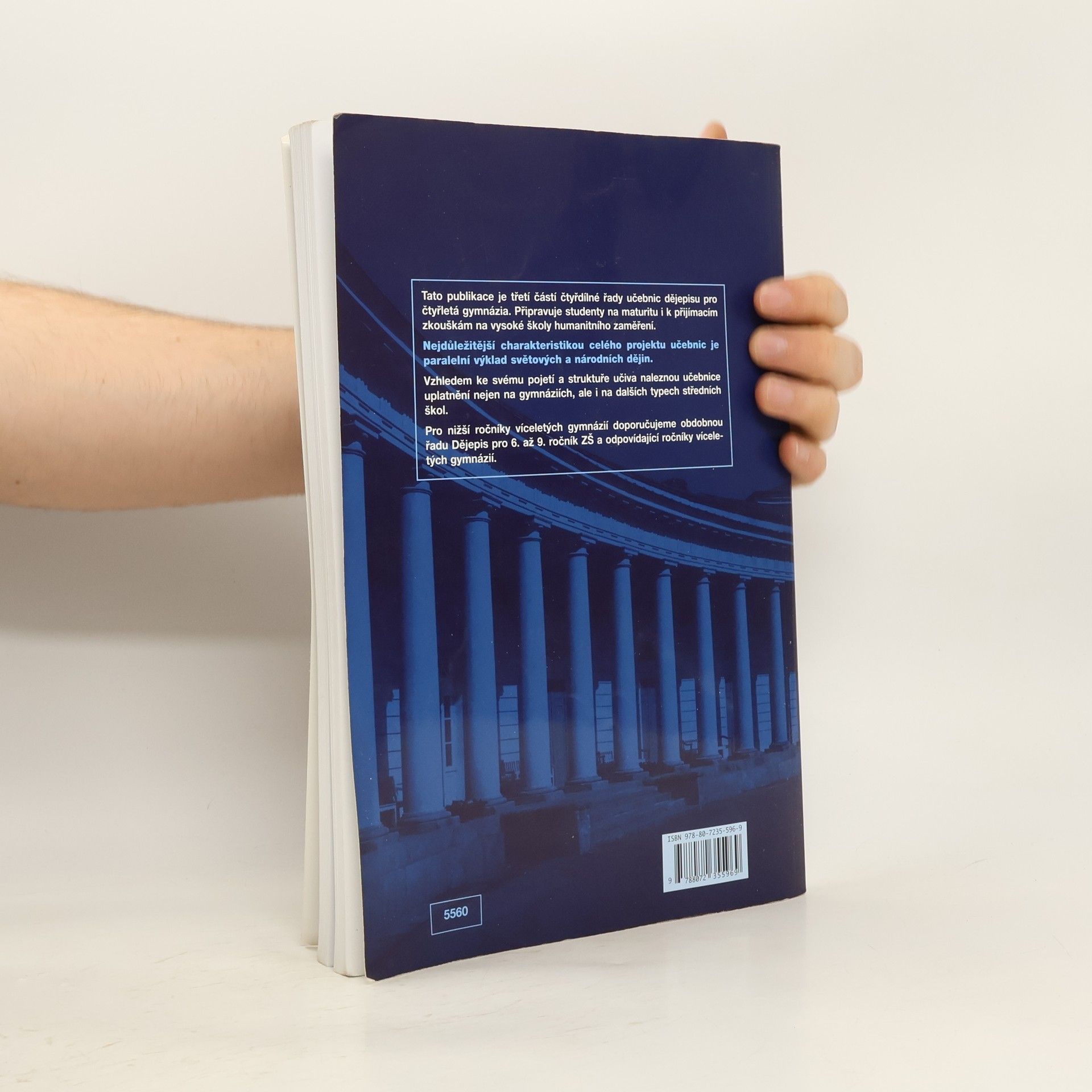Třetí z řady učebnic dějepisu pro gymnázia a střední školy – uplatní se především na gymnáziích, ale i na dalších typech škol, neboť je v učebnicích graficky odlišen základní výklad od rozšiřujícího textu. Vzhledem k rozvržení učiva s důrazem na nové dějiny umožňuje i dobrou přípravu na VŠ. Kladem řady je její nepřetíženost fakty a především paralelně vedený výklad světových i českých dějin od nejstarších dob po současnost. Učebnice obsahují bohatý obrazový materiál, početné dějepisné mapy a náležitý didaktický aparát. Přední východ ●., Egypt ●., starověké Řecko ●., starověký Řím ●., Indie ●., Čína