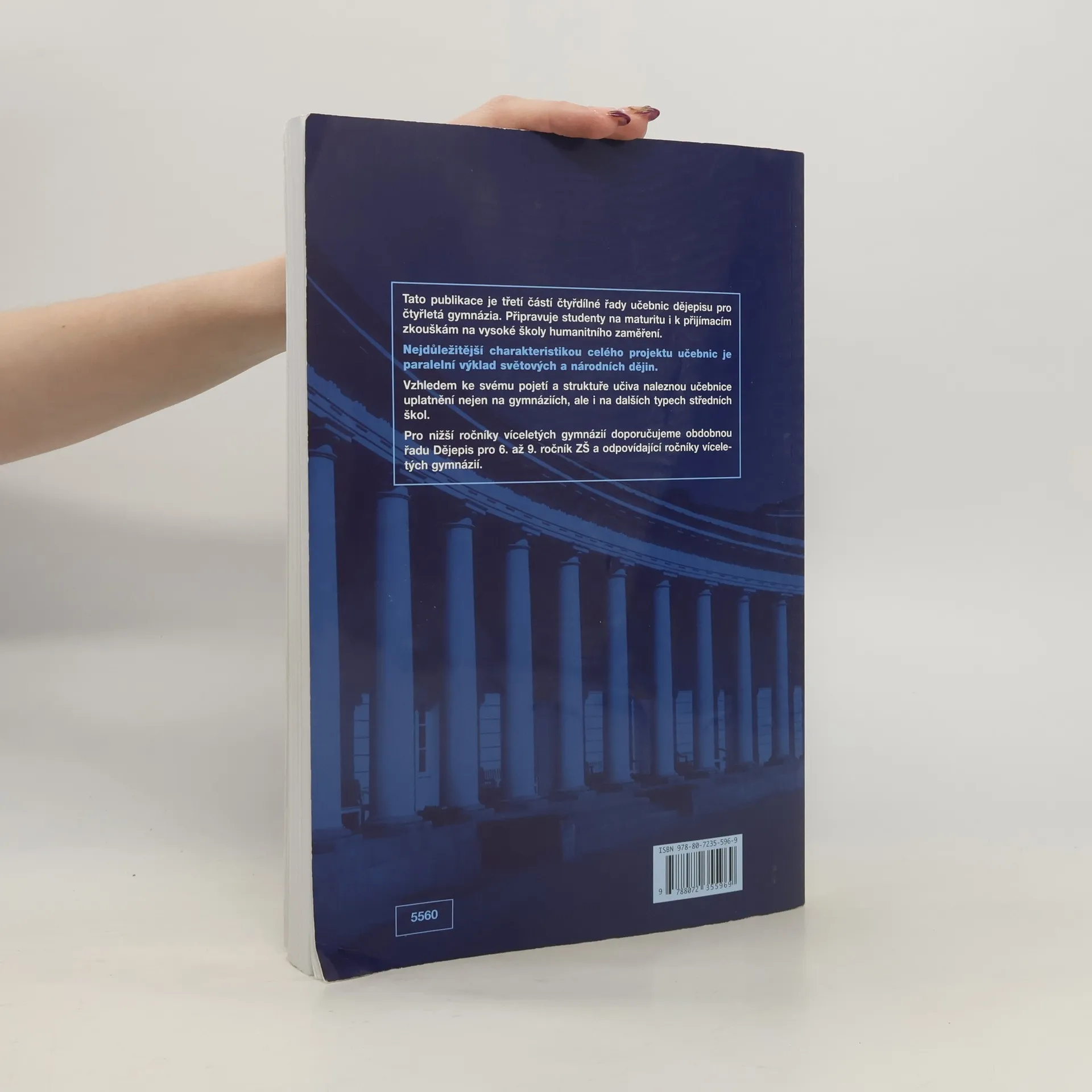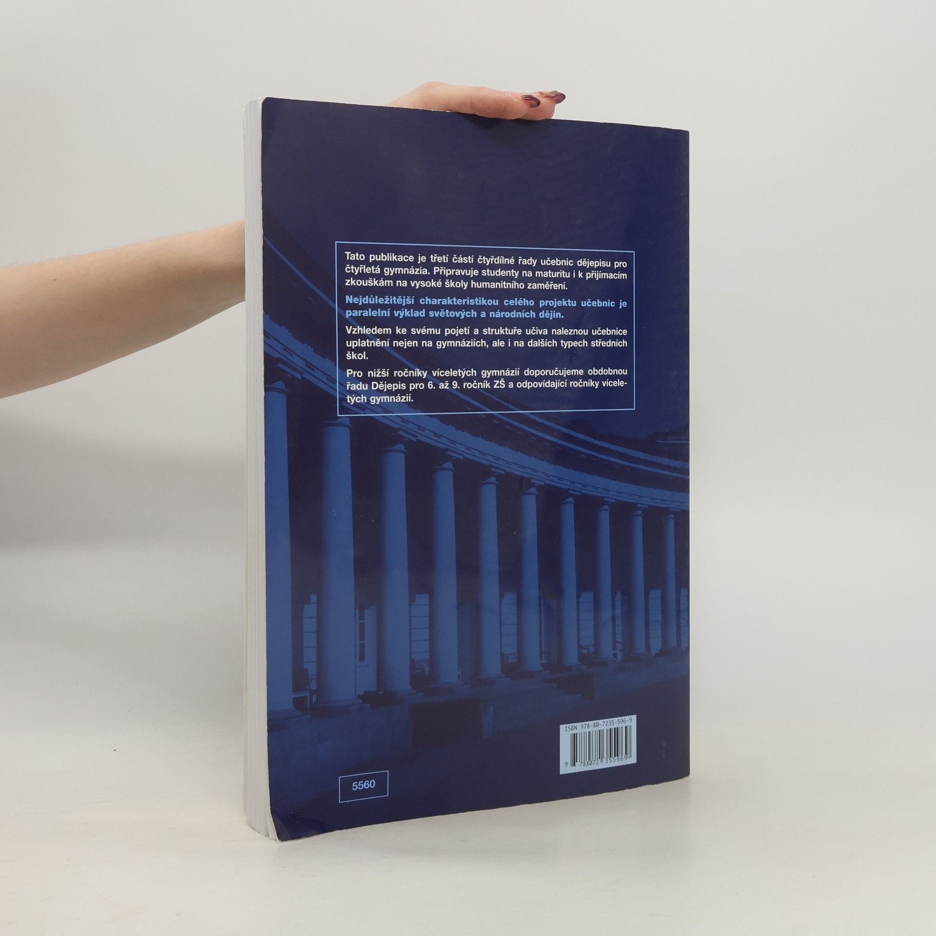 Třetí z řady učebnic dějepisu pro gymnázia a střední školy – uplatní se především na gymnáziích, ale i na dalších typech škol, neboť je v učebnicích graficky odlišen základní výklad od rozšiřujícího textu. Vzhledem k rozvržení učiva s důrazem na nové dějiny umožňuje i dobrou přípravu na VŠ. Kladem řady je její nepřetíženost fakty a především paralelně vedený výklad světových i českých dějin od nejstarších dob po současnost. Učebnice obsahují bohatý obrazový materiál, početné dějepisné mapy a náležitý didaktický aparát. Přední východ ●., Egypt ●., starověké Řecko ●., starověký Řím ●., Indie ●., Čína