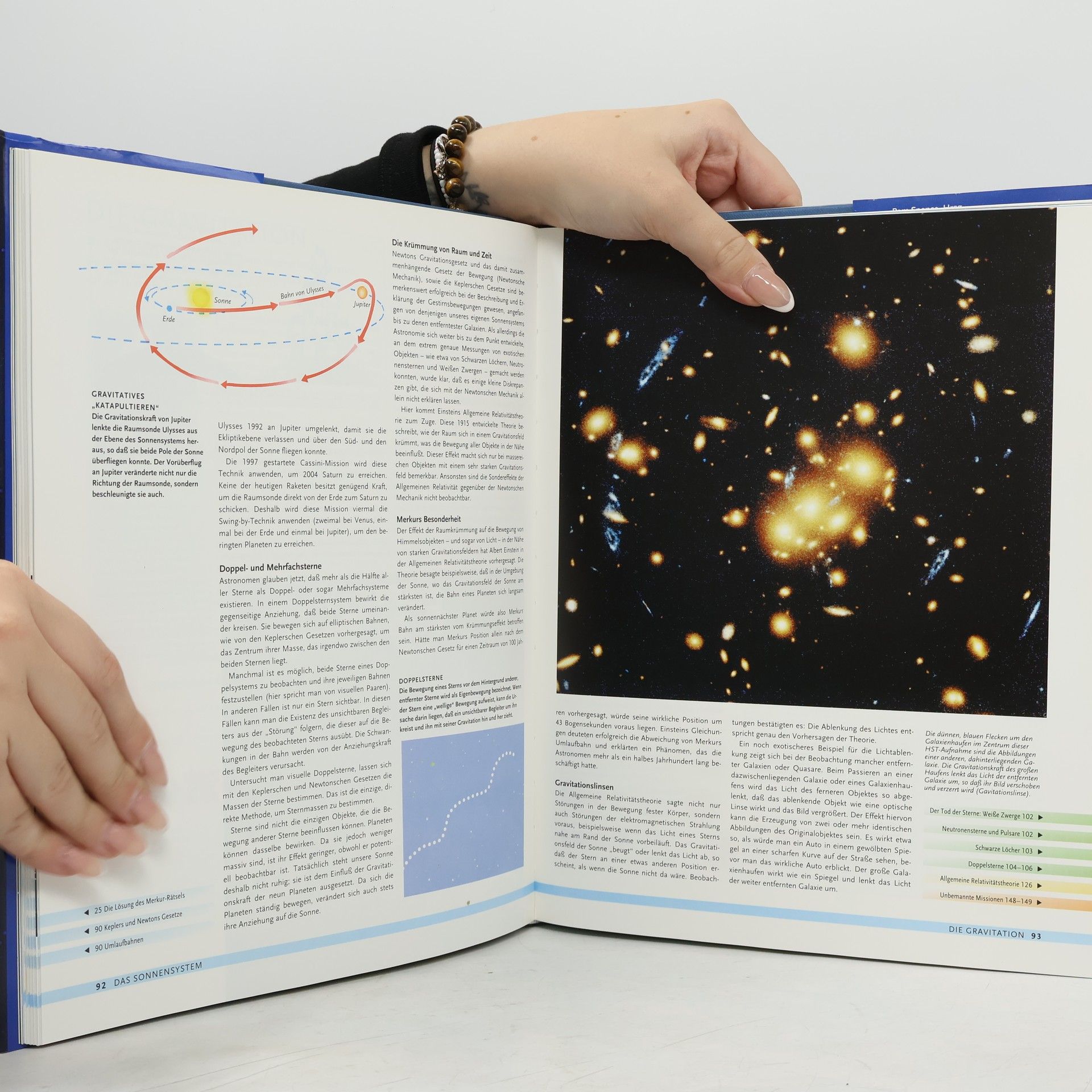 Das Buch beginnt mit einer ausführlichen Reise durch das Sonnensystem, informiert über die Sonne, die Planeten, über Kometen und Asteroiden. Weiter hinaus geht es dann in die Welt der Sterne (Weiße Zwerge, Rote Riesen, Supernovae, Schwarze Löcher u.a.) und Galaxien und die großräumigen Strukturen des Universums. Nächstes Thema sind aktuelle Fragen der Kosmologie und die modernen Forschungsmethoden der Astronomie. Zum Schluß folgt anhand detaillierter Sternkarten eine Einführung in die praktische Himmelsbeobachtung. Das Buch ist großzügig illustriert, die Abbildungen von hervorragender Qualität, und zahlreiche Querverweise im Text ermöglichen eine sinnvolle Lektüre auch außerhalb der vorgegebenen Reihenfolge der Kapitel. Ein direkt vergleichbarer Titel liegt seit längerer Zeit nicht vor. Eine überaus empfehlenswerte Einführung in die Welt der Astronomie, die mit Sicherheit auch viele Jugendliche ansprechen wird. (1 J).