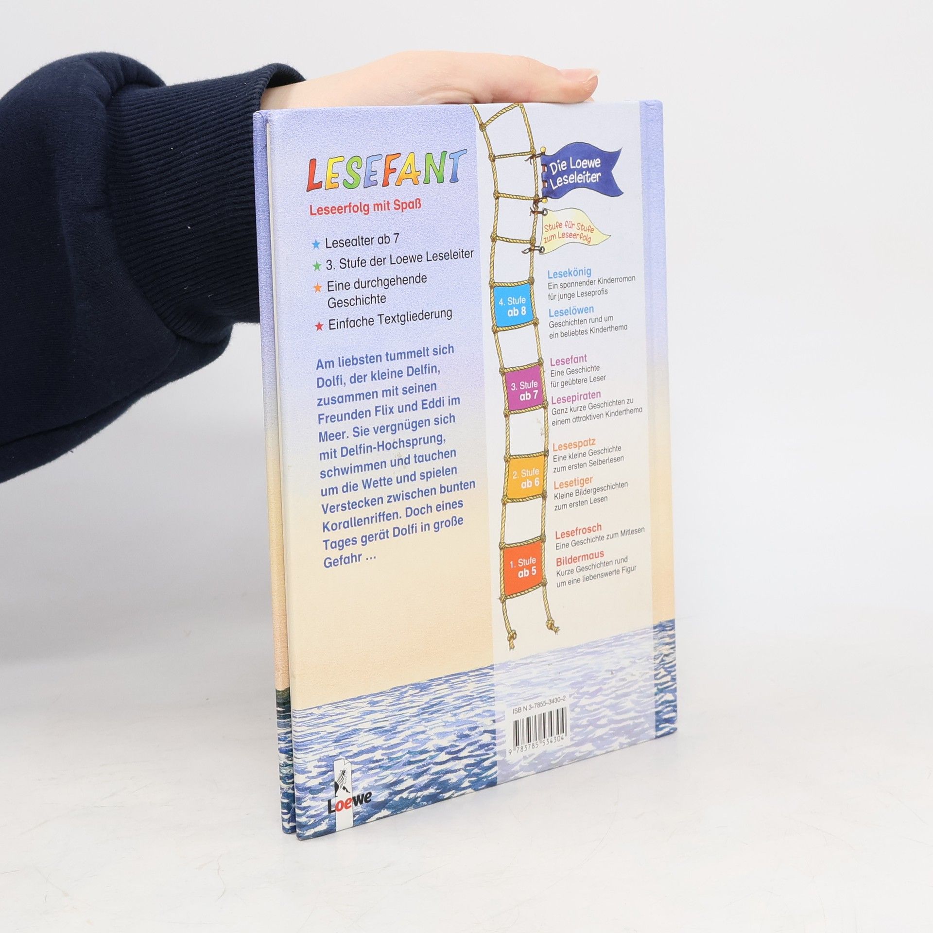 Lesealter ab 7 3. Stufe der Loewe-Leseleiter Eine durchgehende Geschichte Einfache Textgliederung Am liebsten tummelt sich Dolfi, der kleine Delfin, zusammen mit seinen Freunden Flix und Eddi im Meer. Sie vergnügen sich mit Delfin-Hochsprung, schwimmen und tauchen um die Wette und spielen Verstecken zwischen bunten Korallenriffen. Doch eines Tages gerät Dolfi in große Gefahr.