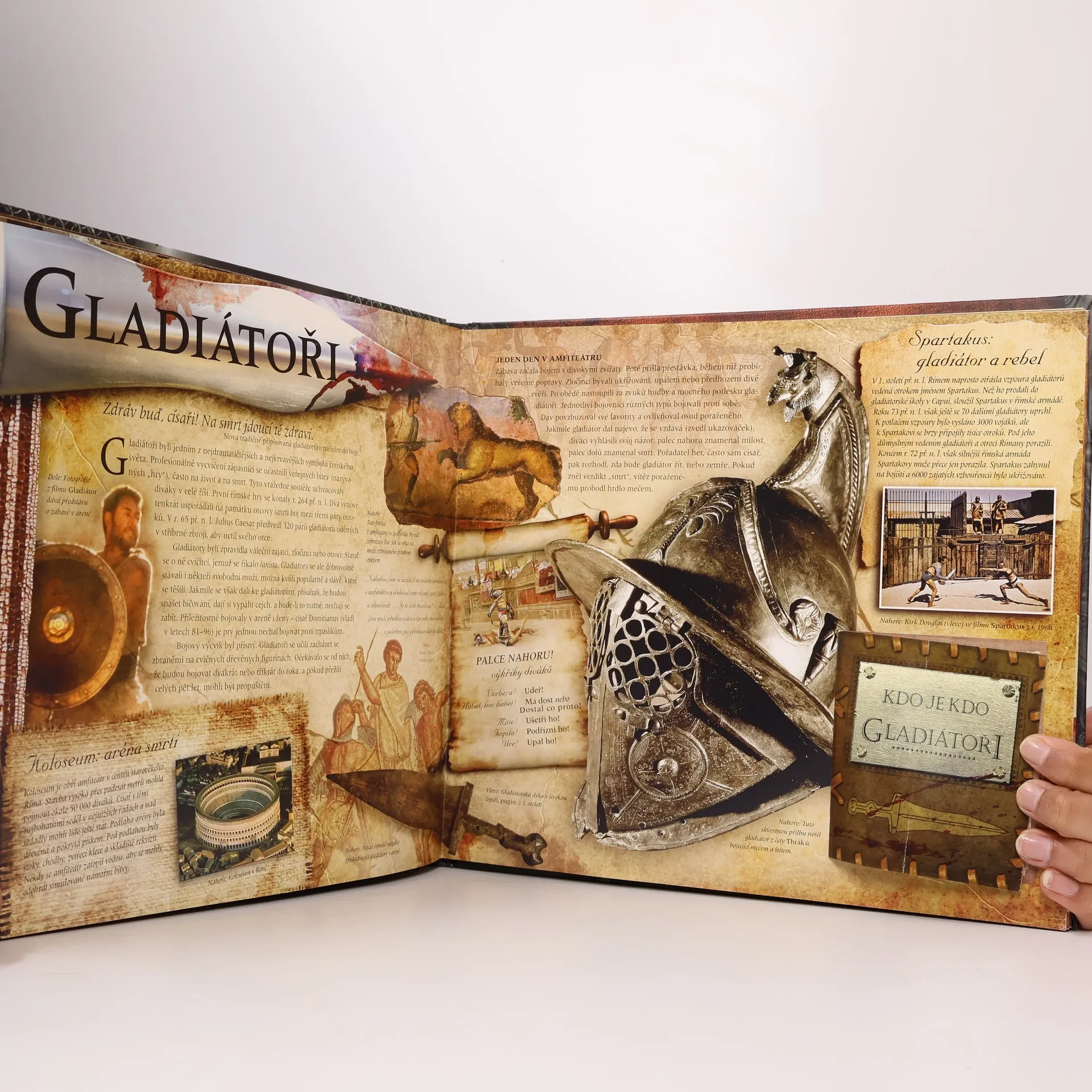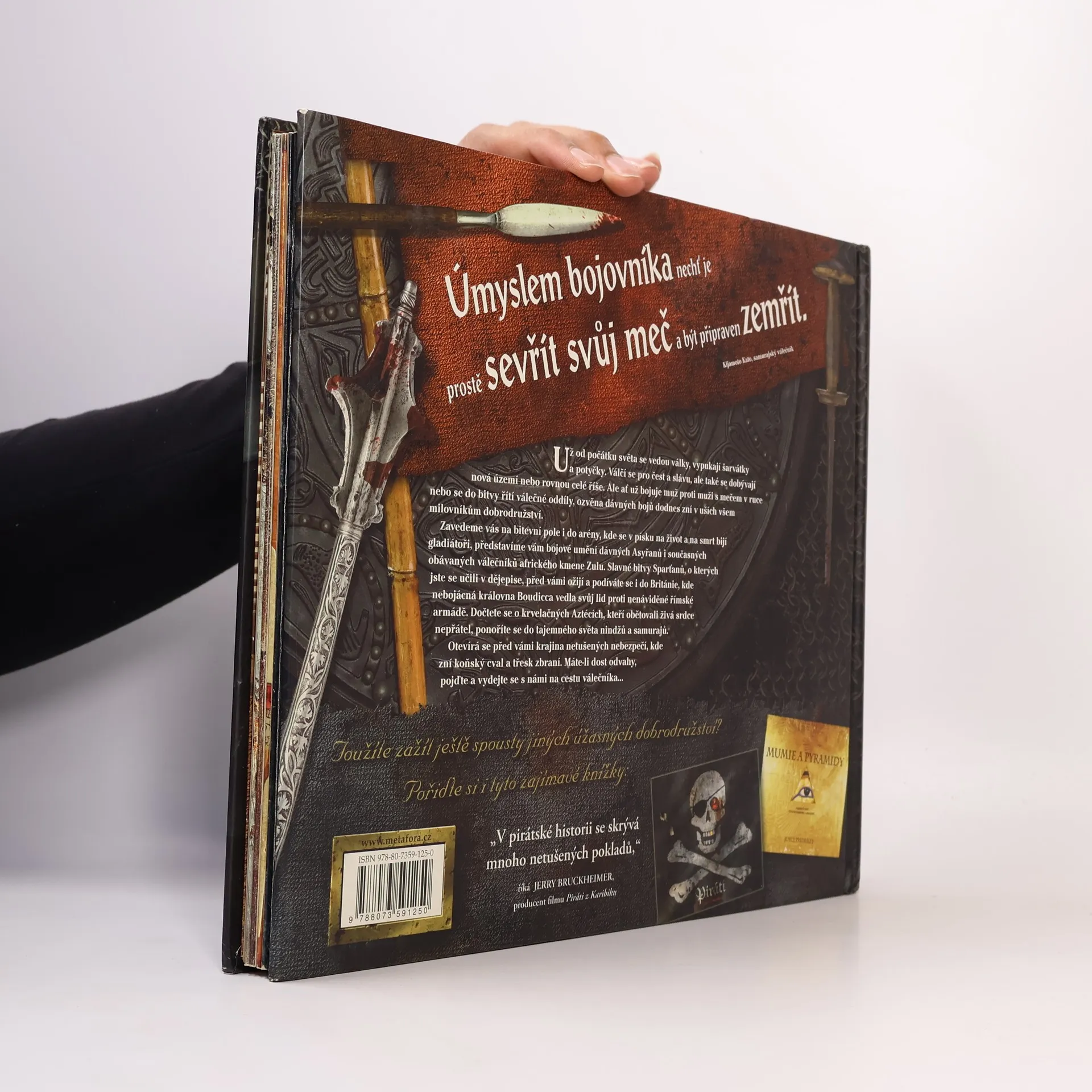 Už od počátku světa se vedou války, vypukají šarvátky a potyčky. Ale ať už bojuje muž proti muži s mečem v ruce nebo se do bitvy řítí válečné oddíly, ozvěna dávných bojů dodnes zní v uších všem milovníkům dobrodružství. Zavedeme vás na bitevní pole i do arény, kde se na život a na smrt bijí gladiátoři, představíme vám bojové umění dávných Asyřanů i současných obávaných válečníků afrického kmene Zulu. Slavné bitvy Sparťanů, o kterých jste se učili v dějepise, před vámi ožijí, dočtete se o krvelačných Aztécích, kteří obětovali živá srdce nepřátel, ponoříte se do tajemného světa nindžů a samurajů. Abyste si ale nemuseli jen číst, jsou pro vás připraveny nejrůznější hříčky a překvapení, které z téhle knížky dělají současně zábavnou hračku plnou nádherných realistických ilustrací. Přesto se Bojovníci nehodí zdaleka jen pro mládež, ale potěší i srdce mnoha dospělých. Přeložil Petr Mikolášek.