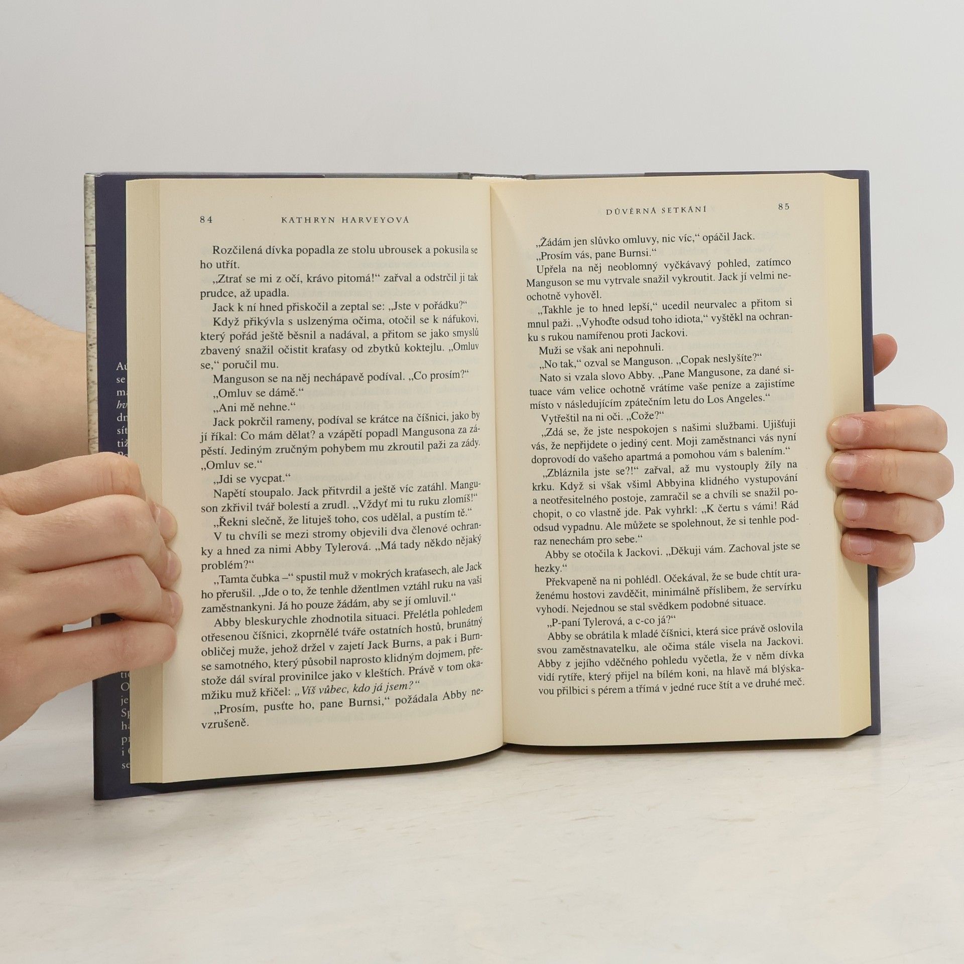 Autorka Barbara Woodová, známá díky románům jako Nespoutané sny a Kruté hvězdy, napsala pod pseudonymem K. Harveyová více než dvacet titulů, které se staly bestsellery a získaly mezinárodní ocenění. Její nejnovější román, Důvěrná setkání, se odehrává v luxusním rekreačním středisku Oáza v kalifornské poušti, kam se lze dostat pouze letadlem. Toto místo, kde je rozkoš prioritou, je domovem tří žen - Coco, Sissy a Ophelia - které se sem dostaly díky neznámé soutěži, o jejíž účasti nemají tušení. Spojuje je tajemný plán hlavní hrdinky, Abby Tylerové, majitelky Oázy, která se snaží najít své dítě, jež jí bylo ukradeno při porodu. Aby se s ním znovu shledala a uzavřela dlouholetou bolest, musí čelit své minulosti. Situace se zkomplikuje s příchodem písečné bouře a najatého vraha, který má své vlastní úmysly. Příběh kombinuje napínavou detektivní zápletku s romantickými a erotickými prvky, které provázejí vývoj vztahů postav. Kathryn Harveyová opět dokazuje svůj talent a schopnost zaujmout čtenáře.