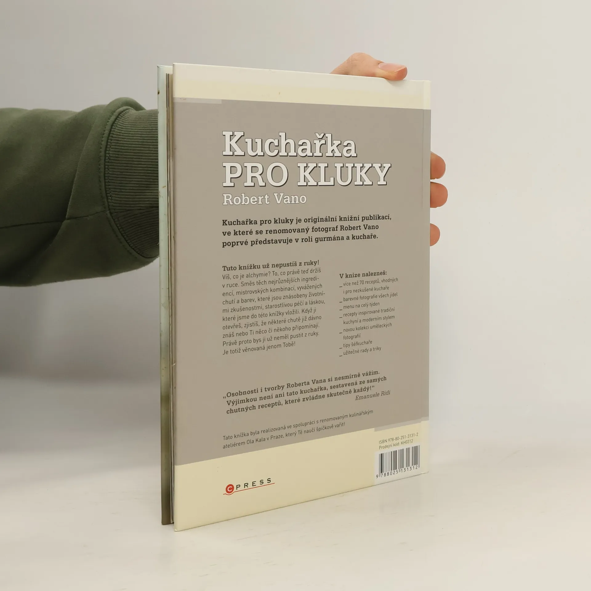 S podtitulem: Robert Vano v roli gurmána a kuchaře Kuchařka pro kluky je originální knižní publikací, ve které se renomovaný fotograf Robert Vano poprvé představuje v roli gurmána a kuchaře. Tuto knížku už nepustíš z ruky! Víš, co je alchymie? To, co právě teď držíš v ruce. Směs těch nejrůznějších ingrediencí, mistrovských kombinací, vyvážených chutí a barev, které jsou znásobeny životními zkušenostmi, starostlivou péčí a láskou, které jsme do této knížky vložili. Když ji otevřeš, zjistíš, že některé chutě již dávno znáš nebo Ti něco či někoho připomínají. Právě proto bys ji už neměl pustit z ruky. Je totiž věnovaná jenom Tobě! V knize nalezneš: * více než 70 receptů, vhodných i pro nezkušené kuchaře * barevné fotografie všech jídel * menu na celý týden * recepty inspirované tradiční kuchyní a moderním stylem * novou kolekci uměleckých fotografií * tipy šéfkuchaře * užitečné rady a triky „Osobnosti i tvorby Roberta Vana si nesmírně vážím. Výjimkou není ani tato kuchařka, sestavená ze samých chutných receptů, které zvládne skutečně každý!“ Emanuele Ridi Tato knížka byla realizovaná ve spolupráci s renomovaným kulinářským ateliérem Ola Kala v Praze, který Tě naučí špičkově vařit!