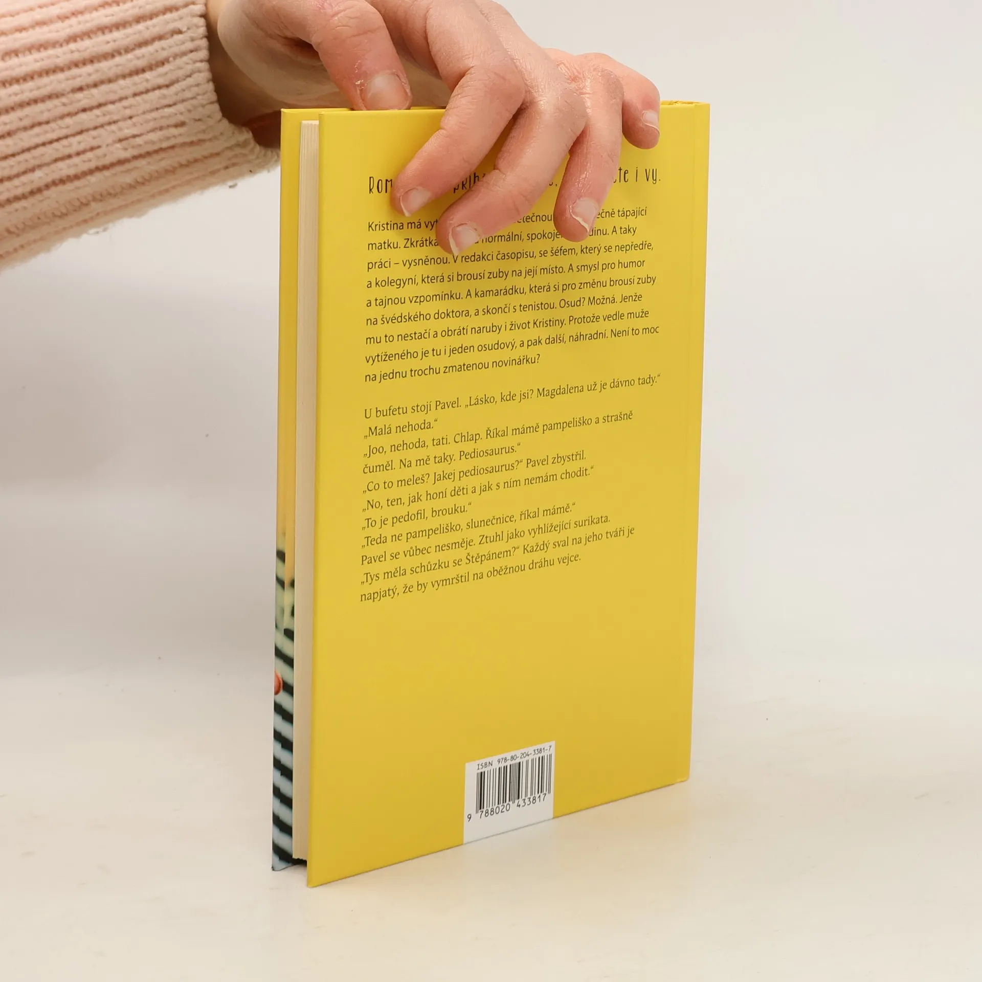 Romantický příběh o životě, jaký žijete i vy. Kristina má vytíženého muže, všetečnou dcerku i věčně tápající matku. Zkrátka takovou normální, spokojenou rodinu. A taky práci – vysněnou. V redakcičasopisu, se šéfem, který se nepředře, a kolegyní, která si brousí zuby na její místo. A smysl pro humor a tajnou vzpomínku. A kamarádku, která si pro změnu brousí zuby na švédského doktora, a skončí s tenistou. Osud? Možná.Jenže mu to nestačí a obrátí naruby i život Kristiny. Protože vedle muže vytíženého je tu i jeden osudový, a pak další, náhradní. Není toho moc na jednu lehce zmatenou novinářku? U bufetu stojí Pavel. „Lásko, kde jsi? Magdalena už je dávno tady.“ „Malá nehoda.“ „Joo, nehoda, tati. Chlap. Říkal mámě pampeliško a strašně čuměl. Na mě taky. Pediosaurus.“ „Co to meleš? Jakej pediosaurus?“ Pavel zbystřil. „No, ten, jak honí děti a jak s ním nemám chodit.“ „To je pedofil, brouku.“ „Teda ne pampeliško, slunečnice, říkal mámě.“ Pavel se vůbec nesměje. Ztuhl jako vyhlížející surikata. „Tys měla schůzku se Štěpánem?“ Každý sval na jeho tváři je napjatý, že by vymrštil na oběžnou dráhu vejce.