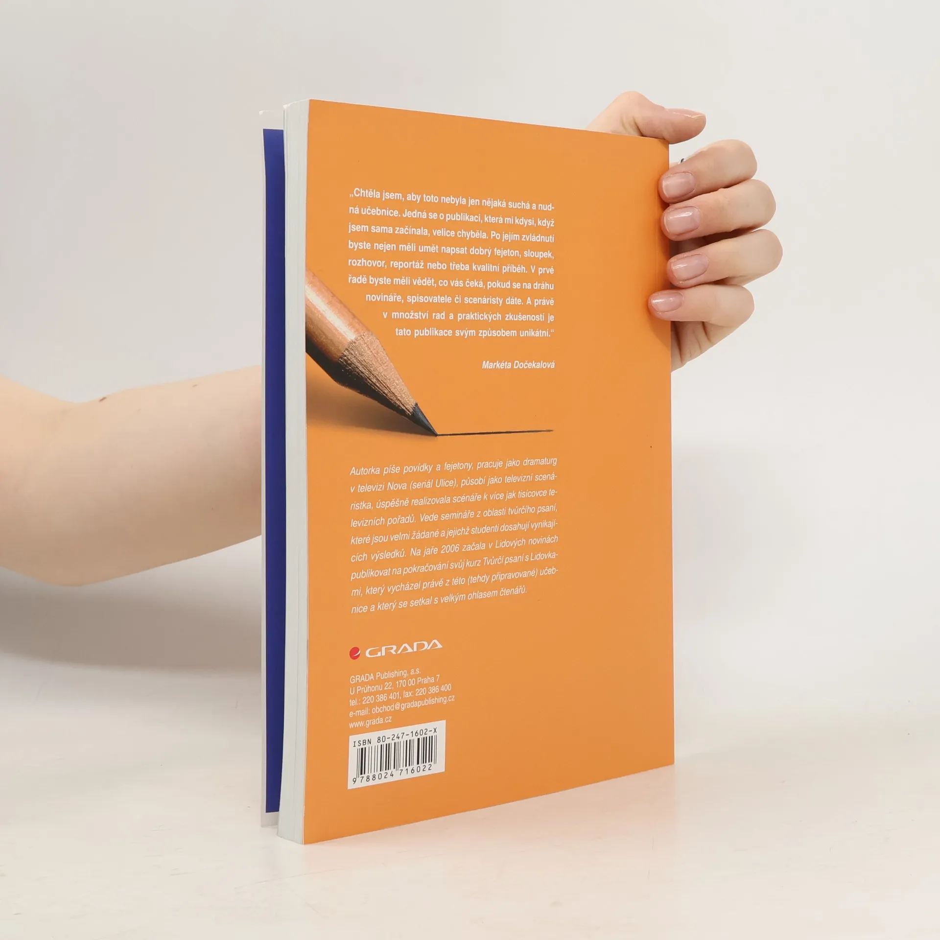 Čtenář se naučí psát a pracovat se svým tvůrčím potenciálem, pozná základní novinářské žánry i principy tvorby příběhů, stavby postav, zvládnutí dialogů a další aspekty tvůrčího psaní. Jde o ryze praktickou a moderní učebnici tvůrčího psaní, která je obohacena o celou řadu praktických cvičení umožňujích čtenářům ověření získaných znalostí a dovedností. Autorka vede semináře z oblasti tvůrčího psaní, které jsou velmi žádané a jejichž studenti dosahují vynikajících výsledků. Na jaře 2006 začala v Lidových novinách publikovat na pokračování svůj kurz Tvůrčí psaní s Lidovkami, který vycházel právě z této (tehdy připravované) učebnice a který se setkal s velkým ohlasem čtenářů. Kromě psaní povídek a fejetonů, pracuje jako dramaturg v televizi Nova (seriál Ulice), působí jako televizní scenáristka, úspěšně realizovala scénáře k více jak tisícovce televizních pořadů.... celý text