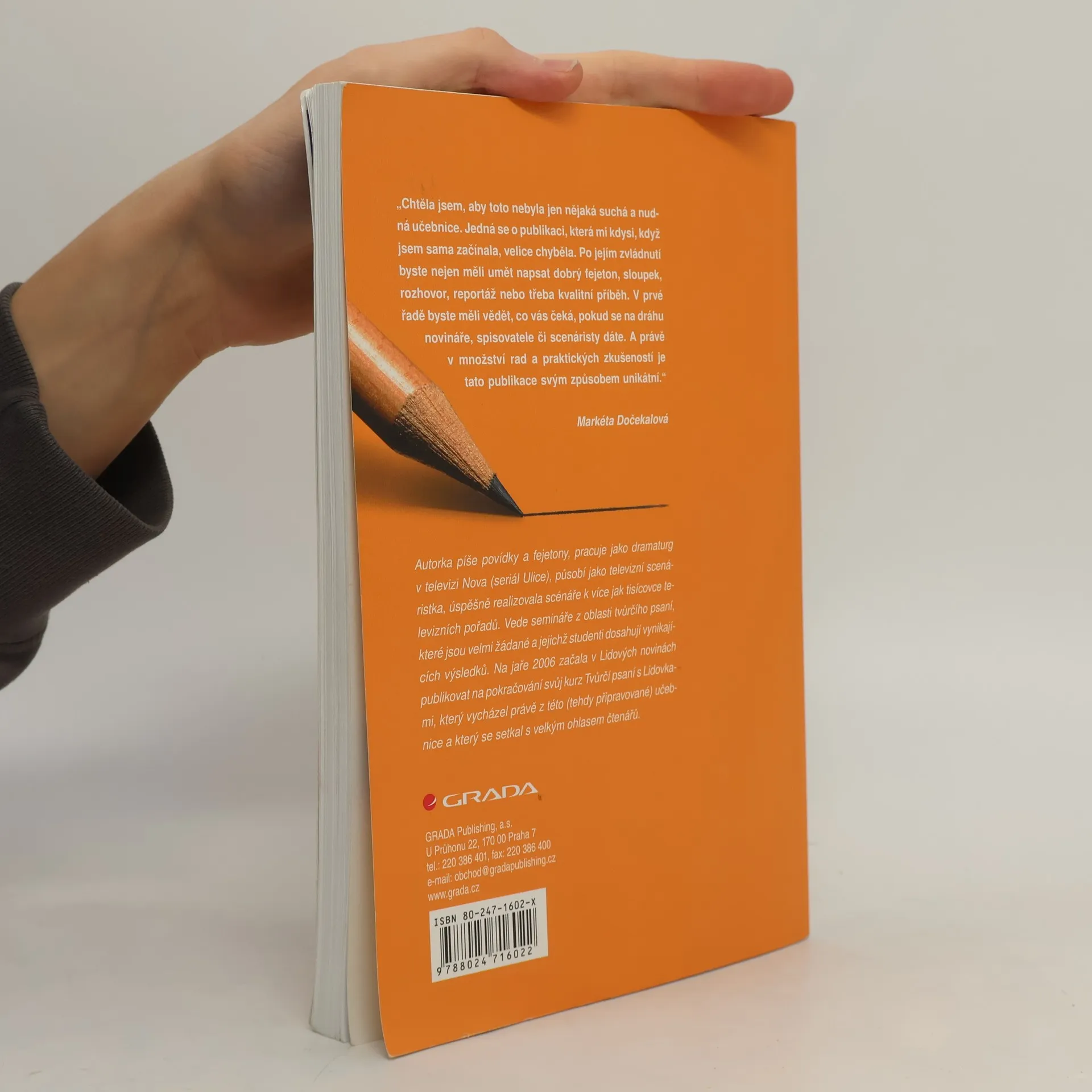 Čtenář se naučí psát a pracovat se svým tvůrčím potenciálem, pozná základní novinářské žánry i principy tvorby příběhů, stavby postav, zvládnutí dialogů a další aspekty tvůrčího psaní. Jde o ryze praktickou a moderní učebnici tvůrčího psaní, která je obohacena o celou řadu praktických cvičení umožňujích čtenářům ověření získaných znalostí a dovedností. Autorka vede semináře z oblasti tvůrčího psaní, které jsou velmi žádané a jejichž studenti dosahují vynikajících výsledků. Na jaře 2006 začala v Lidových novinách publikovat na pokračování svůj kurz Tvůrčí psaní s Lidovkami, který vycházel právě z této (tehdy připravované) učebnice a který se setkal s velkým ohlasem čtenářů. Kromě psaní povídek a fejetonů, pracuje jako dramaturg v televizi Nova (seriál Ulice), působí jako televizní scenáristka, úspěšně realizovala scénáře k více jak tisícovce televizních pořadů.... celý text