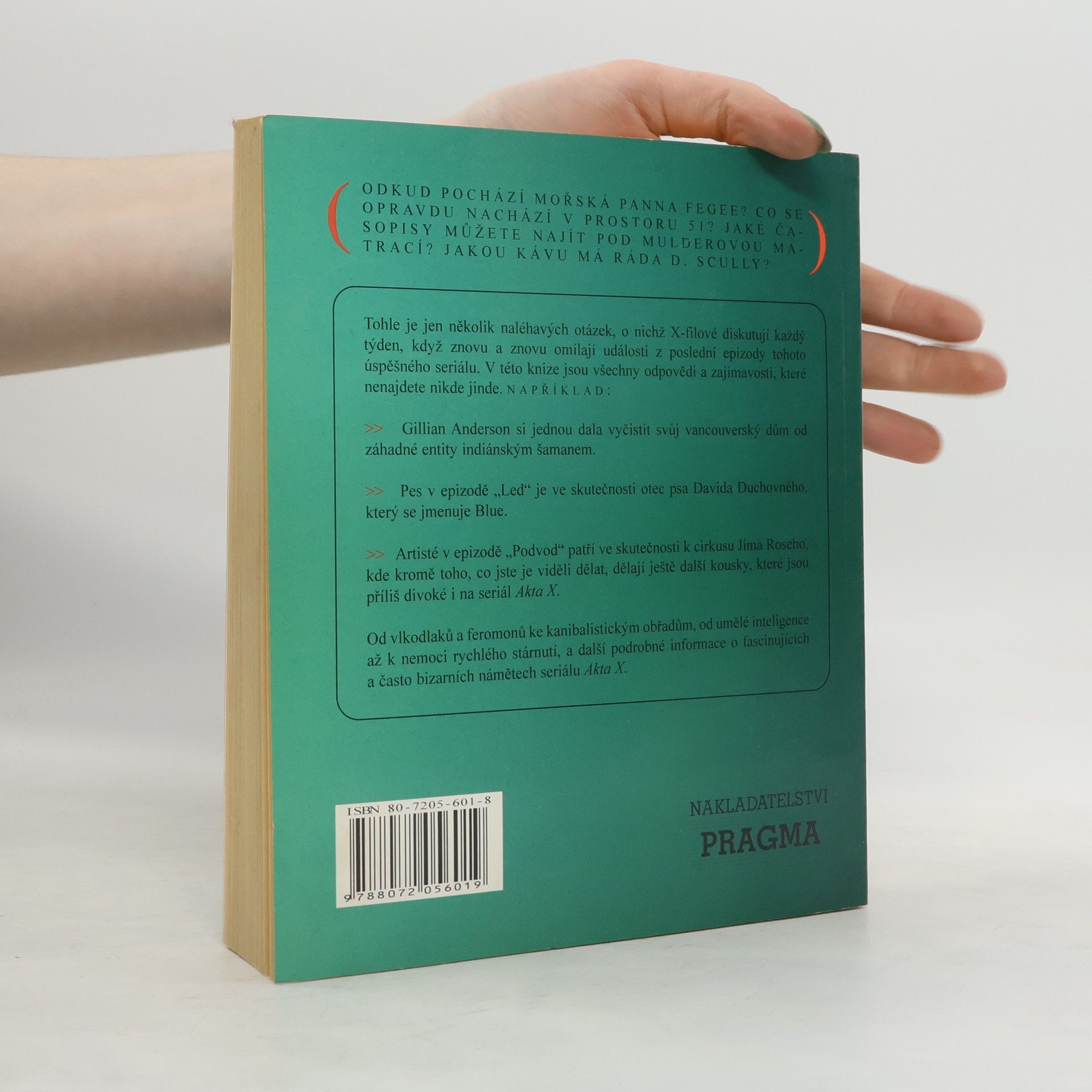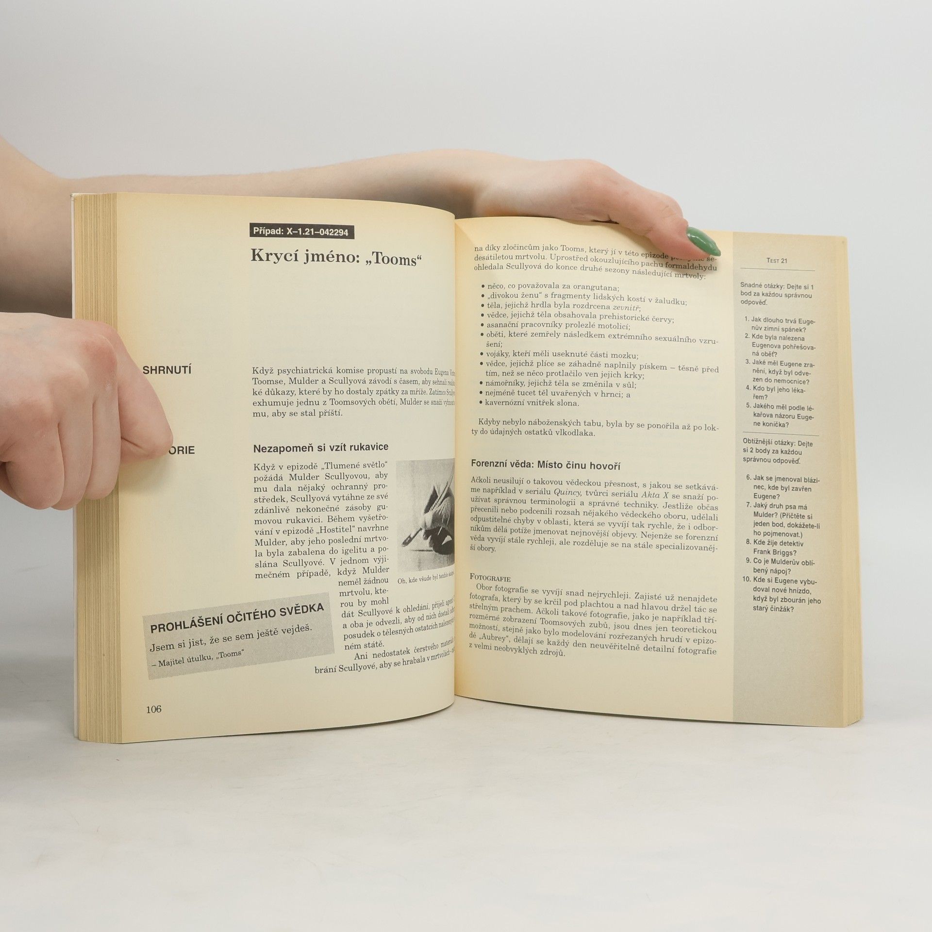 Od vlkodlaků a feromonů ke kanibalistickým obřadům, od umělé inteligence až k nemoci rychlého stárnutí a další podrobné informace o fascinujících a často bizardních námětech seriálu Akta X. Průvodce televizním seriálem Akta X spojený s testem znalosti jednotlivých příběhů.