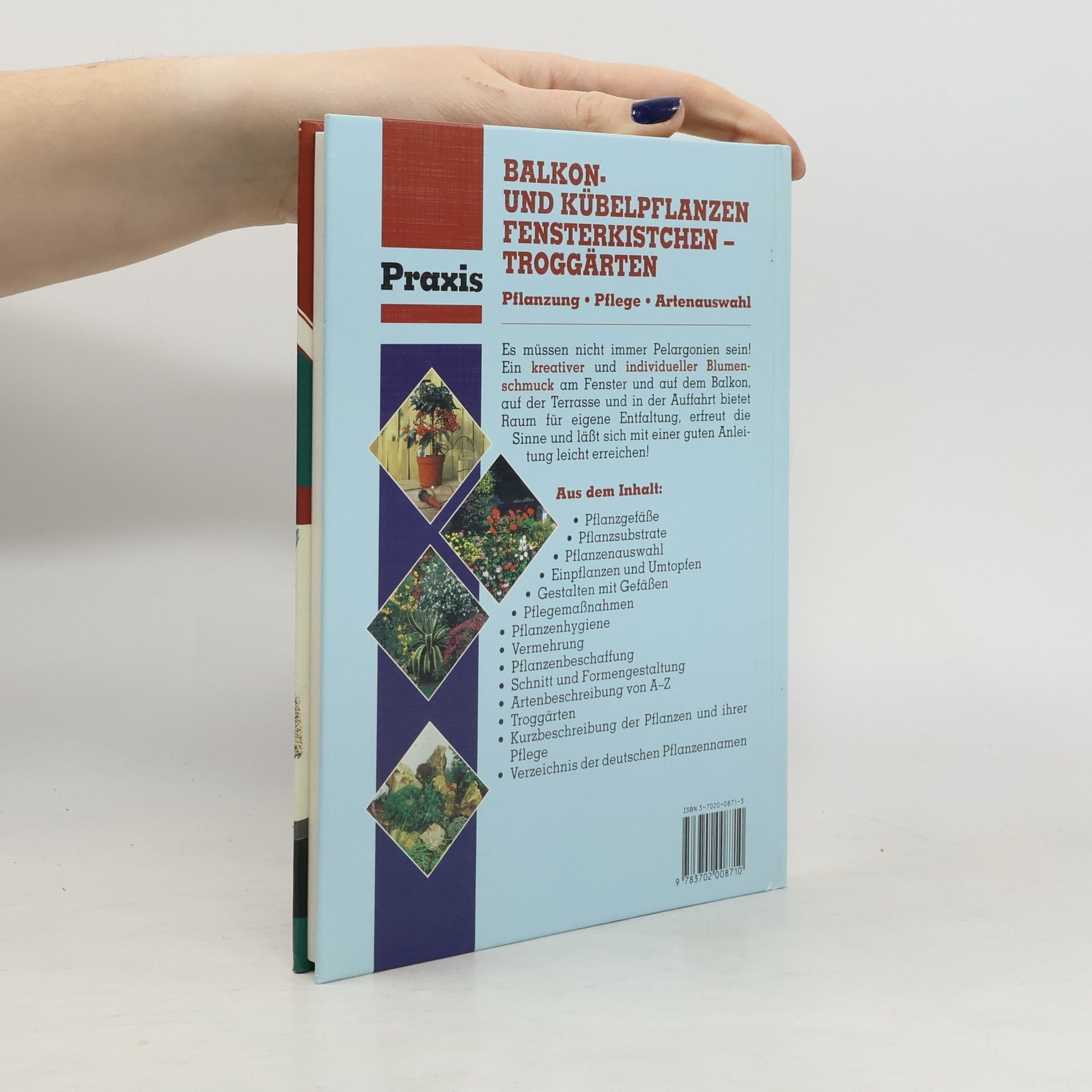 Skladem máme celkem knihy Balkon- und Kübelpflanzen, Fensterkistchen, Troggärten (2000).