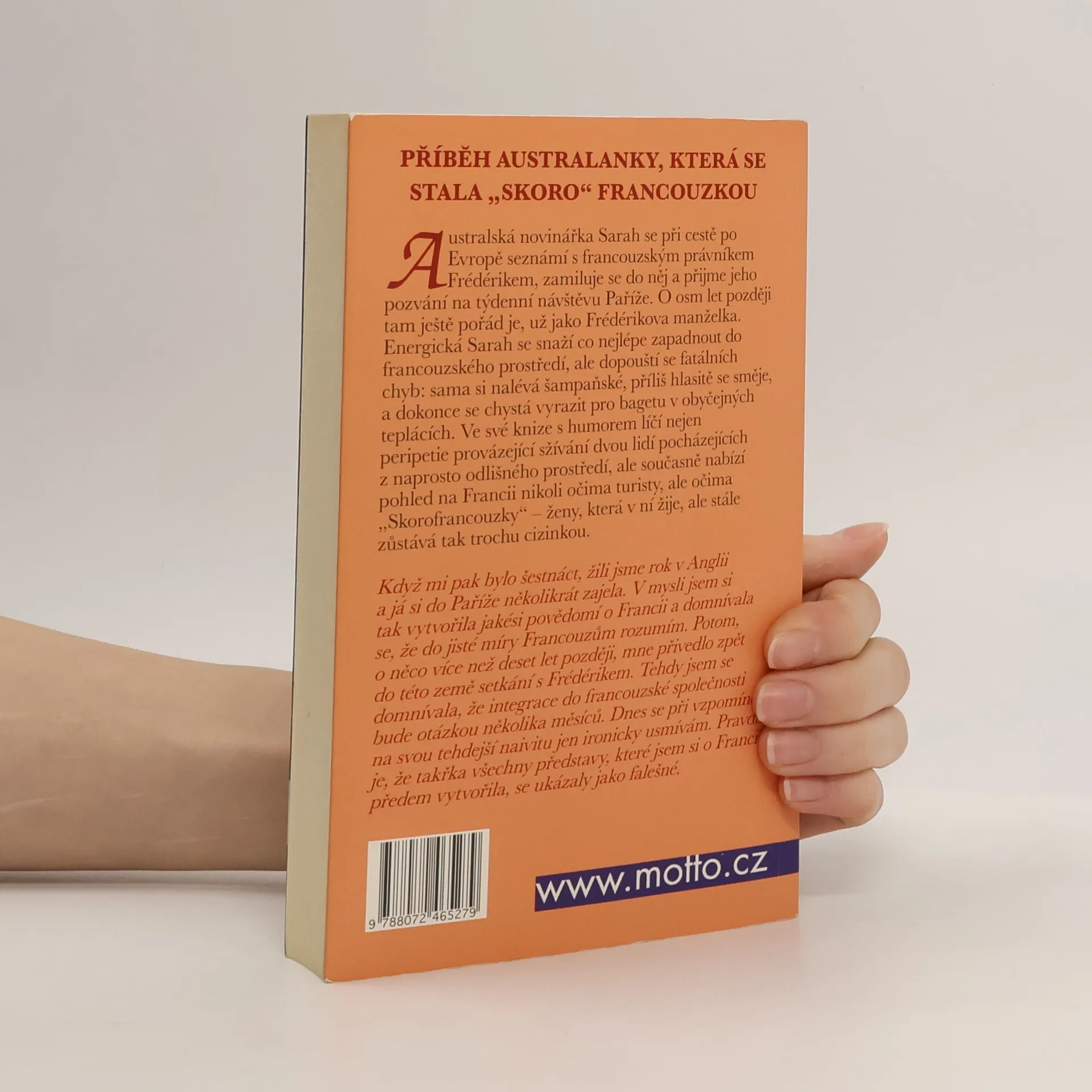 Příběh Australanky, která se stala „skoro“ Francouzkou. Australská novinářka Sarah se při cestě po Evropě seznámí s francouzským právníkem Frédérikem, zamiluje se do něj a přijme jeho pozvání na týdenní návštěvu Paříže. O osm let později tam ještě pořád je, už jako Frédérikova manželka. Energická Sarah se snaží co nejlépe zapadnout do francouzského prostředí, ale dopouští se fatálních chyb: sama si nalévá šampaňské, příliš hlasitě se směje, a dokonce se chystá vyrazit pro bagetu v obyčejných teplácích. Ve své knize s humorem líčí nejen peripetie provázející sžívání dvou lidí pocházejících z naprosto odlišného prostředí, ale současně nabízí pohled na Francii nikoli očima turisty, ale očima „Skorofrancouzky“ – ženy, která v ní žije, ale stále zůstává tak trochu cizinkou.