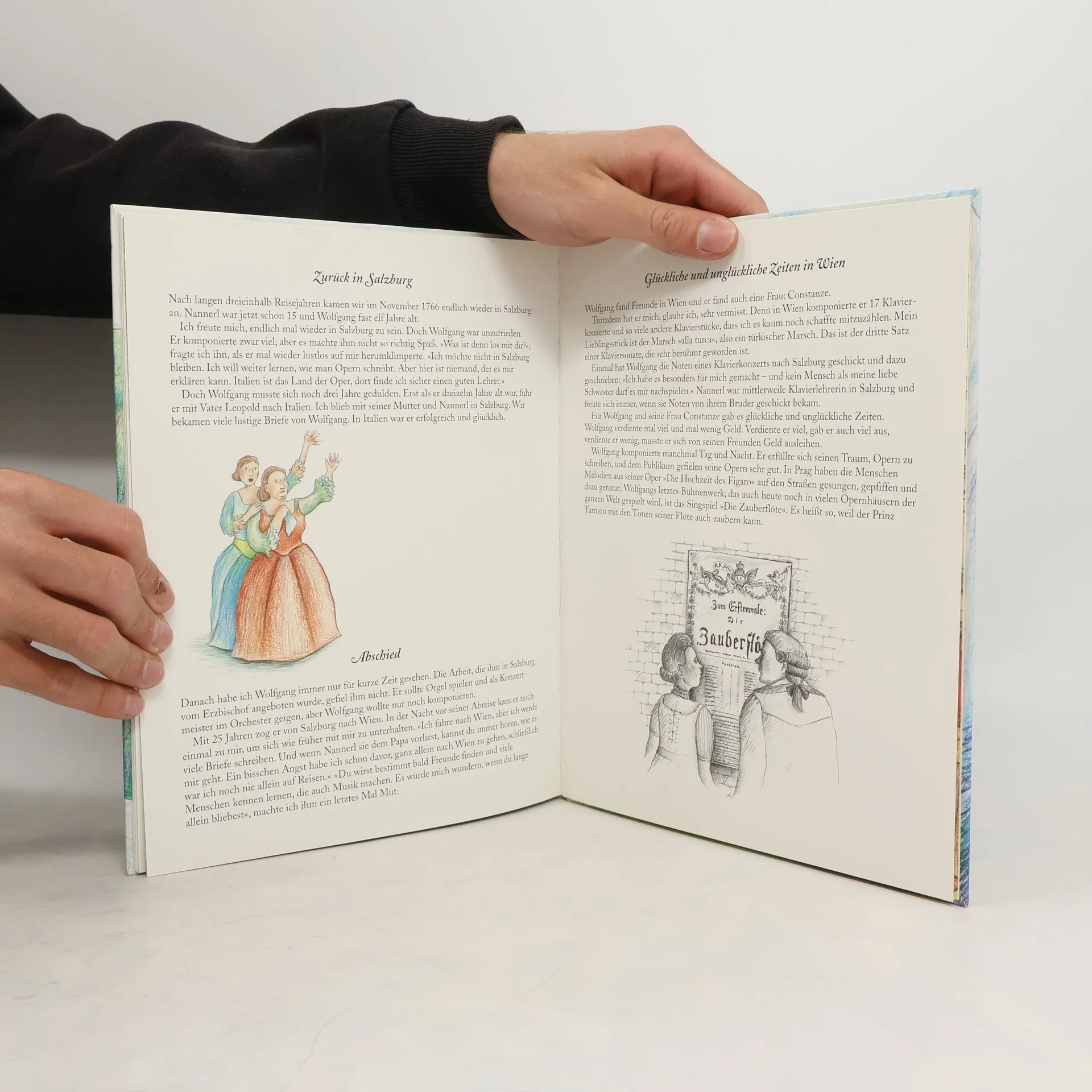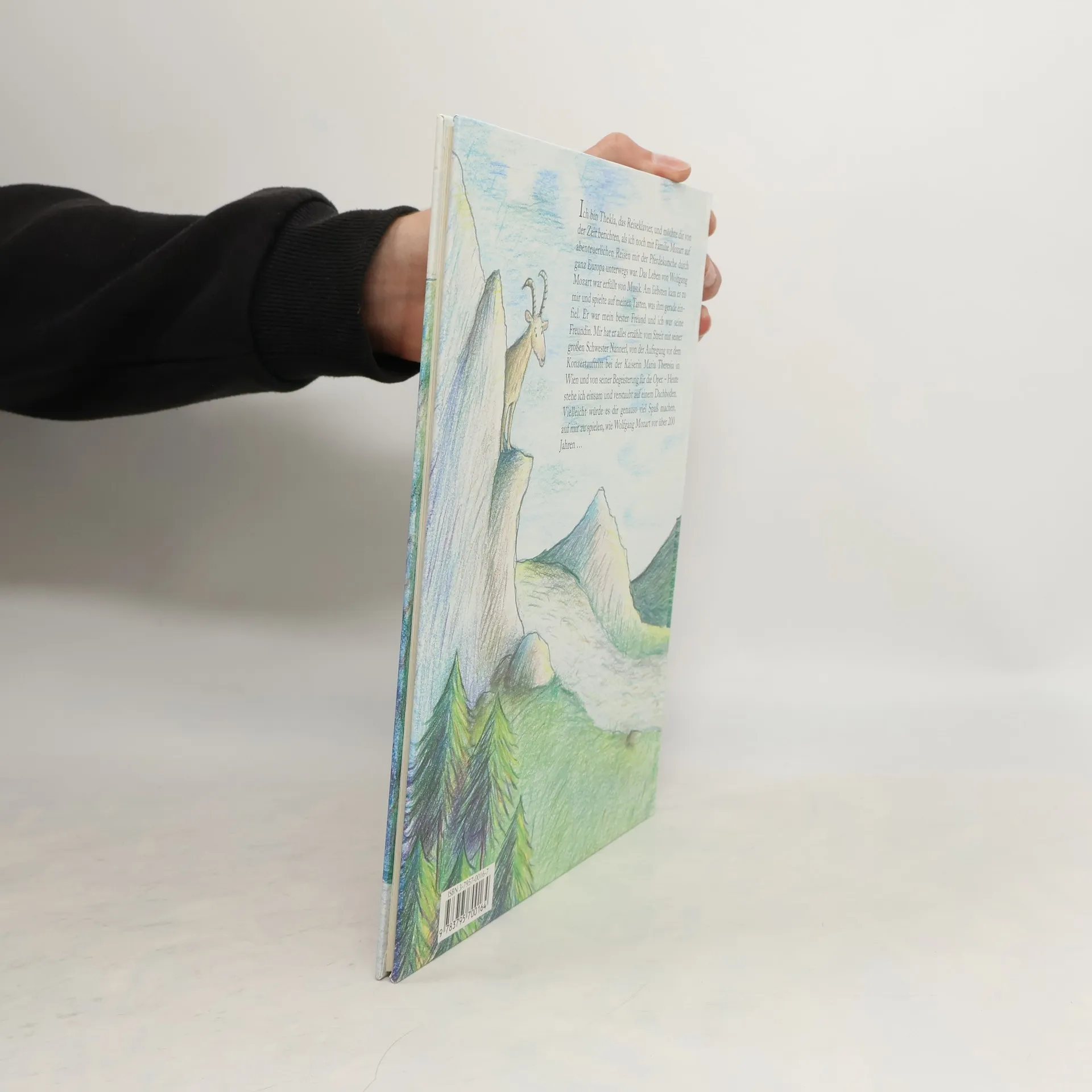 Thekla, the portable piano of the Mozart family, now gathering dust in a dark loft and remembering past – and better – times, has a lot to tell: when Wolfgang made his first composition attempts on the piano and father Leopold made the first great concert tours with Wolfgang and his sister Nannerl in a coach, about the concert performance of the children before Empress Maria Theresia in Vienna (1762), about the trip to Paris and the rough crossing to England, and, finally, about the return to Salzburg in 1766. Mozart is described as a boy who has quite ordinary problems, who gets homesick on his trips and who longs for friendship. In addition, the book gives a short preview of his further musical oeuvre. Numerous – sometimes full-page – pictures as well as an illustrated history of his life paint a colourful portrait of Mozart. With the help of a map, the reader can even follow Mozart's travel route.