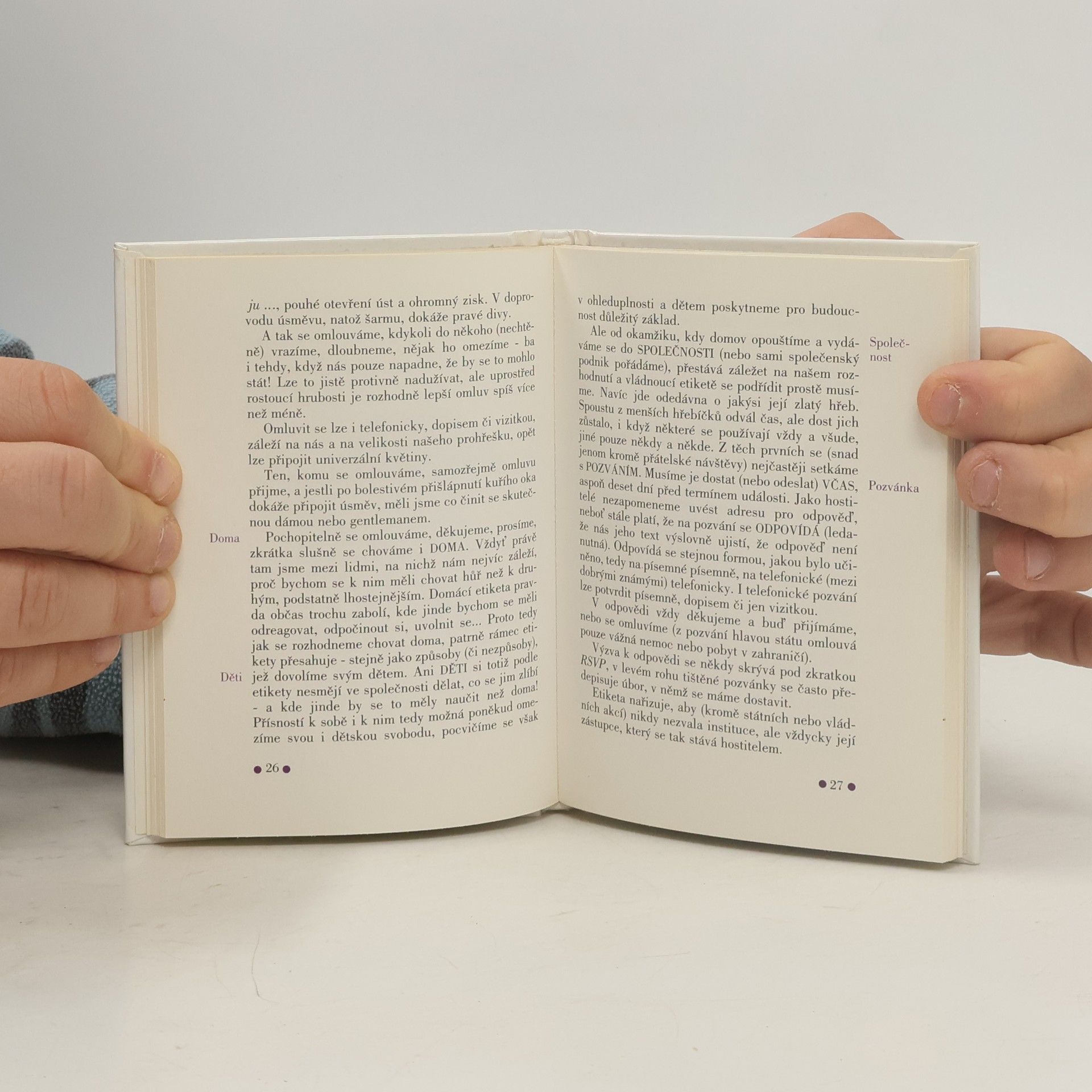 V knížce najdeme základní pravidla společenského chování pro malé i velké čtenáře. Komu kdy dát přednost, koho pozdravit první, jak se představovat, jak správně koho oslovovat, kdy komu nabídnout tykání, jak psát správně dopis, jaké oblečení zvolit do společnosti, jak se ve společnosti chovat, jak správně stolovat a další rady usnadní život každému, kdo chce ve společnosti obstát bez úhony a se ctí.
