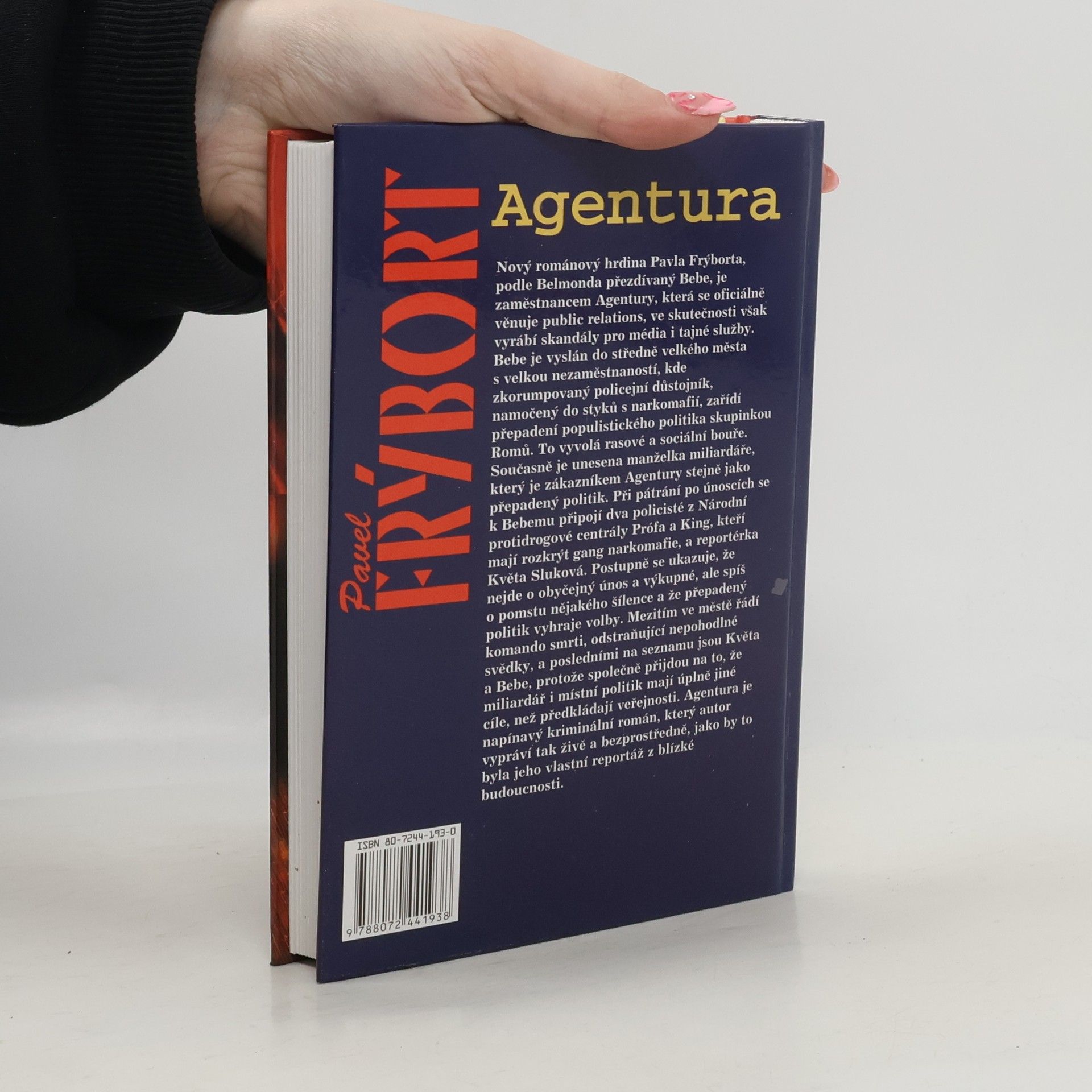 Nový románový hrdina Pavla Frýborta, podle Belmonda přezdívaný Bebe, je zaměstnancem Agentury, který se oficiálně věnuje public relations, ve skutečnosti však vyrábí skandály pro média a i tajné služby. Bebe je vyslán do středně velkého města s velkou nezaměstnaností, kde zkorumpovaný policejní důstojník, namočený do styků s narkomafií, zařídí přepadení populistického politika skupinou Romů. To vyvolá rasové a sociální bouře. Současně je unesena manželka miliardáře, který je zákazníkem Agentury stejně jako přepadený politik. Při pátrání po únoscích se k Bebemu připojí dva policisté z Národní protidrogové centrály Prófa a King, kteří mají rozkrýt gang narkomafie, a reportérka Květa Sluková. Postupně se ukazuje, že nejde o obyčejný únos a výkupné, ale spíš o pomstu nějakého šílence a že přepadený politik vyhraje volby. Mezitím ve městě řádí komando smrti, odstraňující nepohodlné svědky, a posledními na seznamu jsou Květa a Bebe, protože společně přijdou na to, že miliardář i místní politika mají úplně jiné cíle, než předkládají veřejnosti. Agentura je napínavý kriminální román, který autor vypráví tak živě a bezprostředně, jako by to byla jeho vlastní reportáž z blízké budoucnosti.
