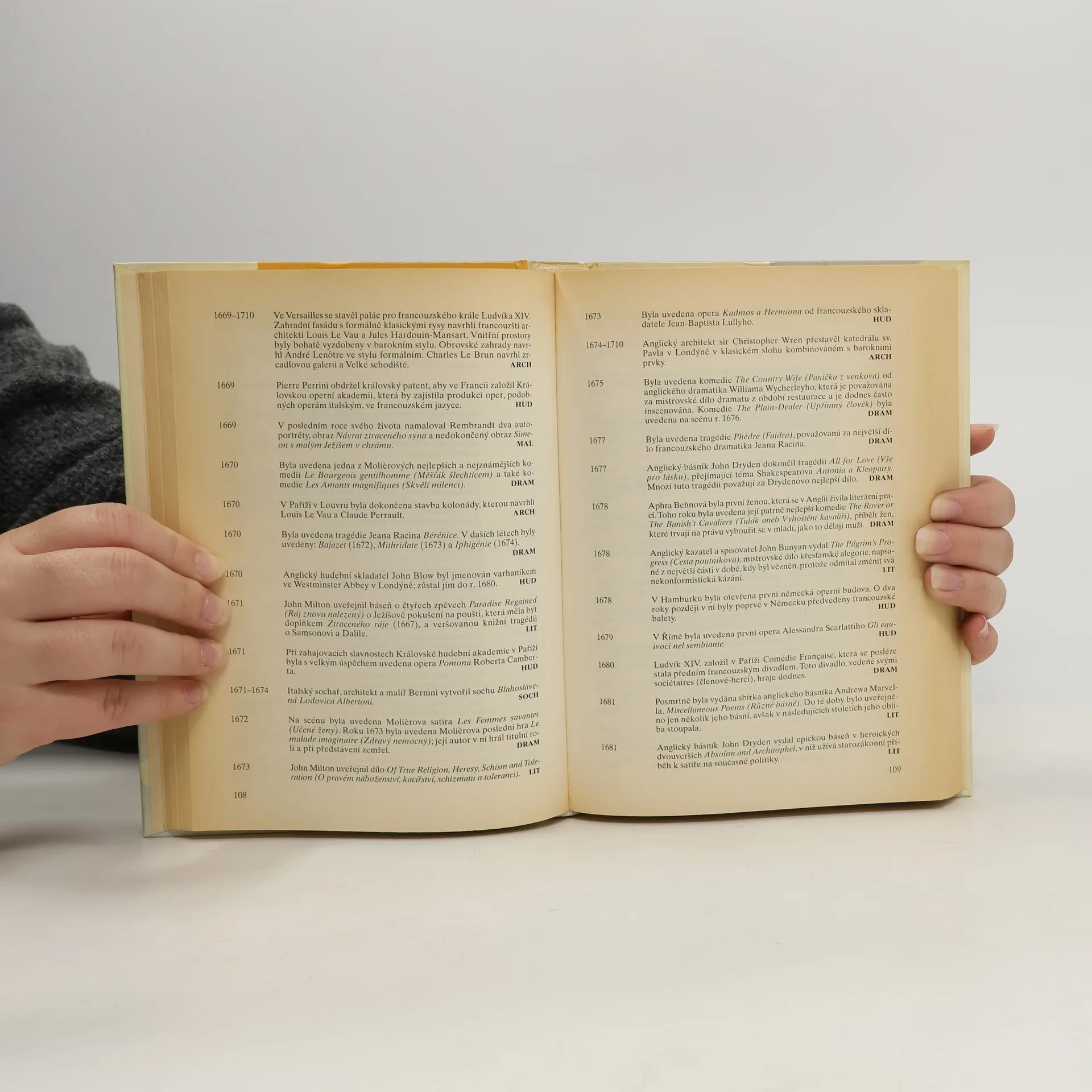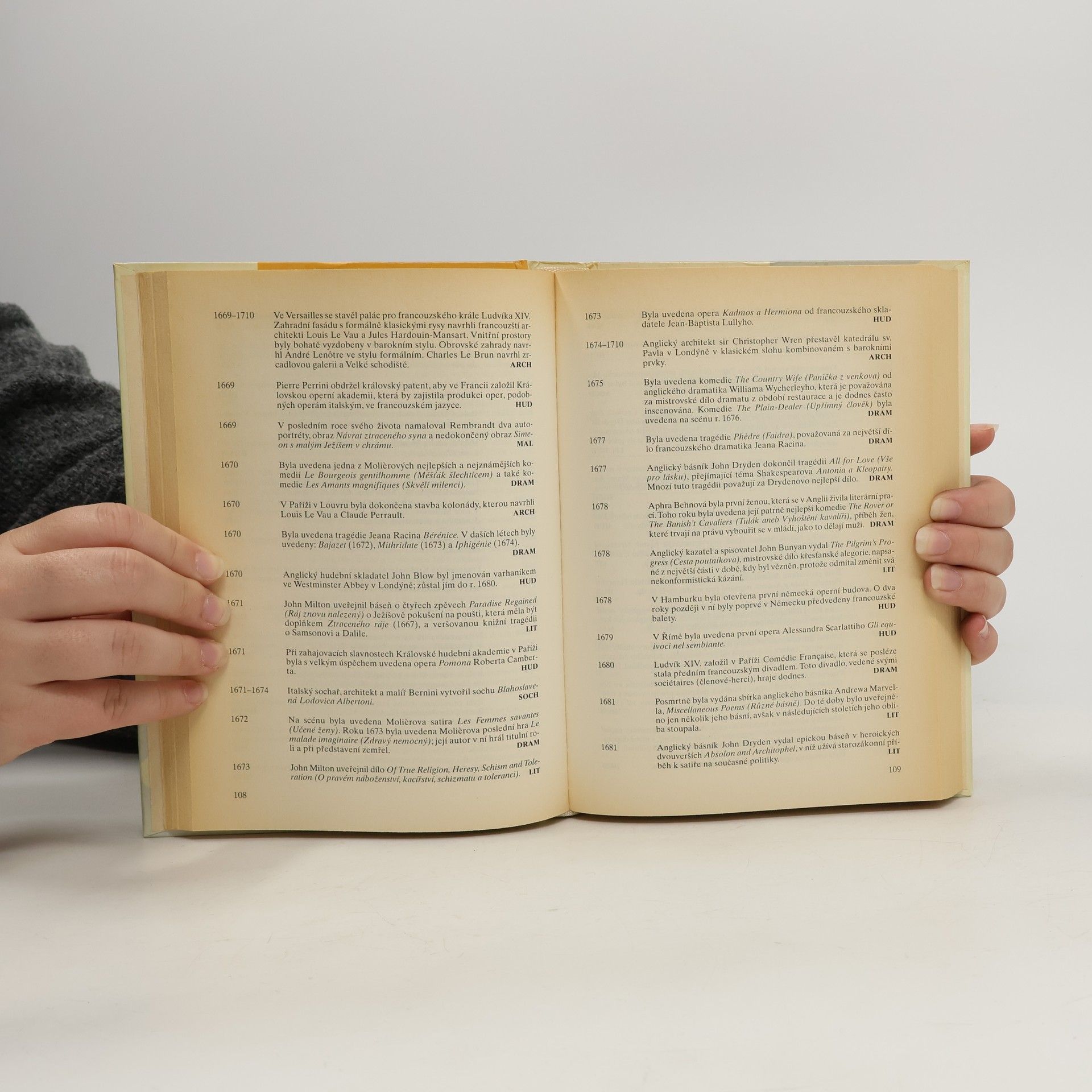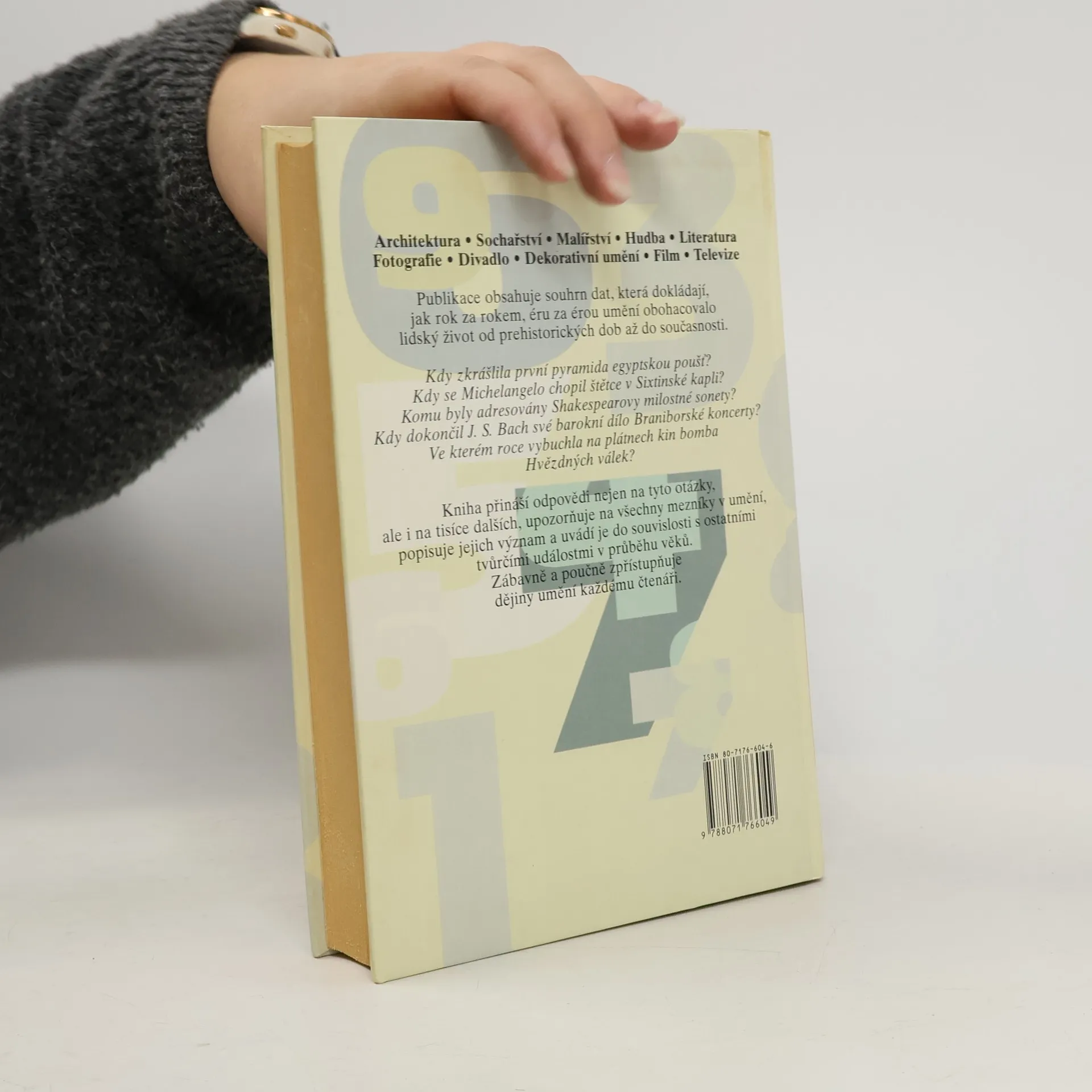 Užitečná kniha, která obsahuje chronologický souhrn dat, která dokládají, jak rok za rokem, éru za érou, styl za stylem, umění obohacovalo lidský život od prehistorických dob až do současnosti. Kniha přináší odpovědi na tisíce otázek, upozorňuje na mezníky umění a popisuje jeho význam. Zábavně a poučně zpřístupňuje dějiny umění každému čtenáři. Architektura - Sochařství - Malířství - Hudba - Literatura - Fotografie - Divadlo - Dekorativní umění - Film - Televize.
