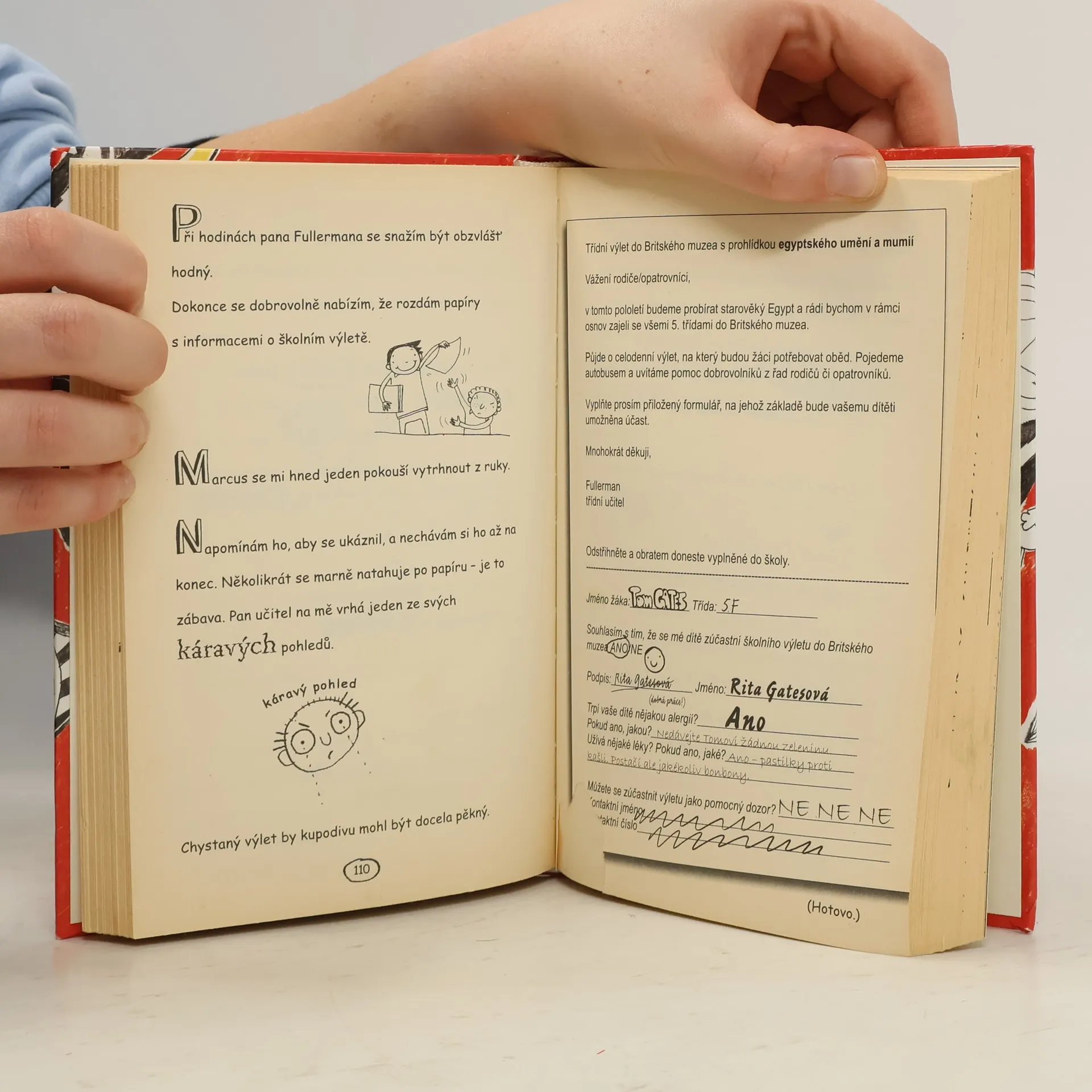 Nečtěte to, jestli jste… 1. moje nevrlá sestra Delia (grrr) 2. Marcus Meldrew (což je idiot) 3. paní Worthingtonová, která má knír (je těžké na něj NEZÍRAT) Jmenuju se Tom Gates. Když mě učitelé zrovna nesledujou slídivým pohledem, baví mě kreslit obrázky a vymýšlet, jak bych mohl co nejvíc lézt na nervy Delii. Učitelé si o mně myslí, že neudržím pozornost a že mi "chybí soustředění", ale to považuju za tvrdý odsudek, protože právě teď SOUSTŘEDĚNĚ dumám, kterou tyčinku bych měl sníst jako první… Hmm.