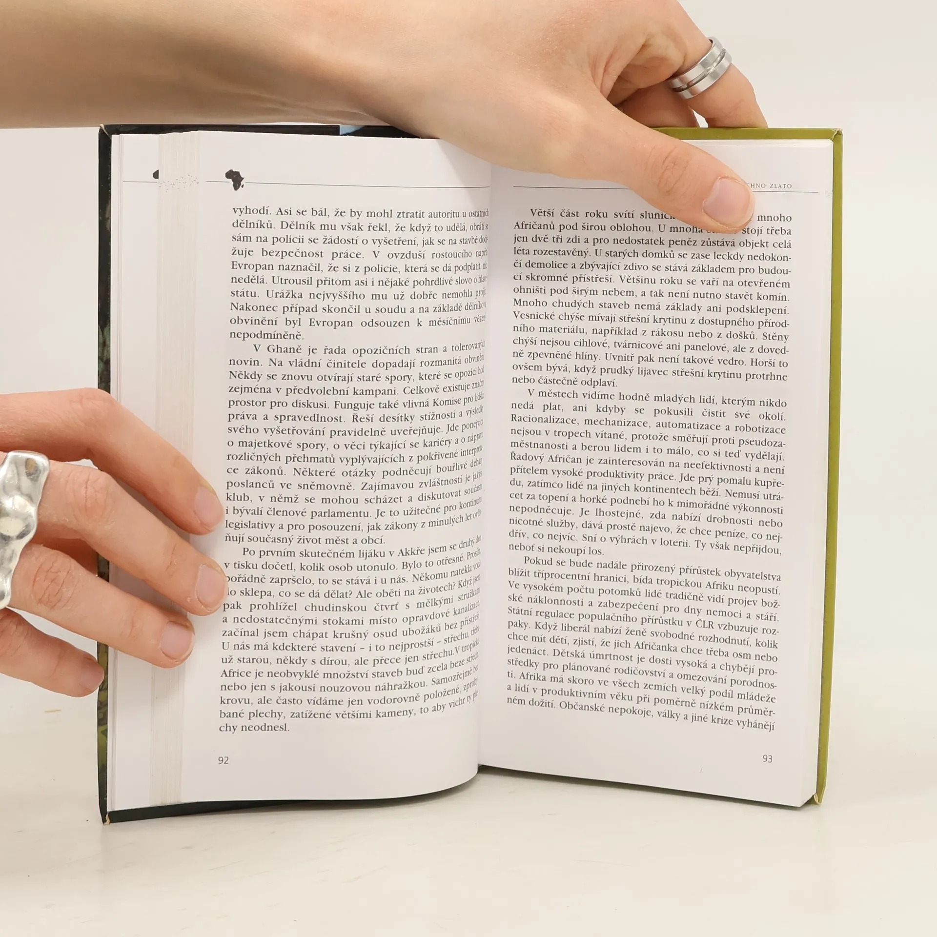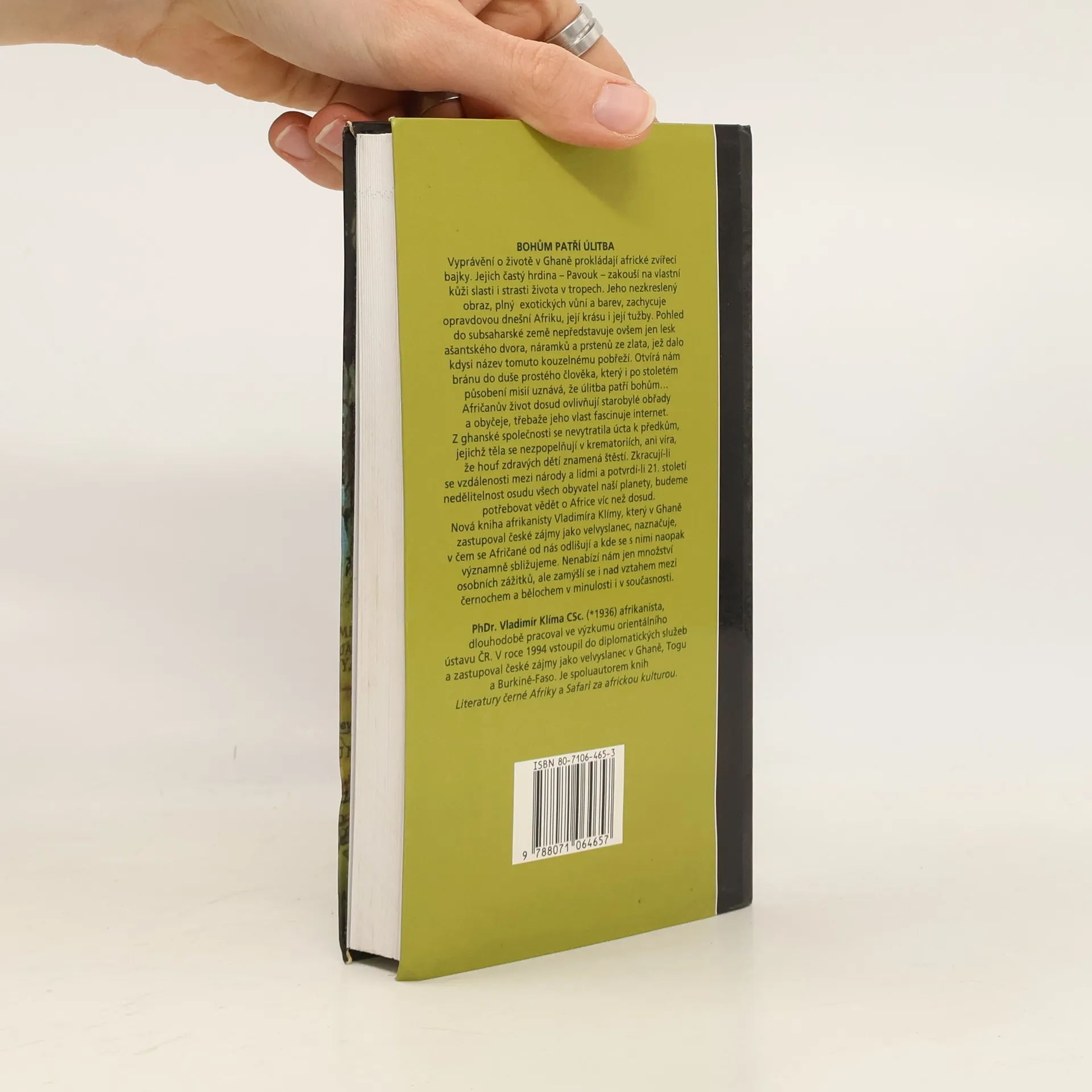 - diplomatem v západní Africe. Vyprávění o životě v Ghaně prokládají africké zvířecí bajky. Jejich častý hrdina - Pavouk - zakouší na vlastní kůži slasti i strasti života v tropech. Jeho nezkreslený obraz, plný exotických vůní a barev, zachycuje opravdovou dnešní Afriku, její krásu i tužby. Pohled do subsaharské země nepředstavuje ovšem jen lesk ašantského dvora, náramků a prstenů ze zlata, jež dalo kdysi název tomuto kouzelnému pobřeží. Otvírá nám bránu do duše prostého člověka, který i po stoletém působení misií uznává, že úlitba patří bohům... Kniha afrikanisty Vladimíra Klímy, který v Ghaně zastupoval české zájmy jako velvyslanec, naznačuje v čem se Afričané od nás odlišují a kde se s nimi naopak významně sbližujeme.