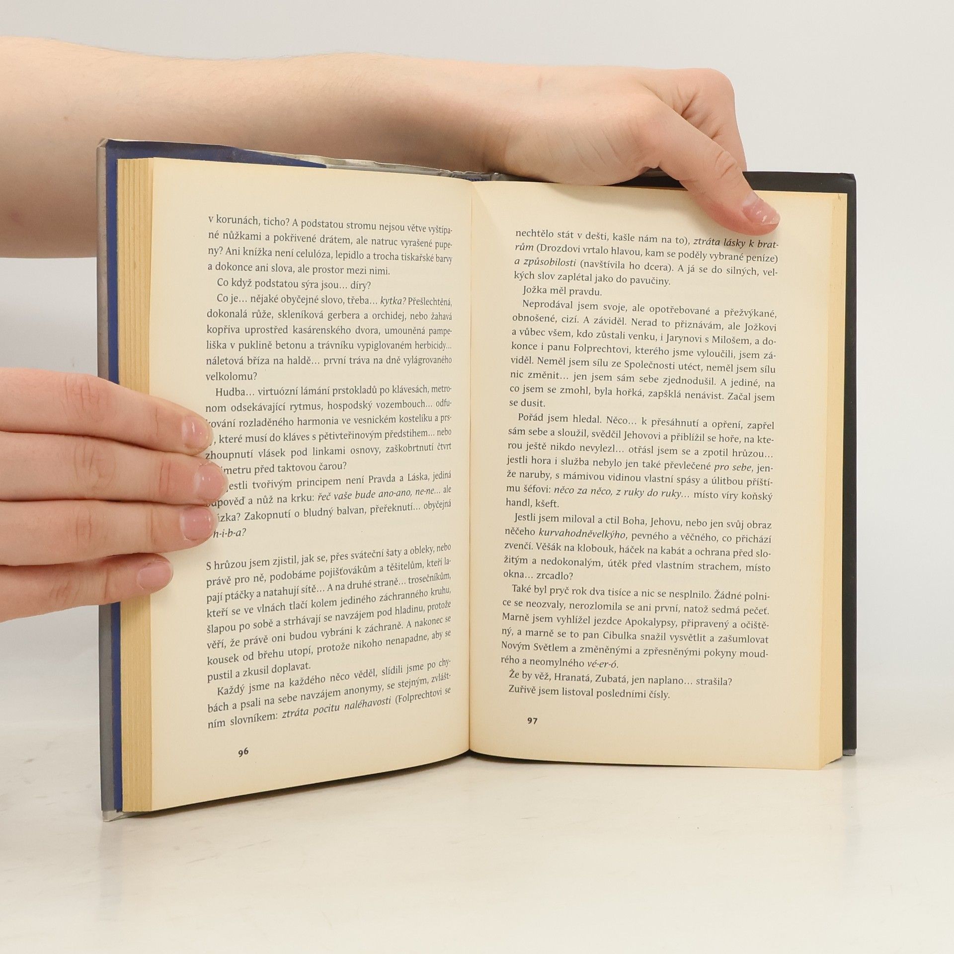 Vypravěč románu je typickým nehrdinou. Žije ve fungující rodině, má dobře placenou práci a volný čas tráví lezením po horách nebo v hospodě u piva. Brzy mu však připadá, že rodinný život a práce uzurpují příliš mnoho jeho času a myšlenek, přitom však nenaplňují jeho život hlubším smyslem. Zpočátku uniká s kamarády do hor, posléze stále častěji do hospody. Jeho alkoholické jízdy na malém městě budí čím dál větší pohoršení a končí vyhazovem z práce, rozpadem rodiny a ústavní léčbou. Pak se za plotem jeho domu objeví Svědci Jehovi, aby dali jeho životu nový smysl...