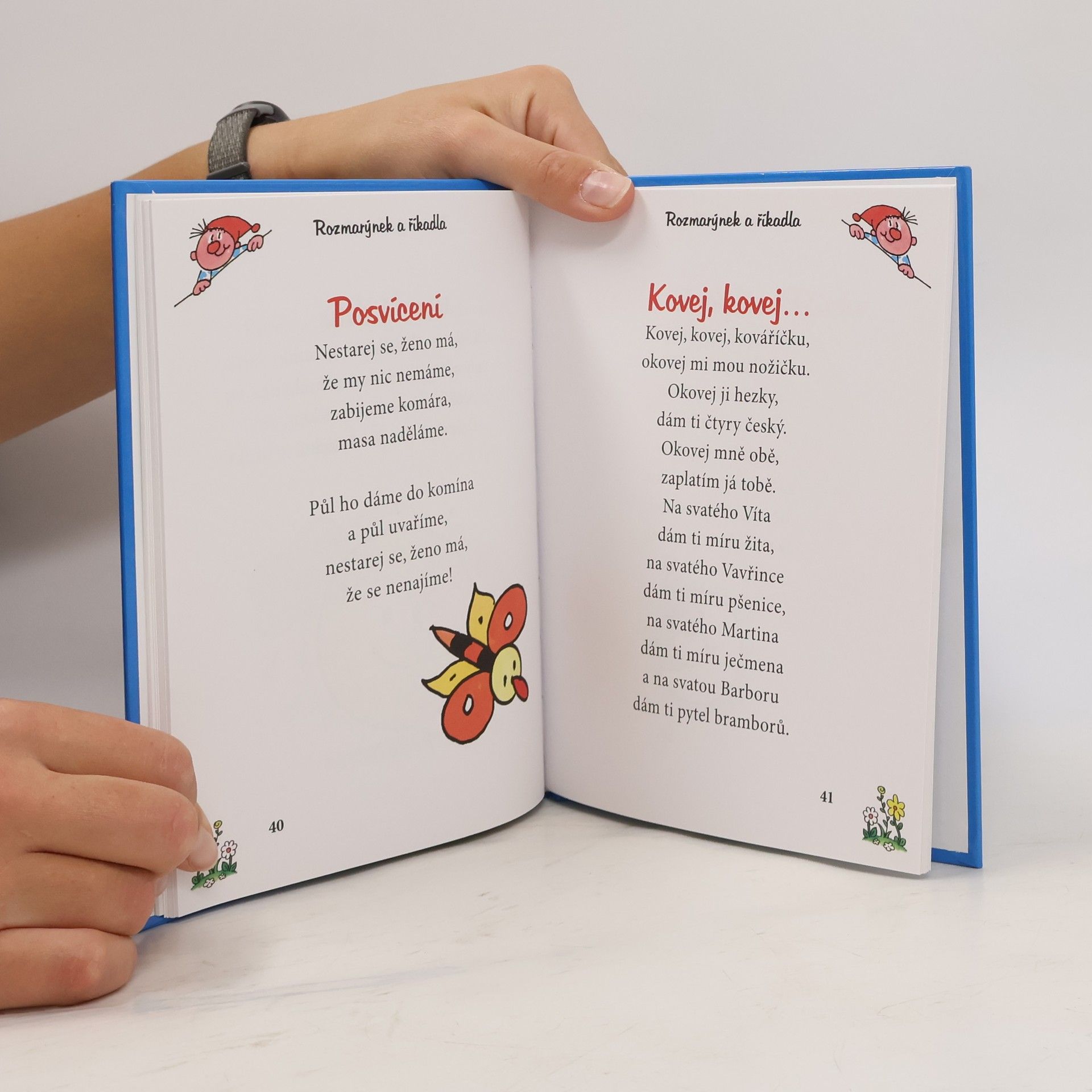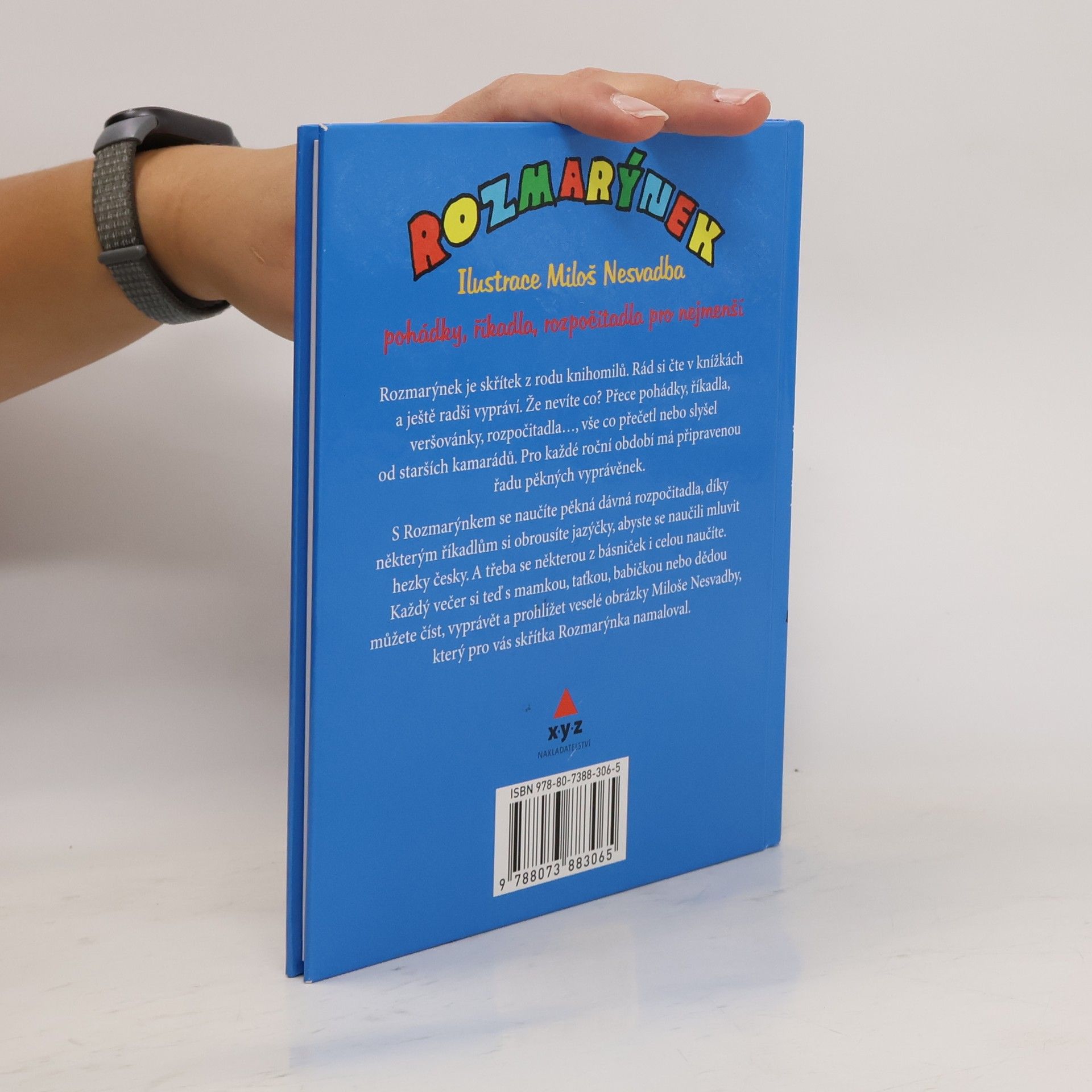 Pohádky, říkadla, rozpočitadla pro nejmenší čtenáře i jejich rodiče. Rozmarýnek je malý, neposedný skřítek, který dětem přináší veselé pohádky, svižná rozpočitadla a spoustu říkanek a veselých básniček. Je i pomocníčkem rodičů, kteří nějaký ten verš třeba už pozapomněli a ne a ne si vzpomenout. Co on vám už přečetl pohádek a bájí. Nevěřili byste, kolik básniček, říkánek, rozpočitadel a hádanek tenhle malý klučina zná. Protože není lakomý, tak se s vámi o některé příběhy podělí. Bude vám vyprávět pohádky dlouhé i docela kraťoulinké, připomene polozapomenuté básničky a naučí i řadu veselých rozpočitadel. To abyste na jaře, až si budete s ostatními dětmi hrát venku třeba na babu, se rychle dozvěděli, kdo půjde pikat. Rozmarýnek – kamarád – pohádky vypráví rád! S nimi také básničky, pro kluky i holčičky. Máma, táta, děda, babi s Rozmarýnkem ví si rady! Knížku jenom otevřou – a už jenom čtou a čtou…