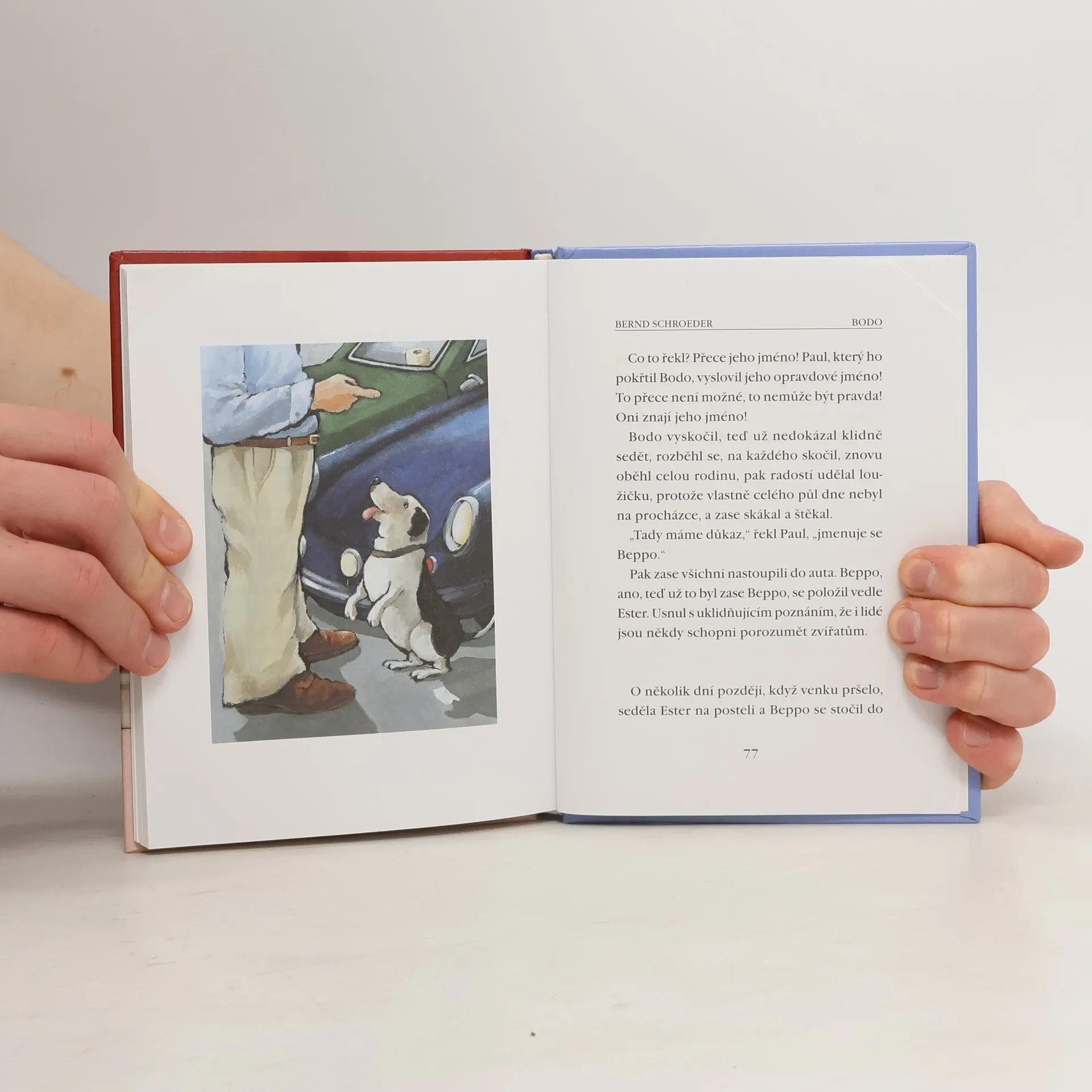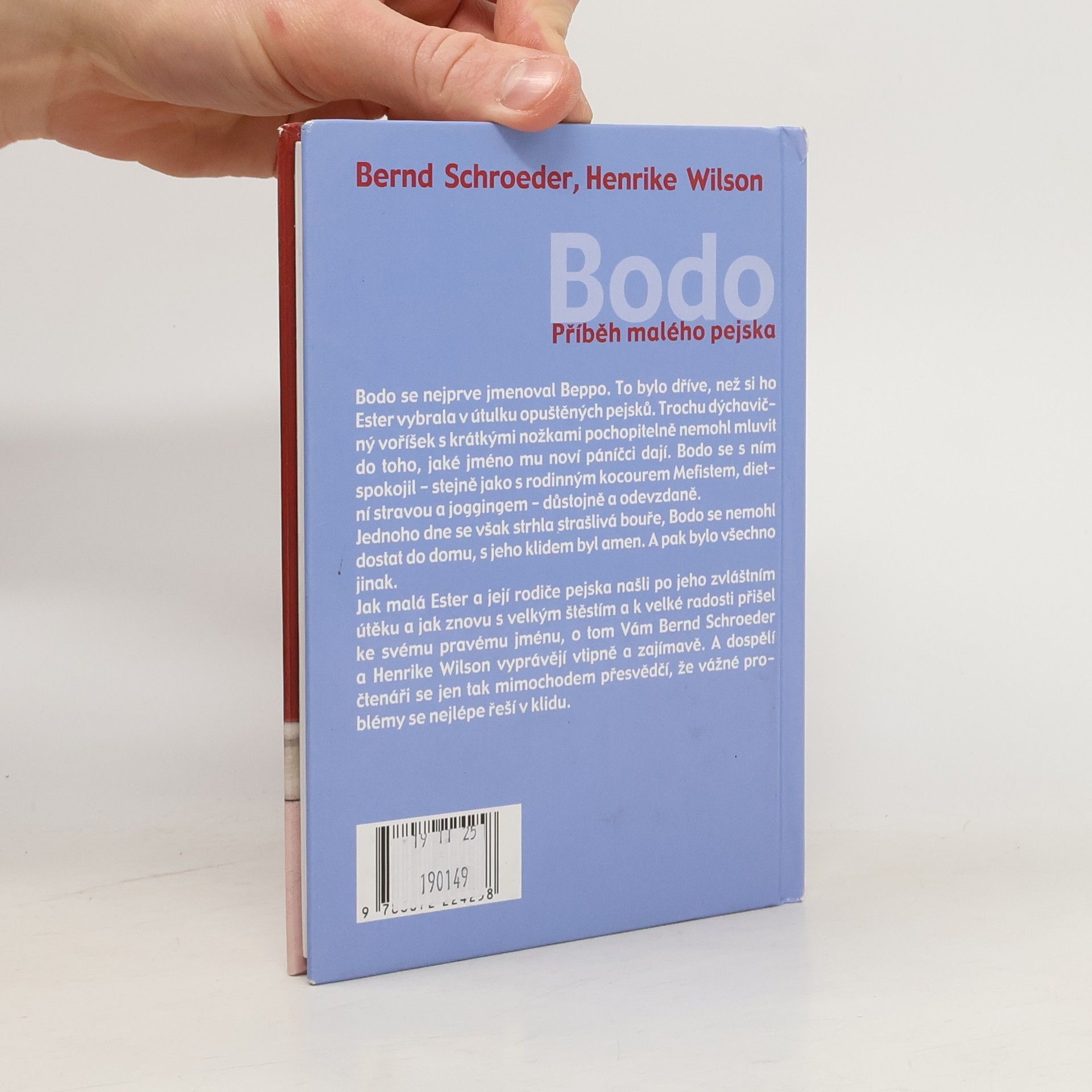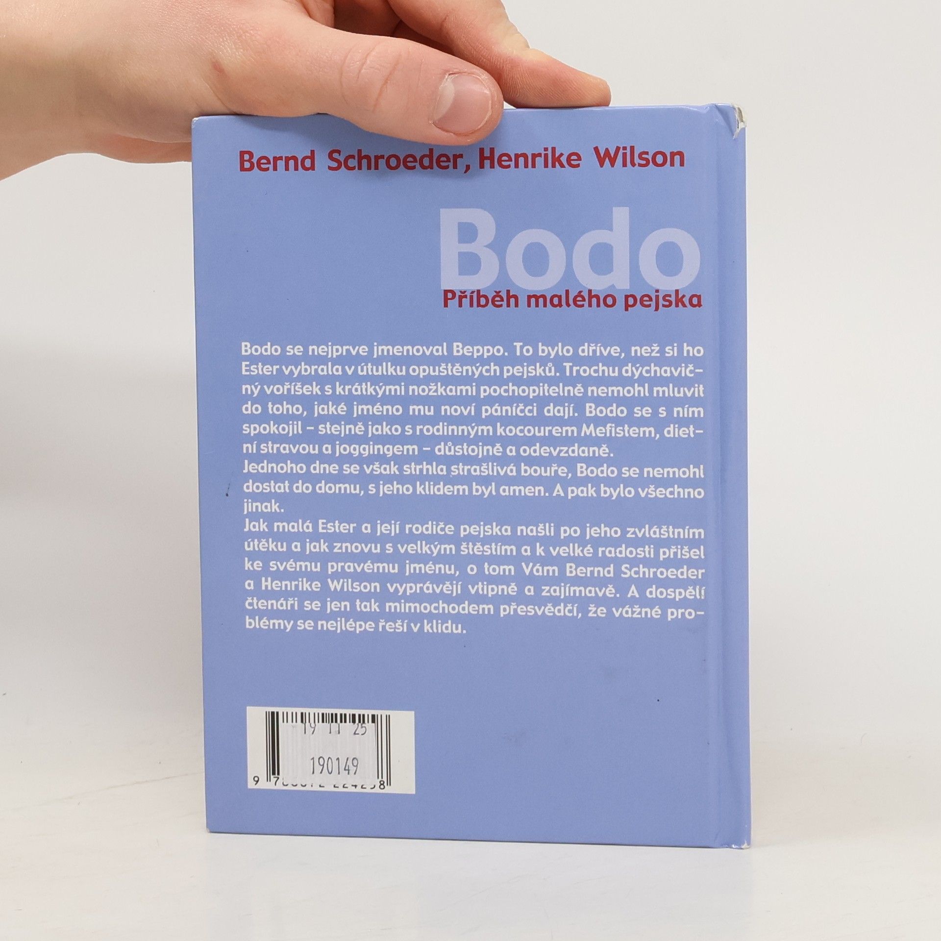 Bodo se nejprve jmenoval Beppo. To bylo dříve, než si ho Ester vybrala v útulku opuštěných pejska. Trochu dýchavičný voříšek s krátkými nožkami pochopitelně nemohl mluvit do toho, jaké jméno mu noví páníčci dají. Bodo se s ním spokojil - stejně jako s rodinným kocourem Mefistem, dietní stravou a joggingem - důstojně a odevzdaně. Jednoho dne se však strhla strašlivá bouře, Bodo se nemohl dostat do domu, s jeho klidem byl amen. A pak bylo všechno jinak. Jak malá Ester a její rodiče pejska našli po jeho zvláštním útěku a jak znovu s velkým štěstím a k velké radosti přišel ke svému pravému jménu, o tom Vám Bernd Schroeder a Henrike Wilson vyprávějí vtipně a zajímavě. A dospělí čtenáři se jen tak mimochodem přesvědčí, že vážné problémy se nejlépe řeší v klidu.