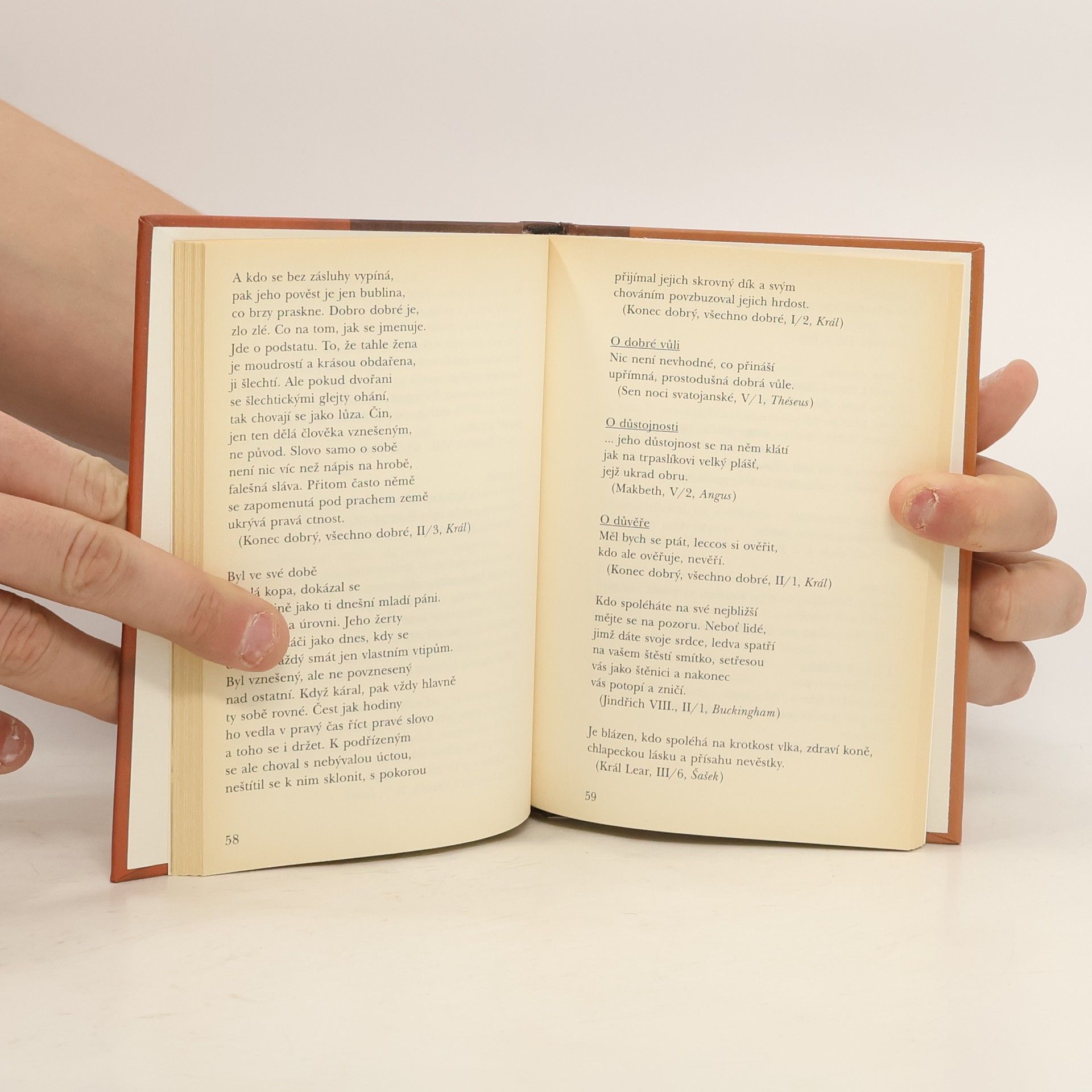 Kniha citátů z díla největšího světového dramatika, jehož hry, ať už tragédie nebo komedie, se stále objevují v repertoáru mnoha divadel celého světa a setkávají se s nadšeným přijetím diváků i čtenářů. Shakespearovy aforismy vybrané do této knihy zachycují jenom zlomek z jeho rozsáhlé tvorby, přesto pro čtenáře budou jistě podnětem k zamyšlení i úsměvu. Z českých překladů vybrala a uspořádala Eva Loubová.