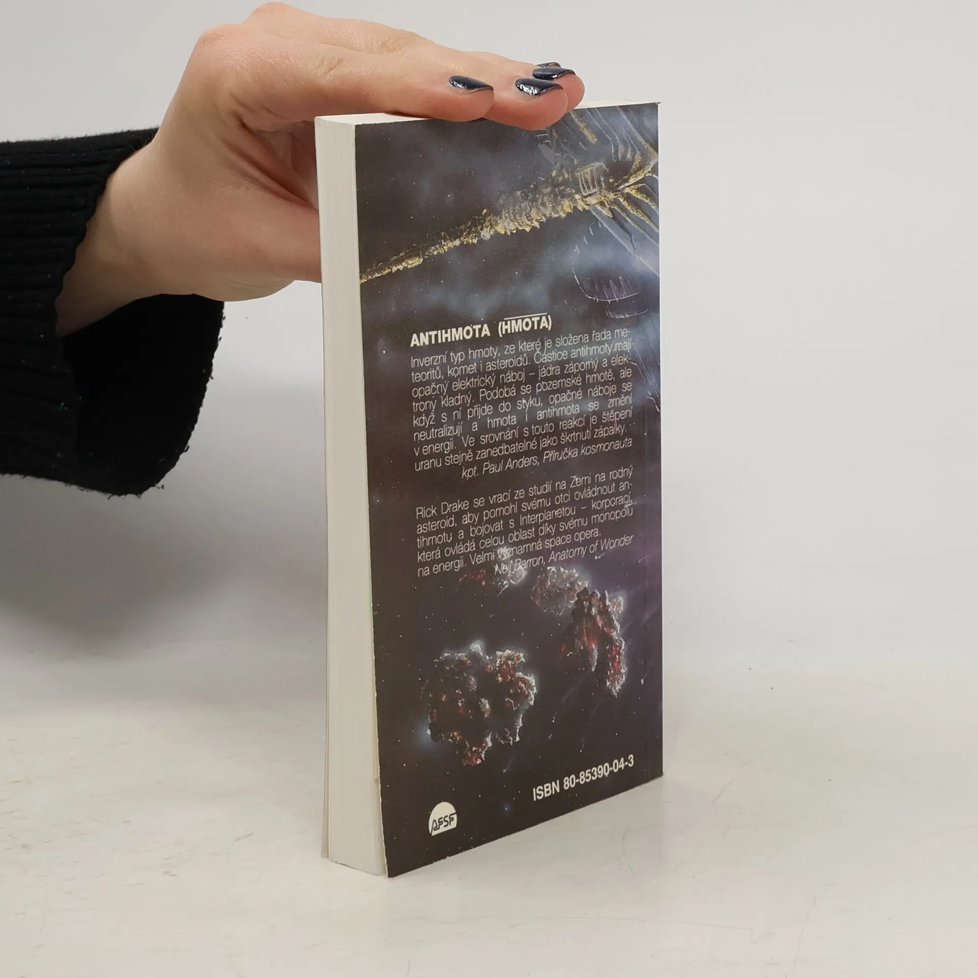 Antihmota: Inverzní typ hmoty, ze které je složena řada meteoritů, komet i asteroidů. Částice antihmoty mají opačný elektrický náboj – jádra záporný a elektrony kladný. Podobá se pozemské hmotě, ale když s ní přijde do styku, opačné náboje se neutralizují a hmota i antihmota se změní v energii. Ve srovnání s touto reakcí je štěpení uranu stejně zanedbatelné jako škrtnutí zápalky. kpt. Paul Anders, Příručka kosmonauta Rick Drake se vrací ze studií na Zemi na rodný asteroid, aby pomohl svému otci ovládnout antihmotu a bojovat s Interplanetou – korporací, která ovládá celou oblast díky svému monopolu na energii. Velmi významná space opera. Neil Barron, Anatomy of Wonder... celý text