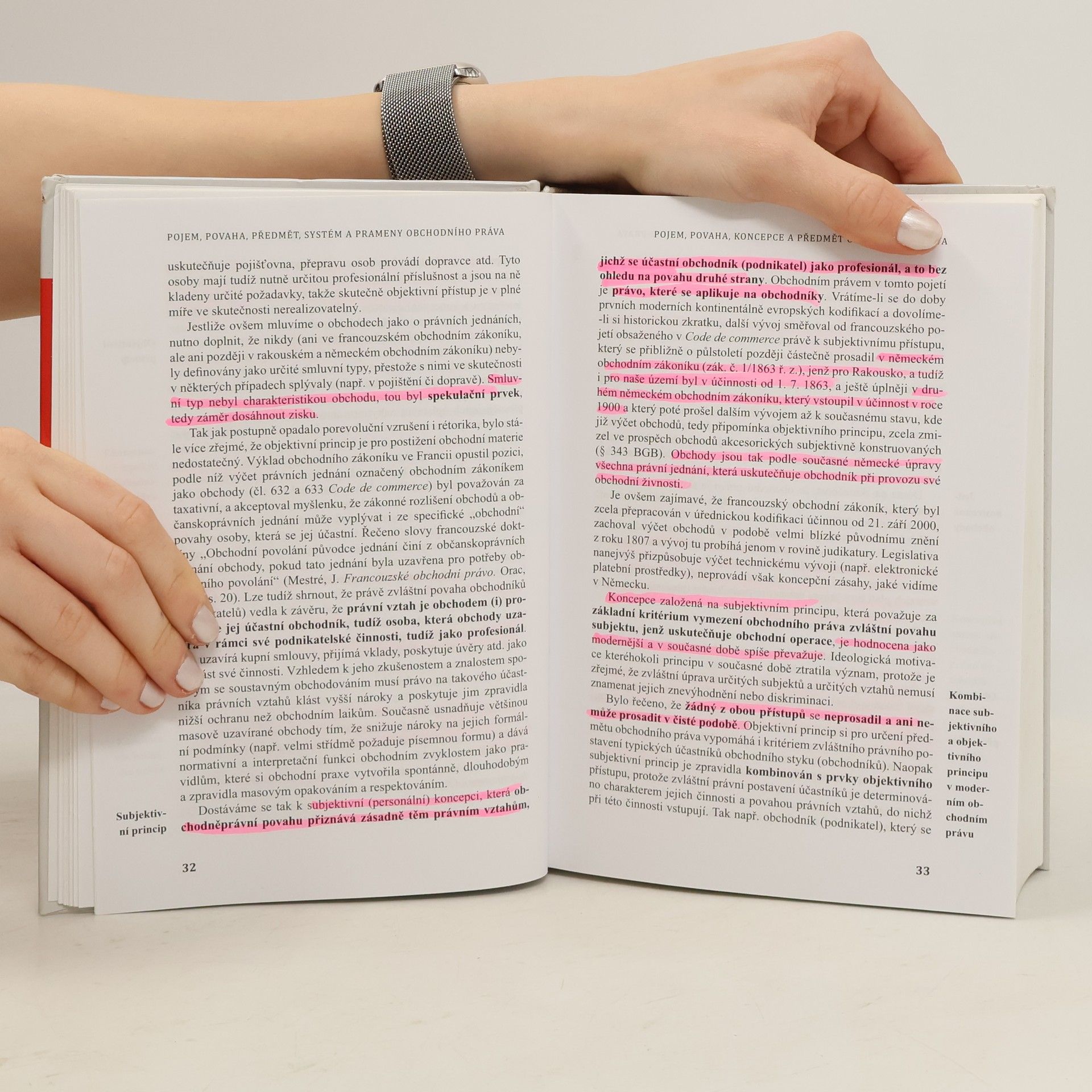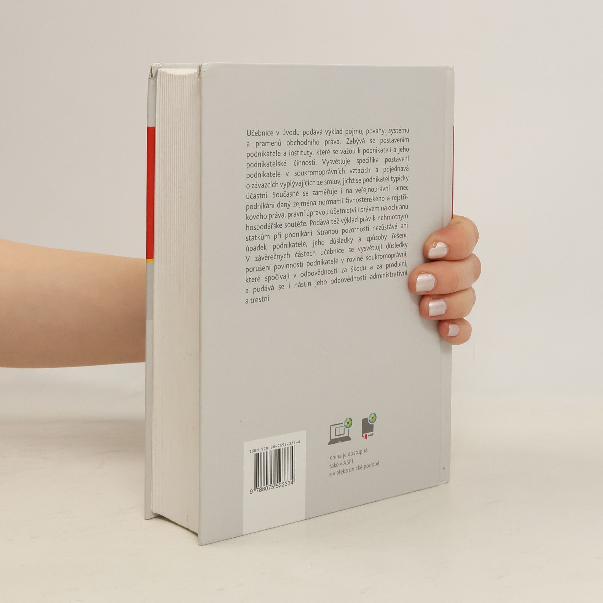 Učebnice v úvodu podává výklad pojmu, povahy, systému a pramenů obchodního práva. Zabývá se postavením podnikatele a instituty, které se vážou k podnikateli a jeho podnikatelské činnosti. Vysvětluje specifika postavení podnikatele v soukromoprávních vztazích a pojednává o závazcích vyplývajících ze smluv, jichž se podnikatel typicky účastní. Současně se zaměřuje i na veřejnoprávní rámec podnikání daný zejména normami živnostenského a rejstříkového práva, právní úpravou účetnictví i právem na ochranu hospodářské soutěže. Podává též výklad práv k nehmotným statkům při podnikání. Stranou pozornosti nezůstává ani úpadek podnikatele, jeho důsledky a způsoby řešení. V závěrečných částech učebnice se vysvětlují důsledky porušení povinností podnikatele v rovině soukromoprávní, které spočívají v odpovědnosti za škodu a za prodlení, a podává se i nástin jeho odpovědnosti administrativní a trestní.